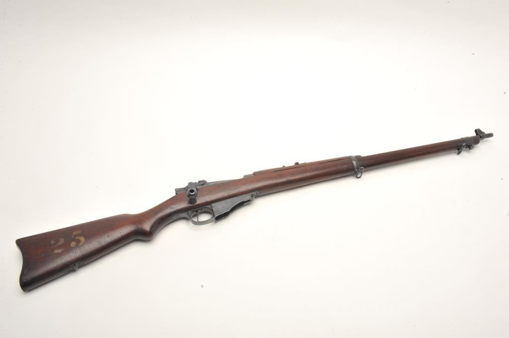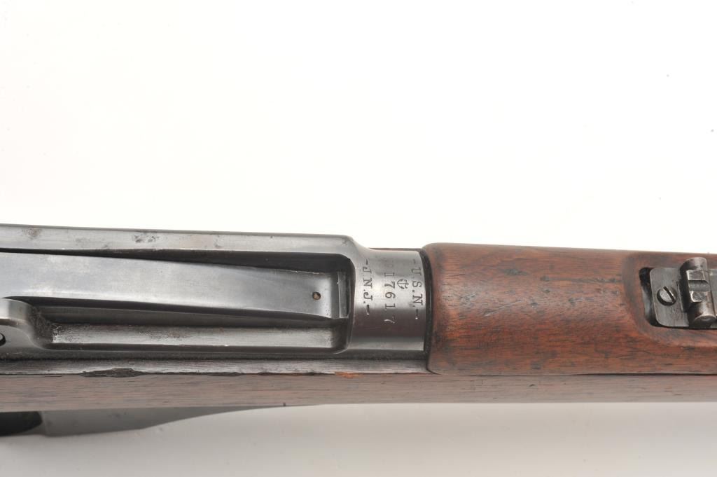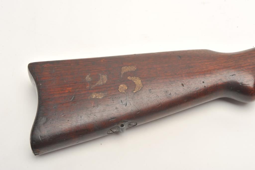 Winchester-Lee straight pull U.S.N.-marked musket, 6mm caliber, 28” barrel, military blue finish, full length wood stock with “25” painted on the right side of the butt stock, S/N 17617 (U.S.N./J.N.J markings on top ofreceiver with S/N and naval anchor). This gun is in overall very good + condition showing the majority of its original finish to metal surfaces, crisp action, near fine bore, sharp markings and overall good to very good wood. (C&R/PPT). Est.: $800-$1,600.