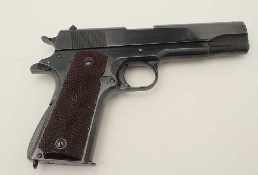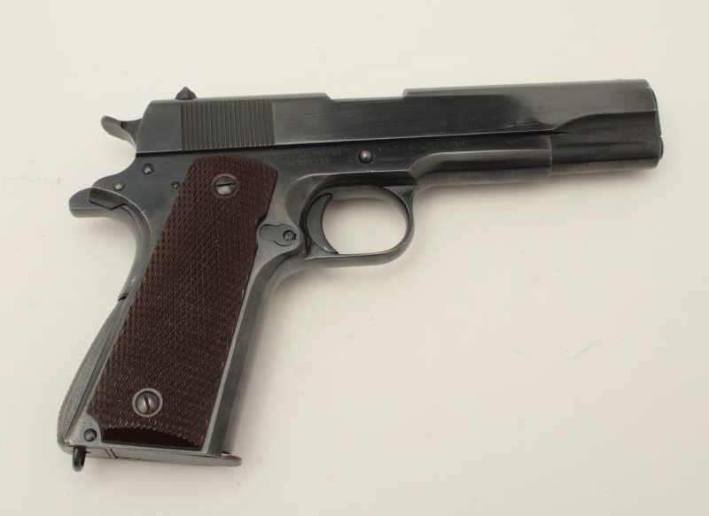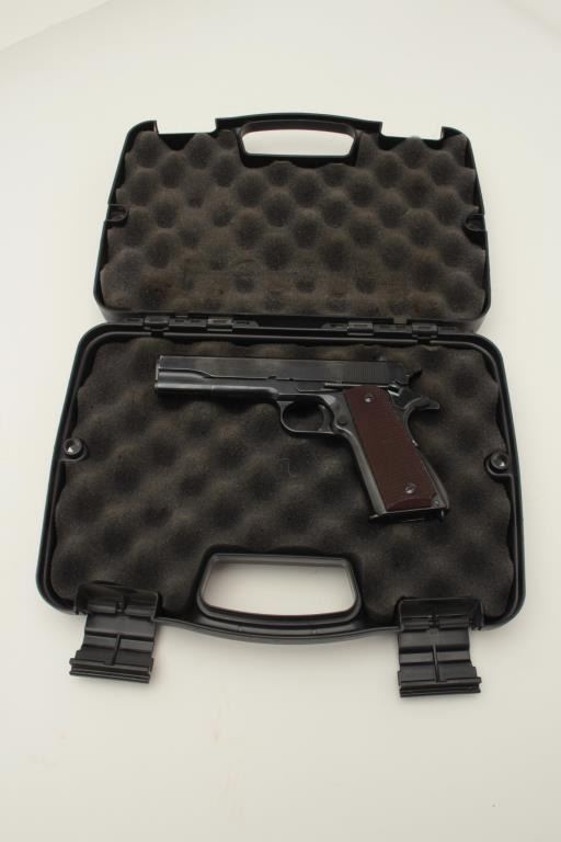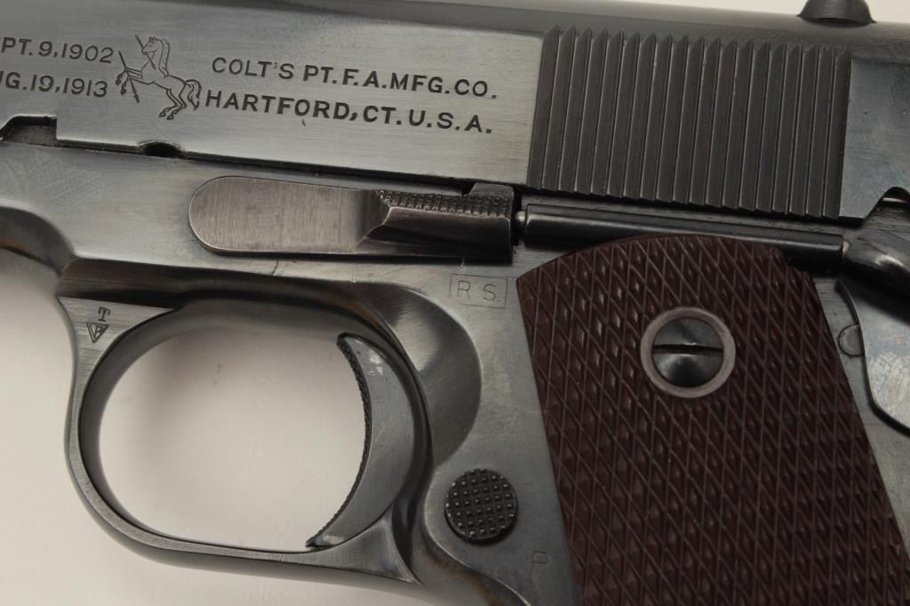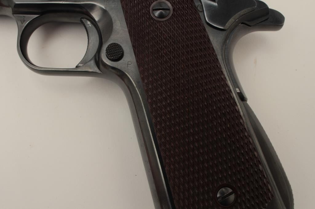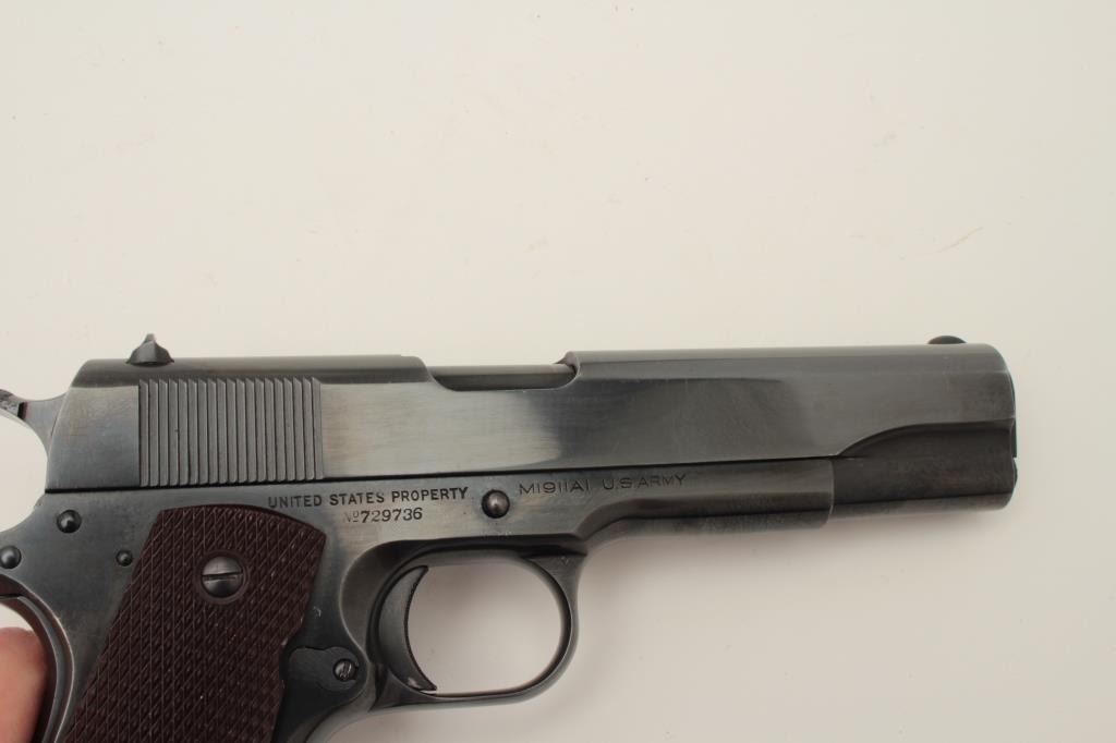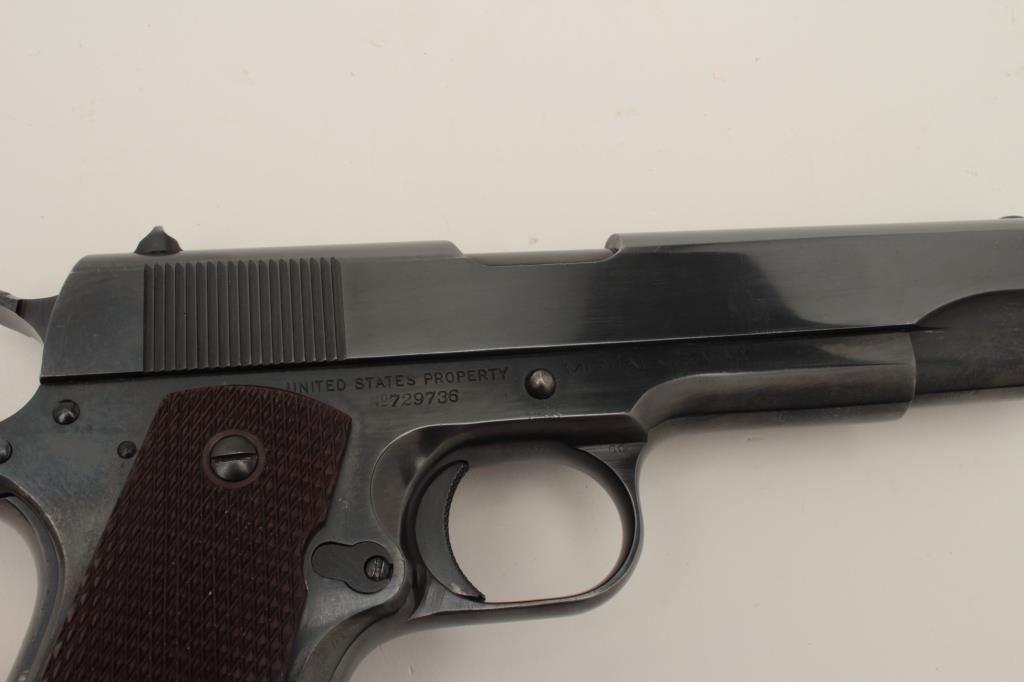 Colt U.S. Property Model 1911-A1 semi-automatic pistol, .45 caliber, 5” barrel, blued finish, with desirable “R.S.” inspection marking, checkered brown grips, S/N 729736, with extra magazine and extradiamond checkered wood grips. This pistol is in overall excellent condition displaying approximately 99% blued finish, sharp markings, excellent bore, crisp action and grips. (C&R/PPT). Est.:$2,500-$5,000.