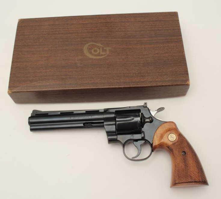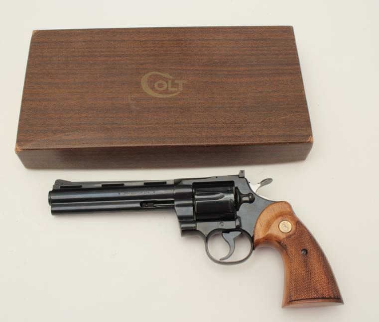 Desirable Colt Python Model DA revolver, .357 Magnum caliber, 6” ventilated rib barrel, blued finish, checkered wood medallion combat grips, S/N 85726 (ca. 1968), in overall excellent condition showing little handling. Accompanied by a Colt factory wood grain cardboard box with correct end label. (Modern/PPT). Est.: $3,000-$6,000.