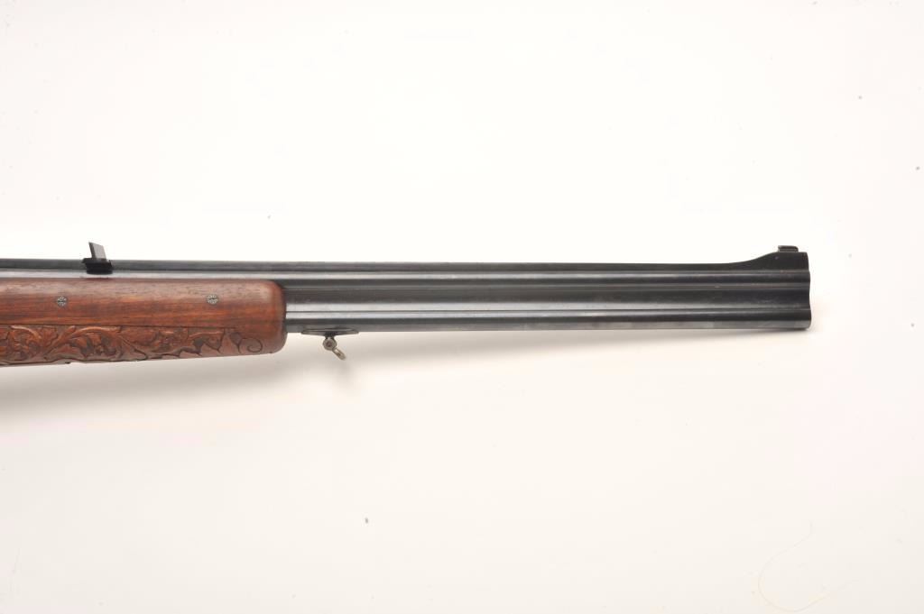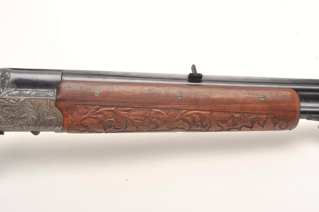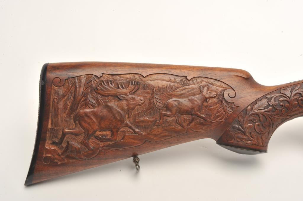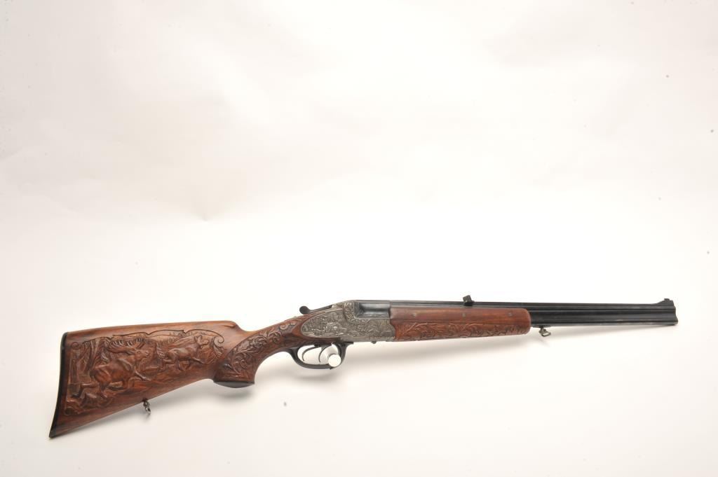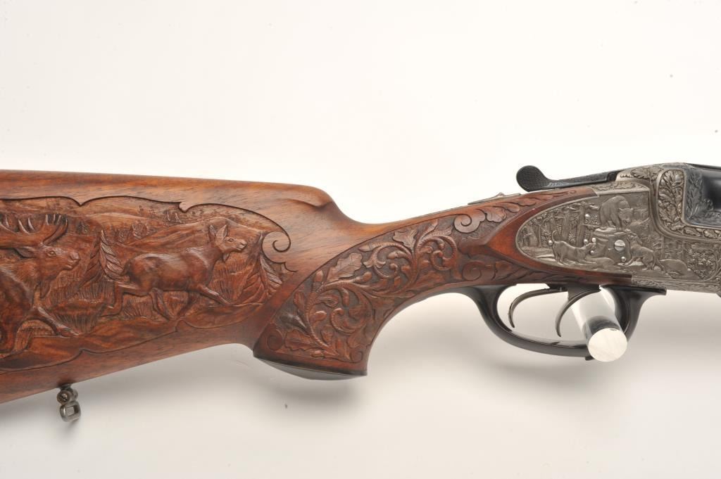 Deluxe high relief engraved Merkel O/U double rifle, .375 caliber, 24.5” blued barrels, raised carved finely grained wood stocks, auto ejectors, double triggers, horn trigger guard and pistol grip cap plus checkered horn butt plate, no visible S/N, in overall fine condition displaying the majority of its blued finish to the barrel assembly, fine Germanic style floral engraving to the receiver with beautiful game scenes on theleft and right sides of the receiver plus corresponding floral engraving to the breech end of the barrels; finely accomplished raised floral carvings to the forend and wrist area of the butt stock along with gamescene carvings present on both sides of the butt stock. The bores are fine, the actions crisp and the finely grained wood is also fine in condition. Appears to be of pre-war construction. An outstanding Merkel doublerifle that would be very expensive to replicate in today’s market. (C&R/PPT). Est.: $4,000-$8,000.