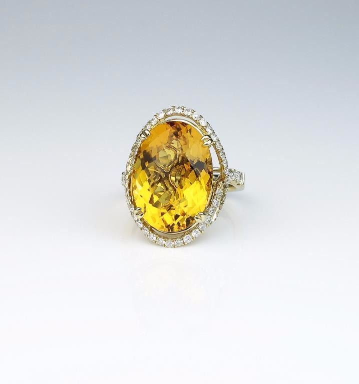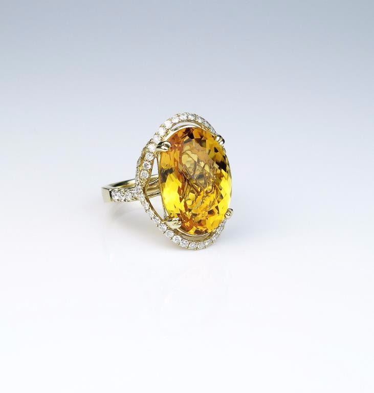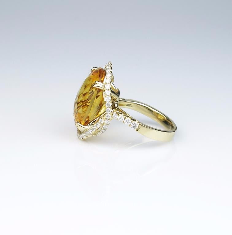 Spectacular ladies ring featuring a checkerboard cut Citrine weighing approx. 20.00 carats and micro set with over 56 round diamonds weighing approx. 1.00 carat of G-H colors and VS/SI clarity set in a 14 karatyellow gold designer setting. Retail $4,000-$6,000 Estimates $2,000-$3,000 Labor intensive