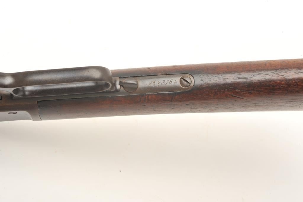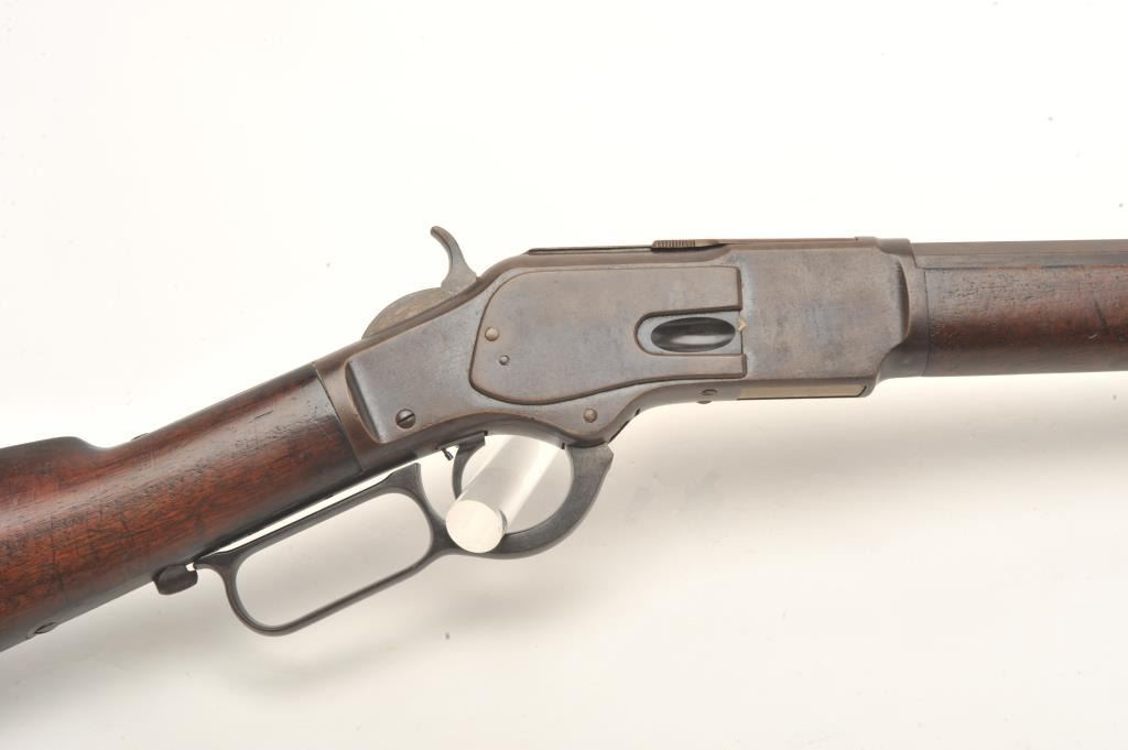 Winchester Model 1873 lever action rifle, .38 caliber, 26” octagon barrel, buckhorn rear sight, blade front sight, single set trigger working at time of description; blued finish, wood stocks, S/N 167316A, in overall verygood + condition displaying a plum brown patina with traces of original blued finish in protected areas, very good bore, crisp action and very good wood stocks. (Antique). Est.: $1,250-$2,500.
