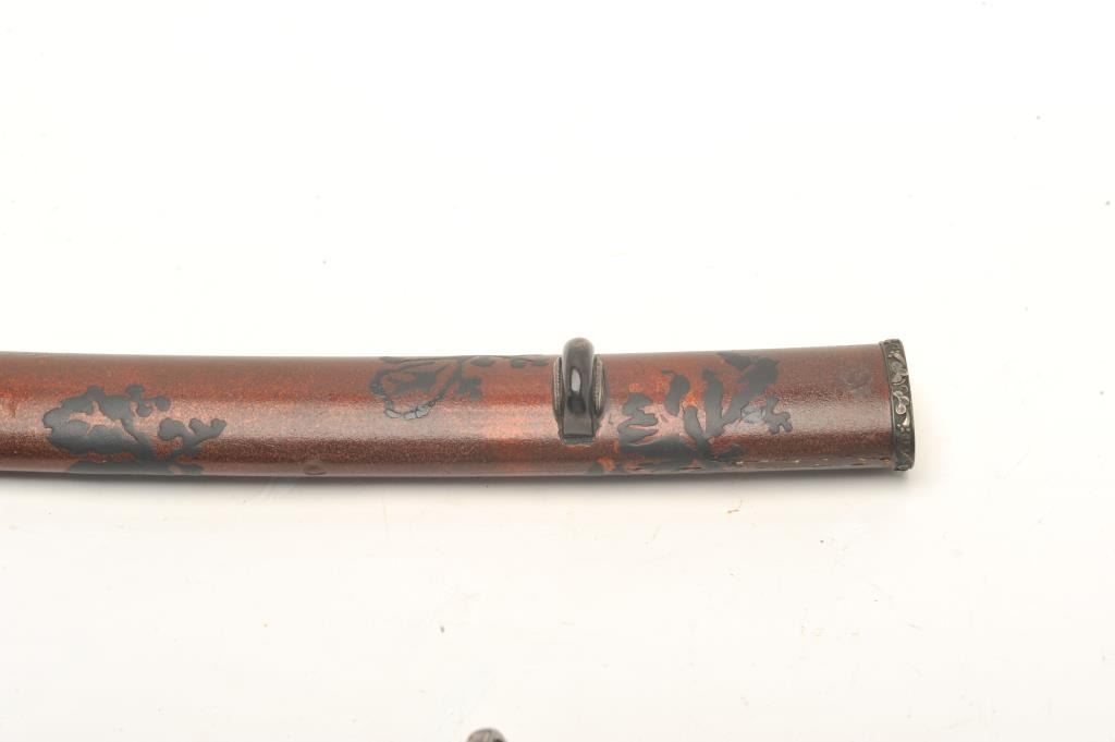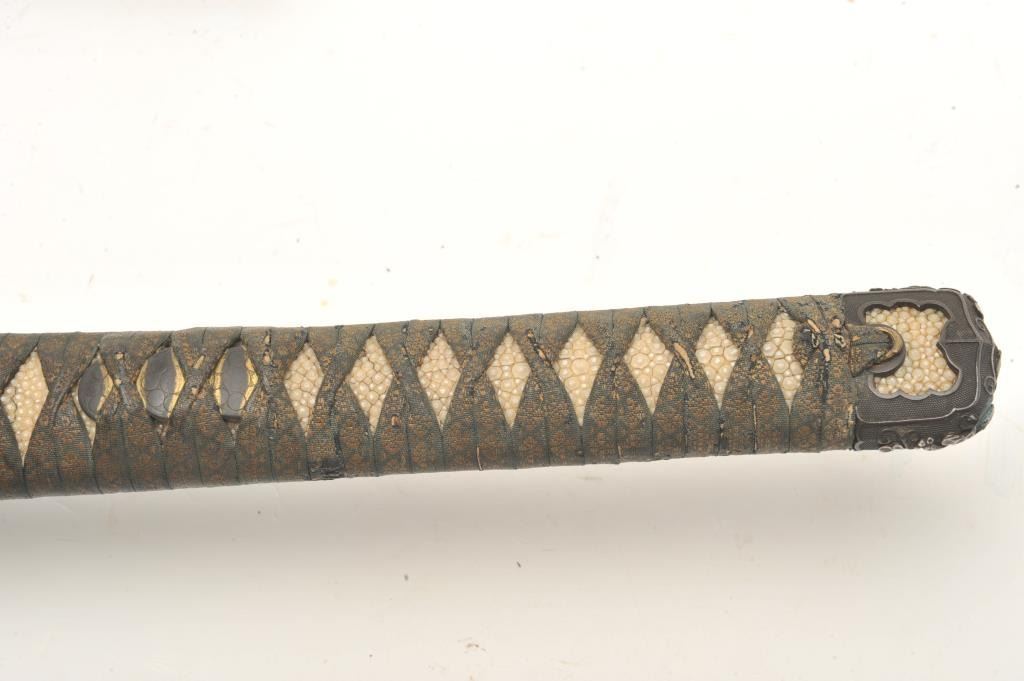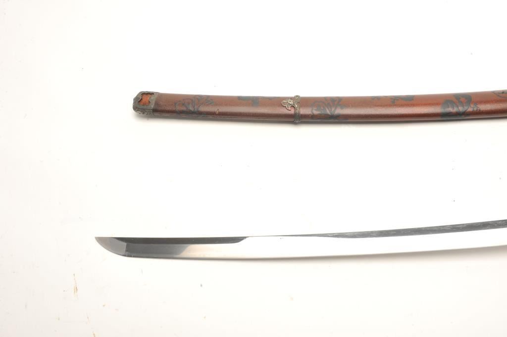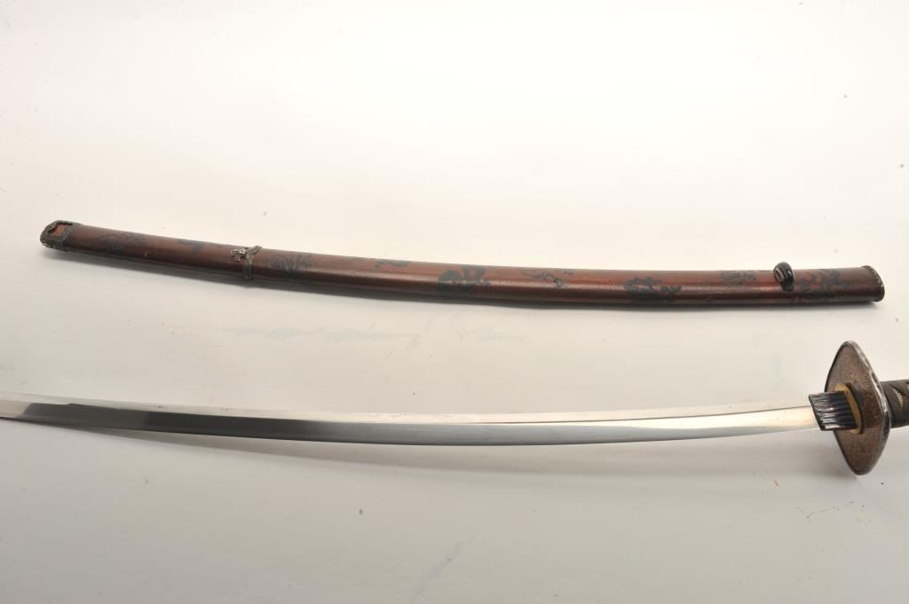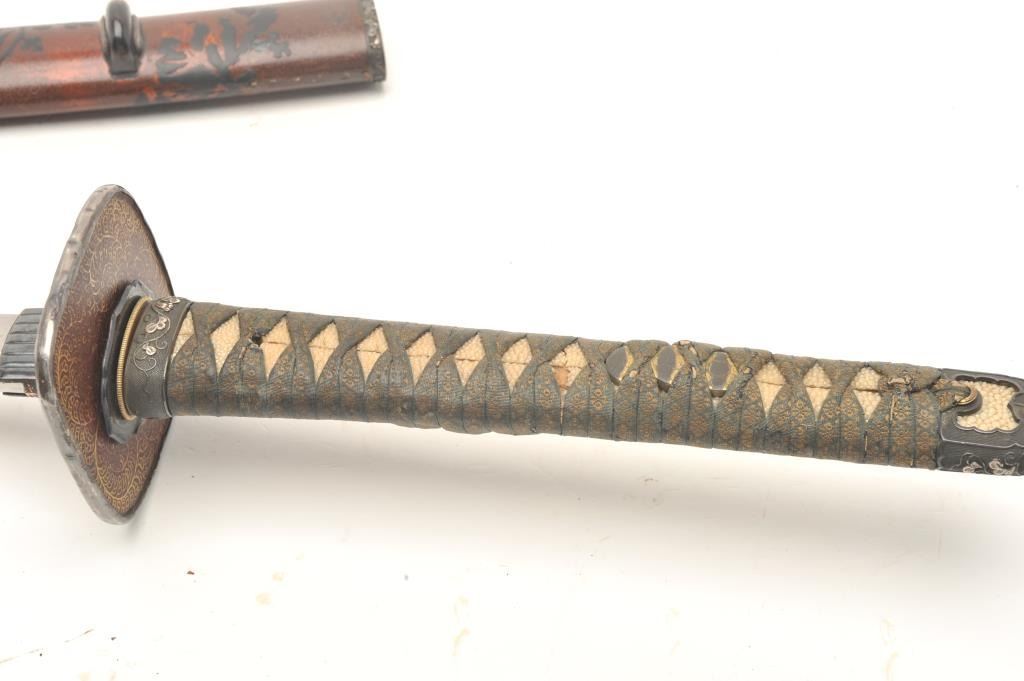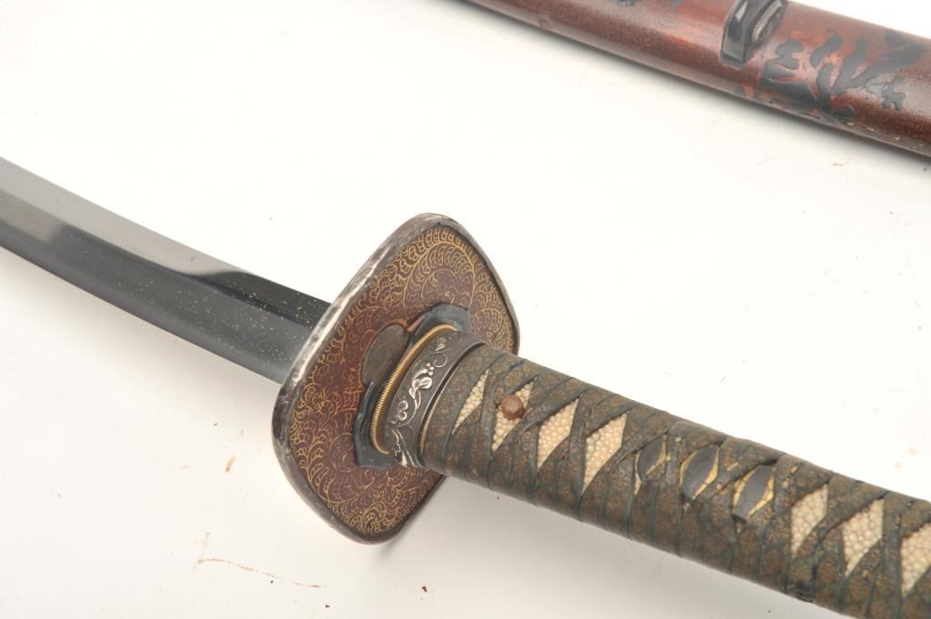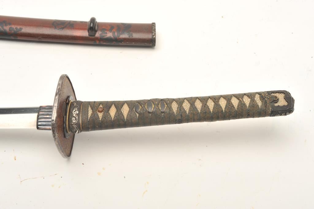 Full mounted Koto period katana (Long sword) in Mino school style and circa 1450-1500s with a 26 ½” blade. In near fine condition showing an old polish with just minor openings to the lamination and minorimperfections. Full temper visible around the tip and at least very good plus for its great age. Fine quality mountings with fancy decorated raised lacquer work scabbard ornate silver and soft metal mountings with fancydecorated tsuba. The mountings are for a samurai of rank and date 18th-19th century. The mountings are very good plus to almost fine. Rarely are early long swords found of this quality with exceptional mountings.Est.: $3,000-$6,000