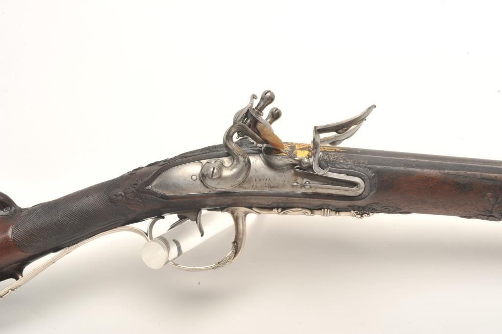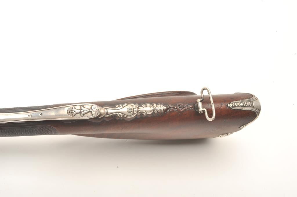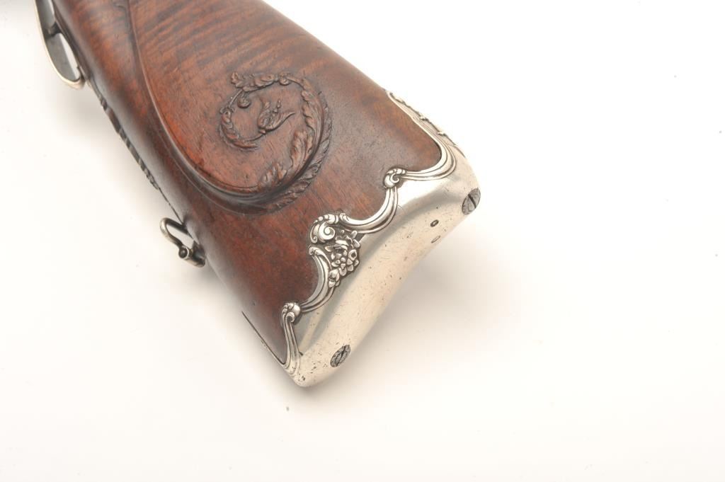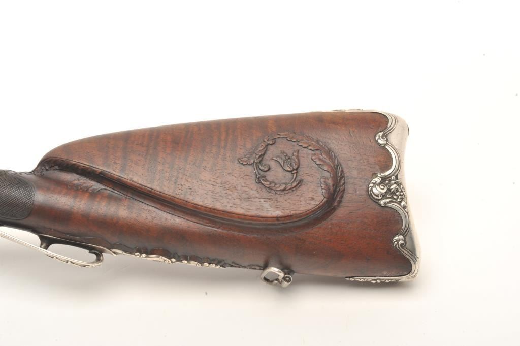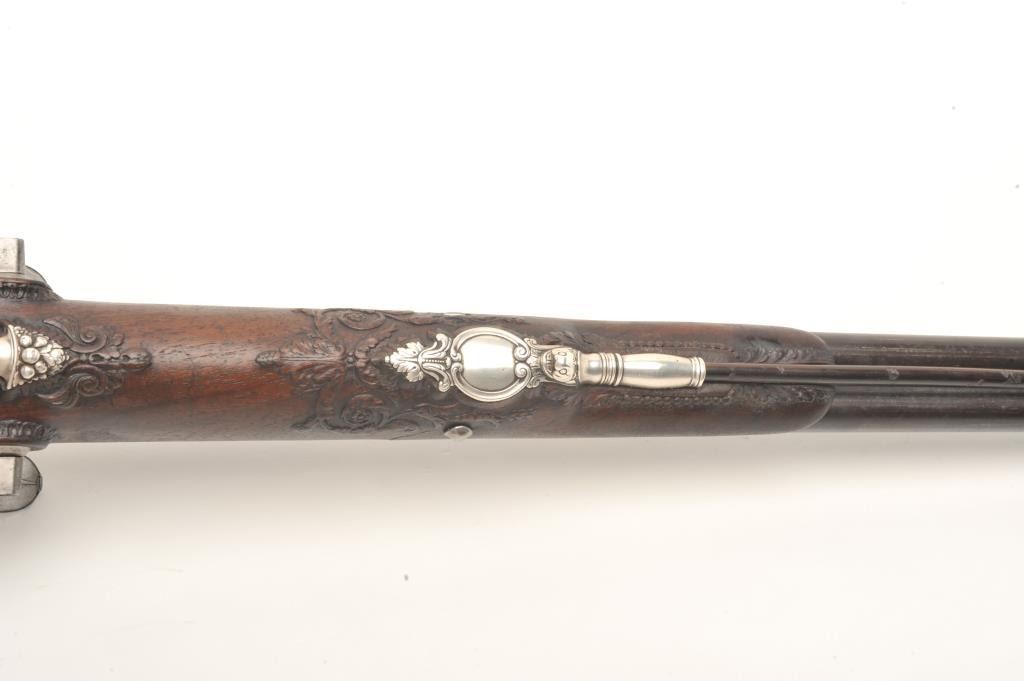 French late 18th century double flintlock shotgun signed “Simon A’ Paris” who held an appointment as maker to Royalty in the pre-revolutionary era. The gun shows fancy hallmarked silver mountings and the stock isfinely and ornately raised carved in floral motifs at the tang, cheek piece, fore end and surrounding the mountings. The barrel shows gold gilt on blue of which 80%-90% finish and gold gilt remains just toning naturally. The locks are original flint and show most gold lining in pans. Signed in script on both locks in fancy script. The stock is very good plus and has been expertly repaired at the wrist by master craftsman and we would nothave detected it but informed by our consignor of this $3,000 museum quality restoration. The tang shows an engraved portrait with in a sunburst which may indicate a descendent from the sun king or arelationship. Measures 46” overall with 30 ¾” barrels of 20GA smoothbore. A sophisticated and high quality double flintlock that may be researchable from engraved vignette on the tang. (Antique) Est.: $10,000-$20,000