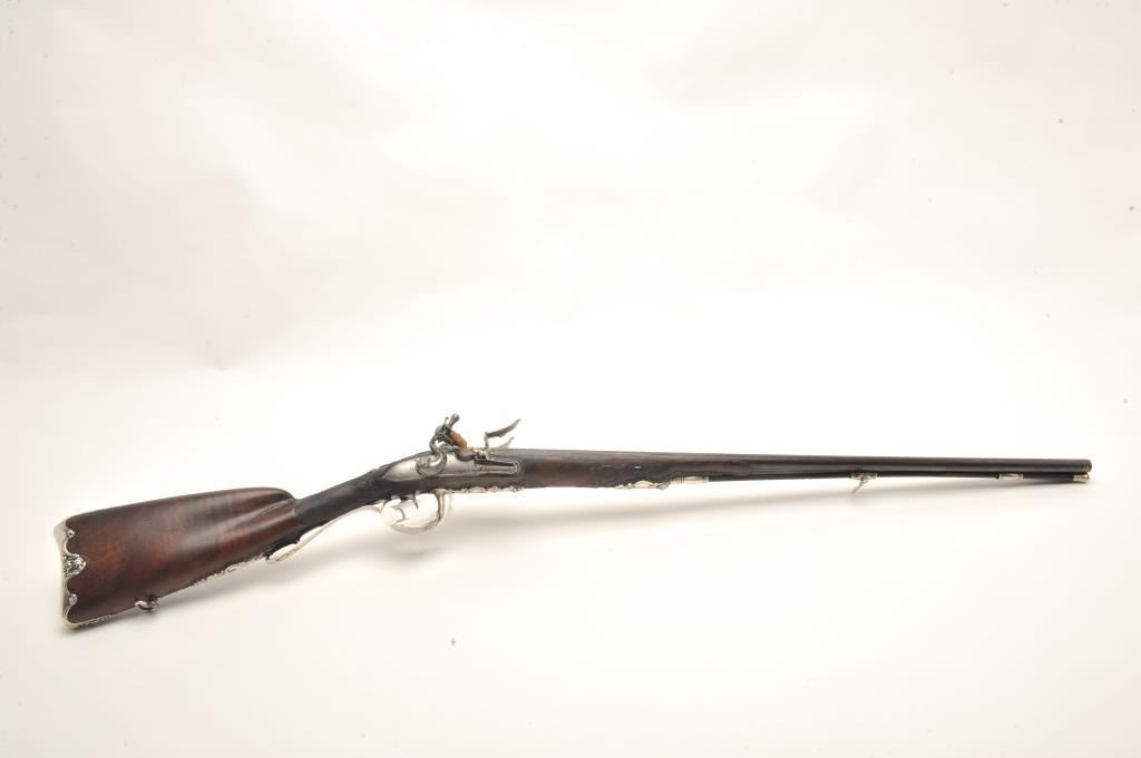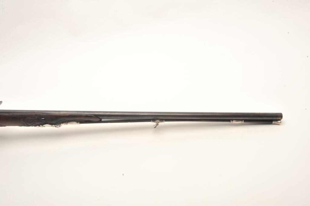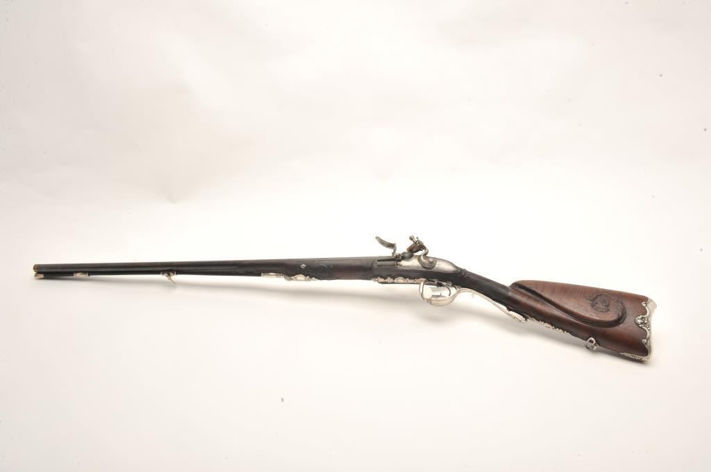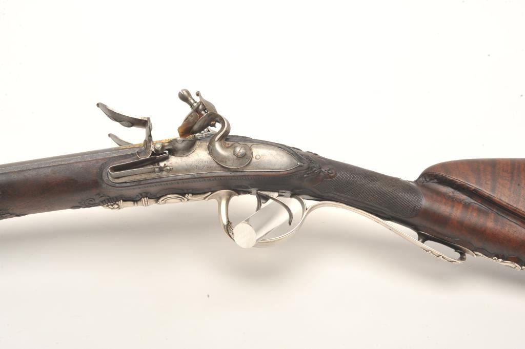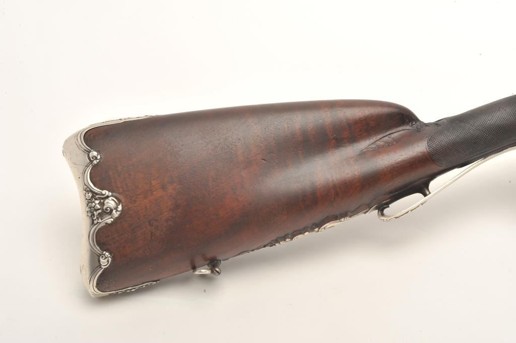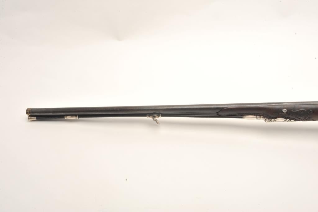 French late 18th century double flintlock shotgun signed “Simon A’ Paris” who held an appointment as maker to Royalty in the pre-revolutionary era. The gun shows fancy hallmarked silver mountings and the stock isfinely and ornately raised carved in floral motifs at the tang, cheek piece, fore end and surrounding the mountings. The barrel shows gold gilt on blue of which 80%-90% finish and gold gilt remains just toning naturally. The locks are original flint and show most gold lining in pans. Signed in script on both locks in fancy script. The stock is very good plus and has been expertly repaired at the wrist by master craftsman and we would nothave detected it but informed by our consignor of this $3,000 museum quality restoration. The tang shows an engraved portrait with in a sunburst which may indicate a descendent from the sun king or arelationship. Measures 46” overall with 30 ¾” barrels of 20GA smoothbore. A sophisticated and high quality double flintlock that may be researchable from engraved vignette on the tang. (Antique) Est.: $10,000-$20,000