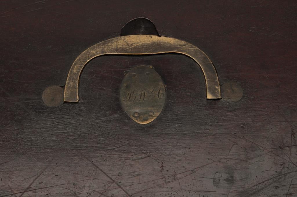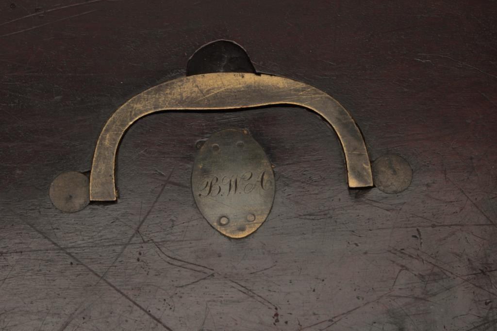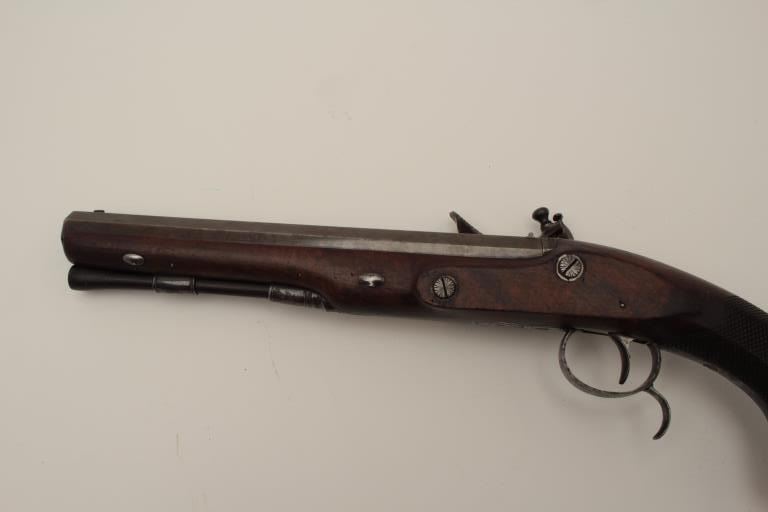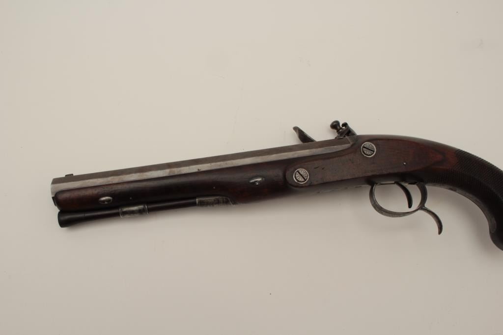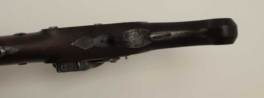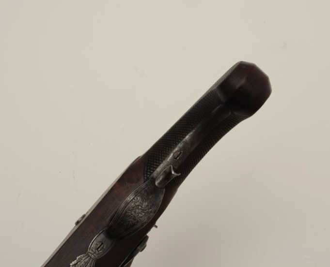 Pair of cased flintlock dueling pistols signed “Grierson” maker to his majesty circa about 1800. The pair measures 15” overall with a 9” octagon barrels of .69 smoothbore with full stocks. Spurs on guards withcheckered grips showing fine quality. Both pistols are near fine with considerable original brown and case colors remaining, estimated at 50%-75% crisp and sharp overall with very good plus stocks. Originalflintlock parts and original ramrods with worms attached to remove balls. The pair are English partition style cased with green felt or baize interior. The case shows an extra compartment for another pistol (about 10 ½”overall) and an “L” shape compartment for a shoulder stock also missing. A mold and 2 rod handles along with 2 original compartment covers included. The interior is fair to good with minor holes, aging tatters and etc. The box measures 21 ½” by 10” bottom only. The exterior shows a carry handle and engraved “B.W.A.” on the plaque. The exterior of case is good with normal aging and minor imperfections. This maker though not well