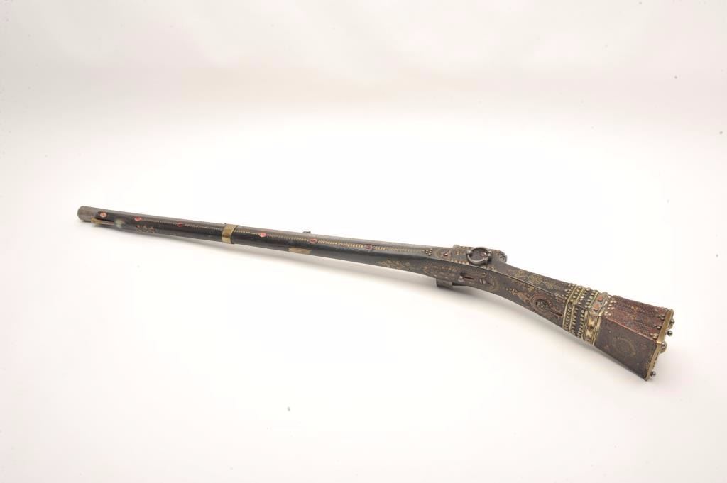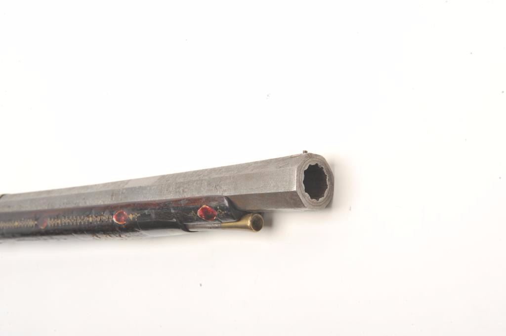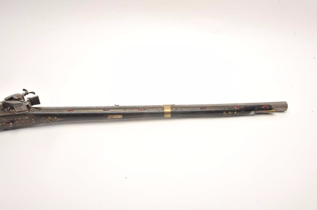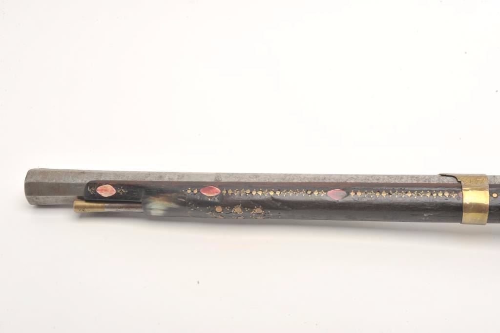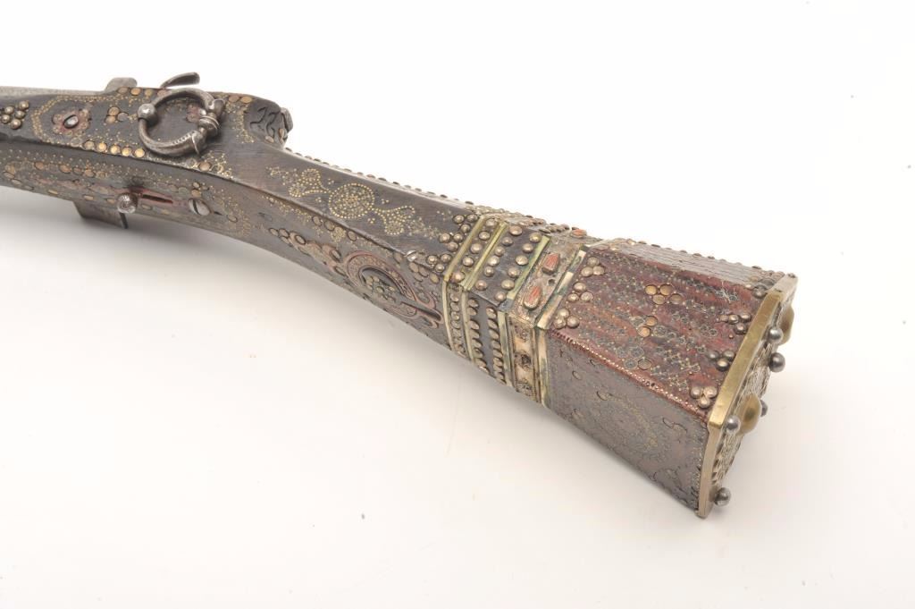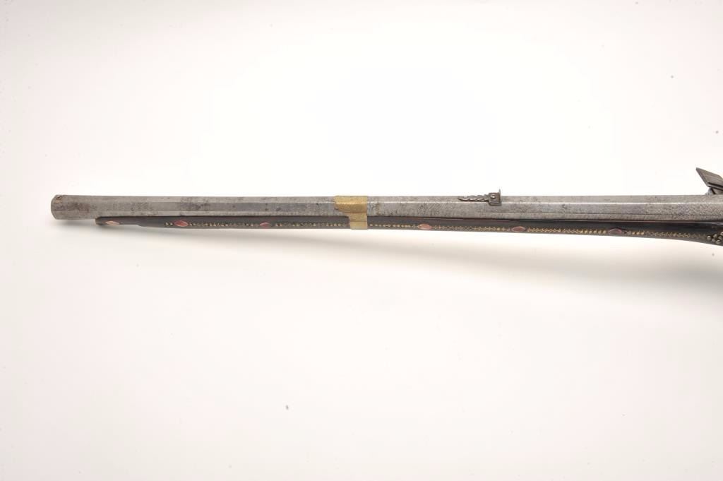 Turkish or Caucasian flintlock miquelet carbine with Damascus barrel with fancy brass and tacked decoration along with coral gemstone inlays. Measures 44” overall with a 30 ½” high quality barrel of approximately.75 caliber rifled. Circa Mid-18th to early 19th century. In good to very good condition overall with minor loss of inlays and slight weathering and aging to wood. The metal is a lightly cleaned gray patina and at least good overall. Works well and very good quality overall. (Antique) Est.: $1500-$3000