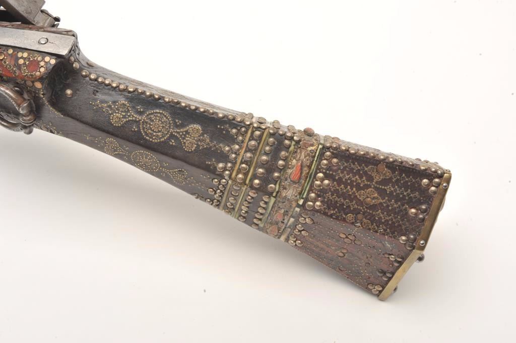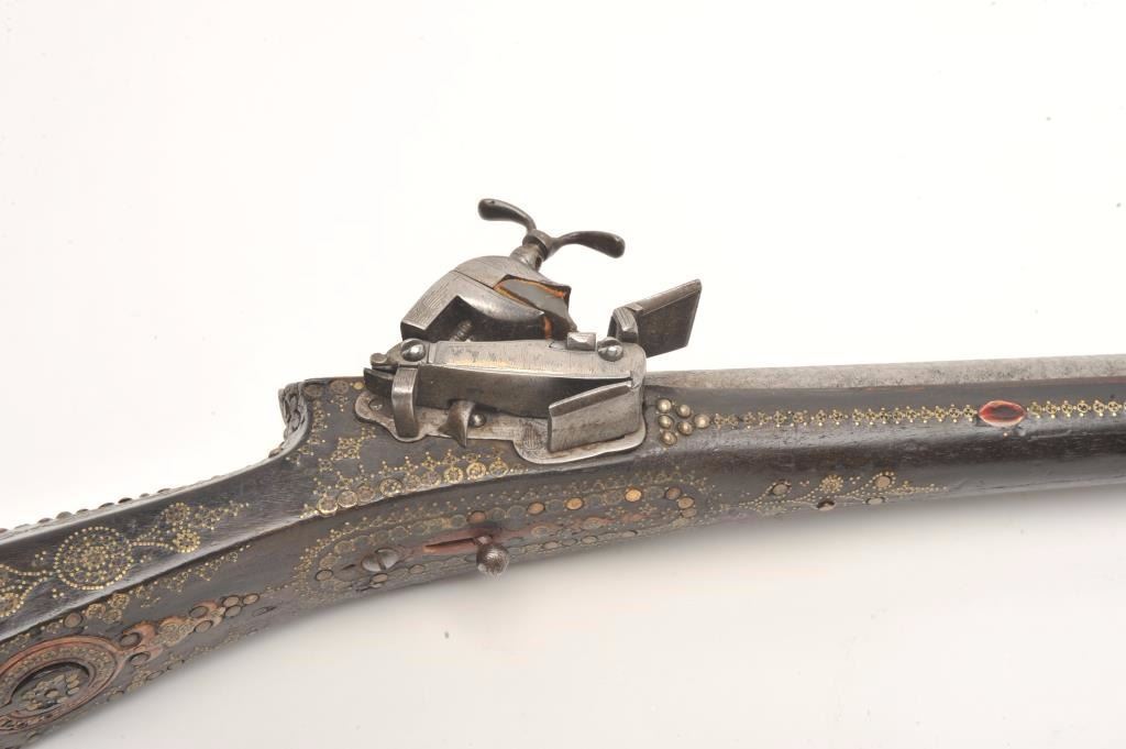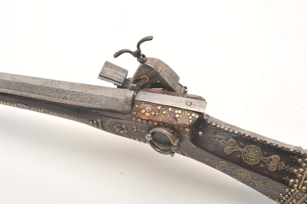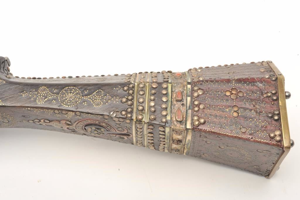 Lot 835 Turkish or Caucasian flintlock miquelet carbine with Damascus barrel with fancy brass and tacked d