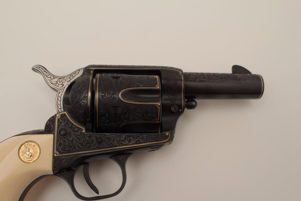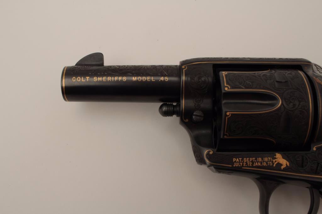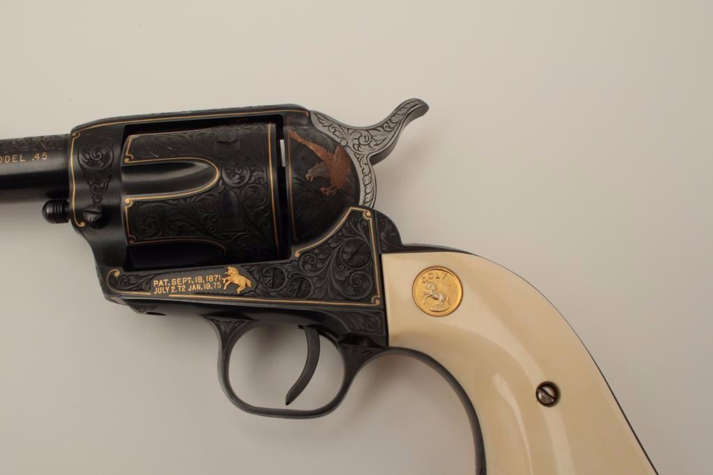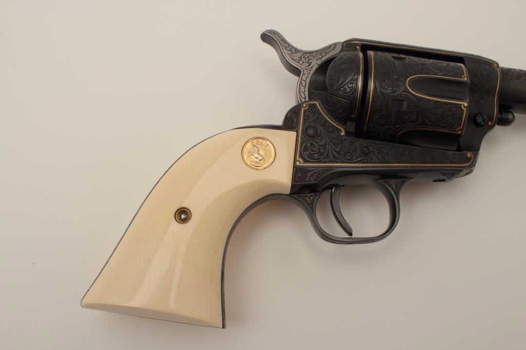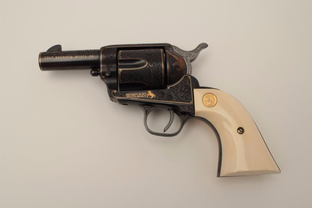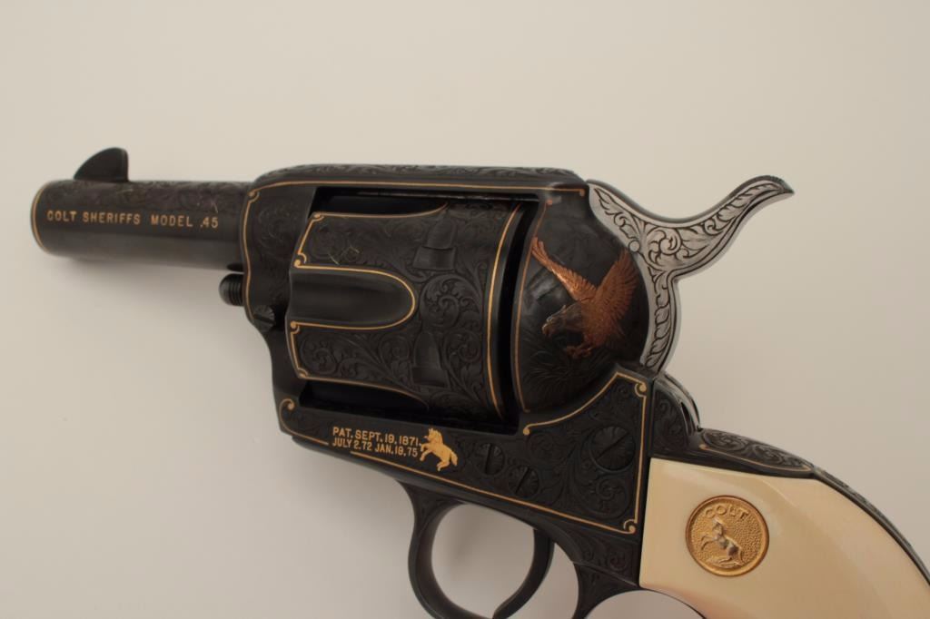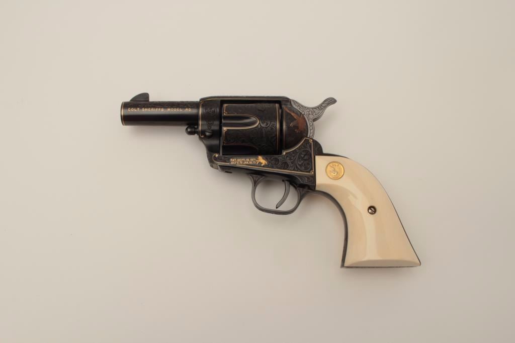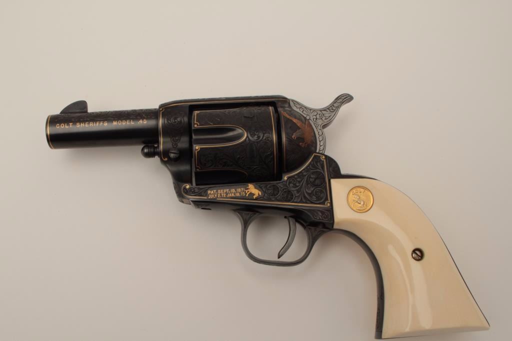 Colt Single Action Army revolver, Sheriff's Model .45 cal., 3" barrel, fully and finely engraved and gold inlaid by Angelo Bee, medallion ivory grips, serial #0143SM. The bottom of recoil shield shows Angelo Bee'sstamped signature. The revolver is nicely engraved in European scrolls with flush gold borders and gold lettering, 2-tone gold and silver eagle on left recoil shield which is Angelo's trademark. The Colt logo is inlaidin gold on left side of frame. The condition is fine to excellent as refinished at time of engraving. One of a series executed for noted Southern California collector Dr. Barnes. Est.: $3,000-$6,000