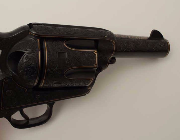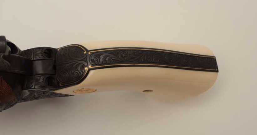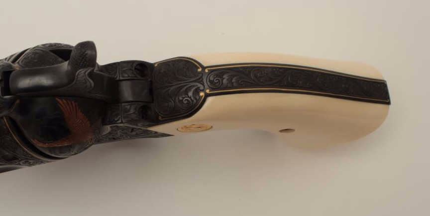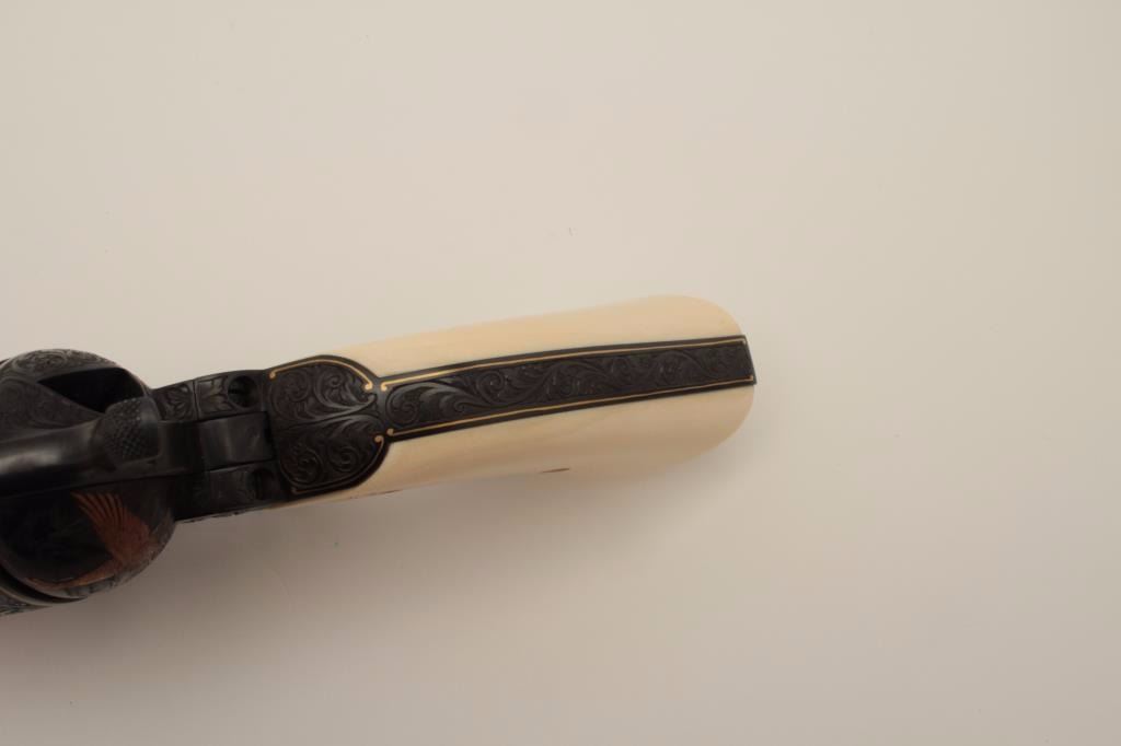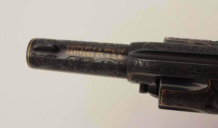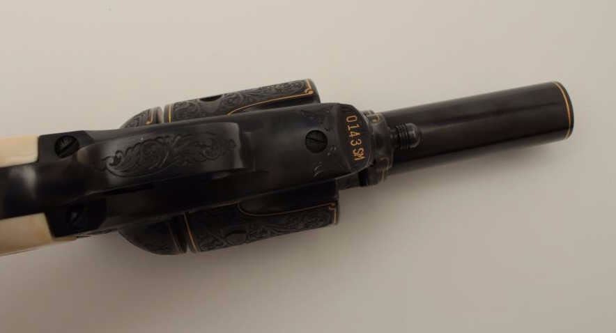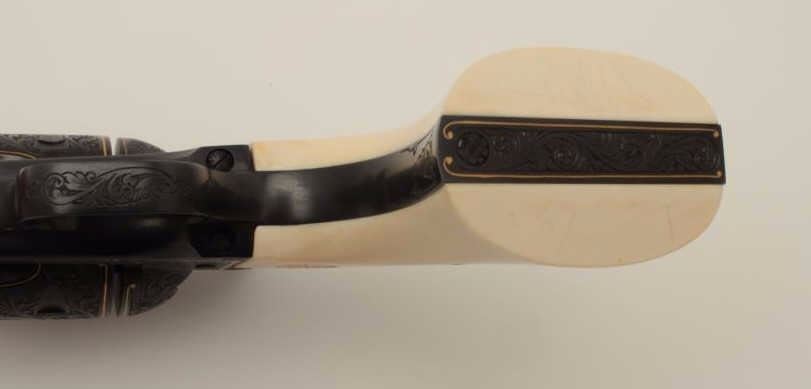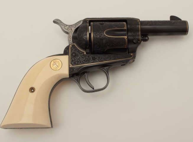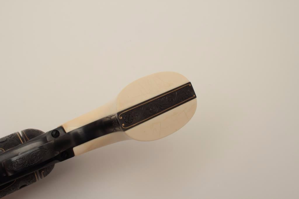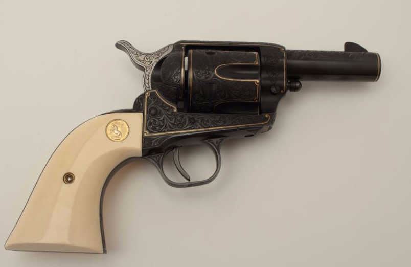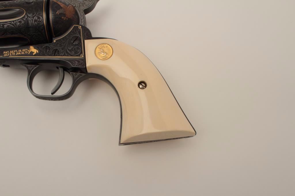 Colt Single Action Army revolver, Sheriff's Model .45 cal., 3" barrel, fully and finely engraved and gold inlaid by Angelo Bee, medallion ivory grips, serial #0143SM. The bottom of recoil shield shows Angelo Bee'sstamped signature. The revolver is nicely engraved in European scrolls with flush gold borders and gold lettering, 2-tone gold and silver eagle on left recoil shield which is Angelo's trademark. The Colt logo is inlaidin gold on left side of frame. The condition is fine to excellent as refinished at time of engraving. One of a series executed for noted Southern California collector Dr. Barnes. Est.: $3,000-$6,000
