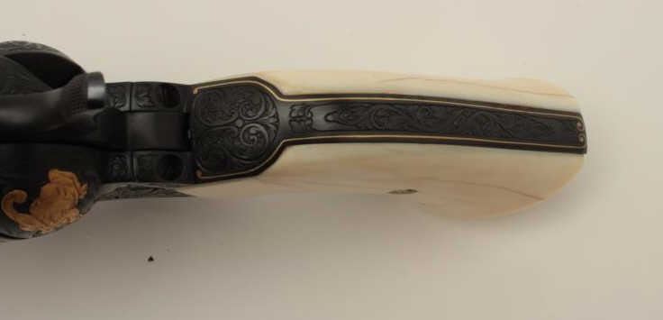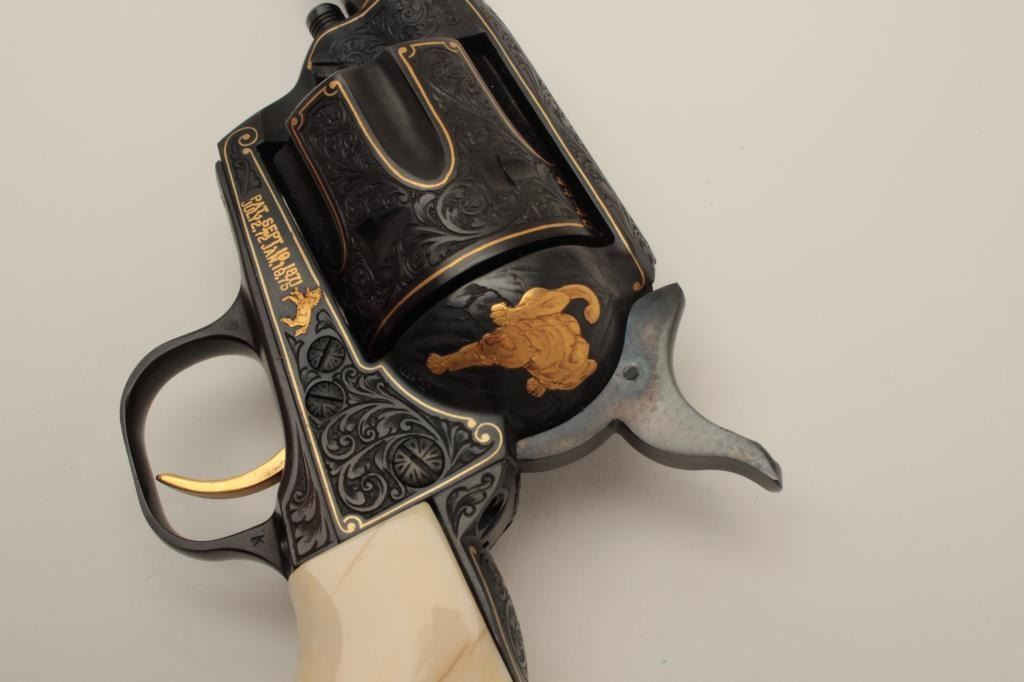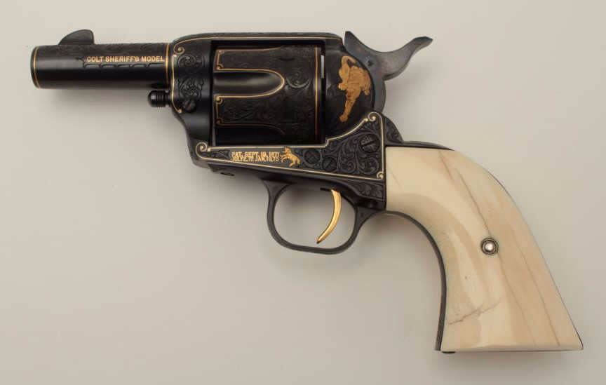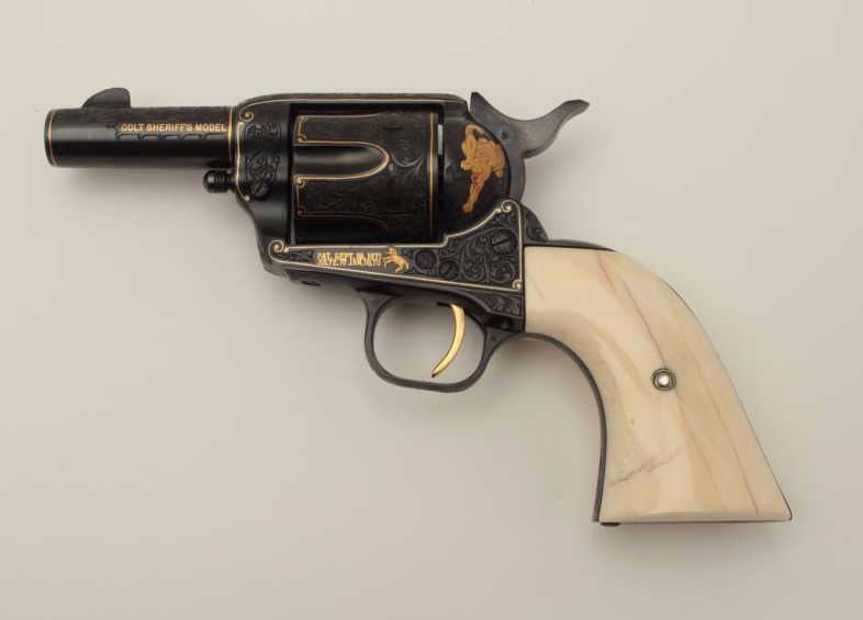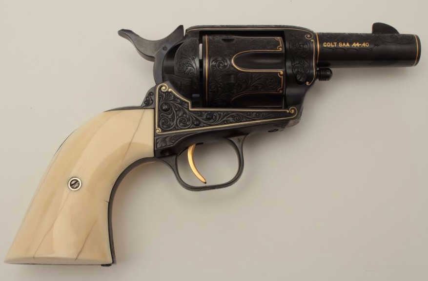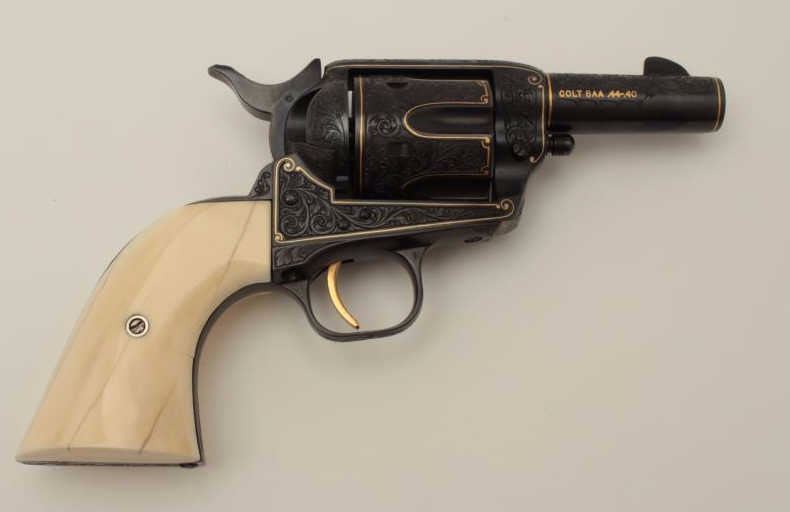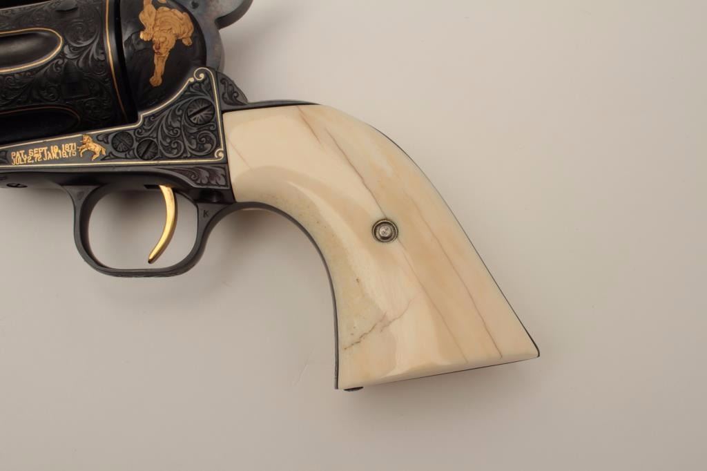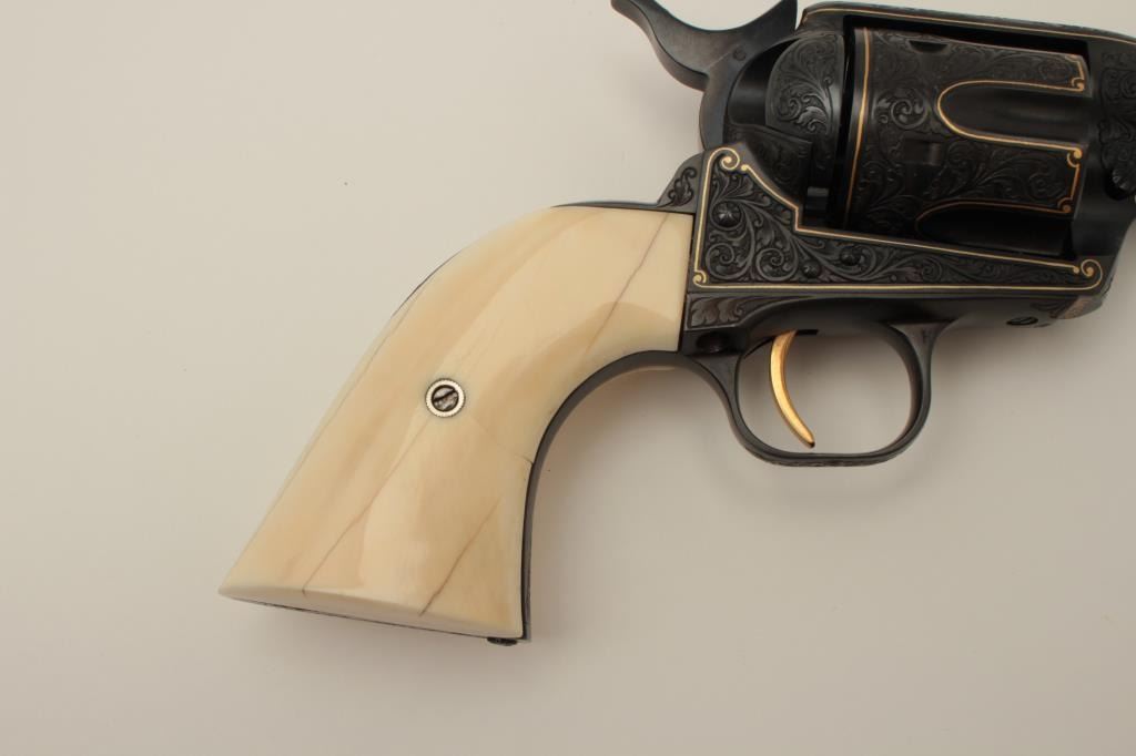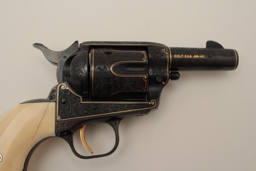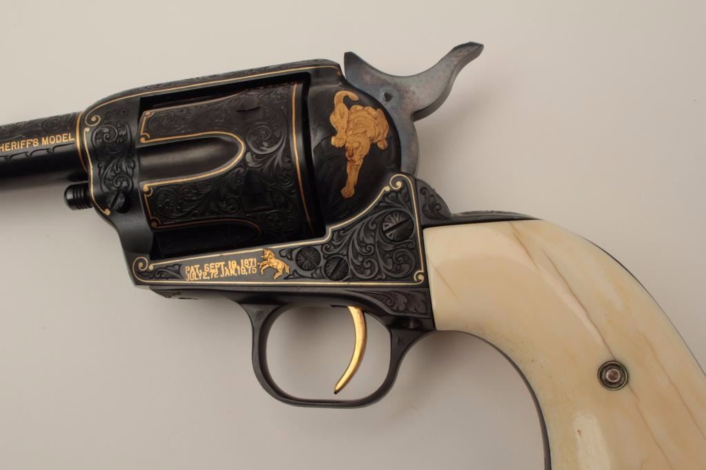 Colt Single Action Army Sheriffs Model .44-40 cal., 3" barrel, fully and finely gold inlaid by Angelo Bee with marine ivory grips, serial #SA40506. The left side of the recoil shield shows Angelo Bee's stamped signature. The pistol is finely engraved in European scroll with flush gold inlaid borders and lettering, mountain lion or cougar on left side of recoil shield with rampant colt and patent dates also gold inlaid. The conditionis fine to excellent as refinished at time of engraving; the marine ivory grips are from a walrus tusk and show some age cracking and yellowing. One of a series executed for noted Southern California collector Dr. Barnes. In the 1990s. (Modern/PPT). Est.: $3,000-$6,000