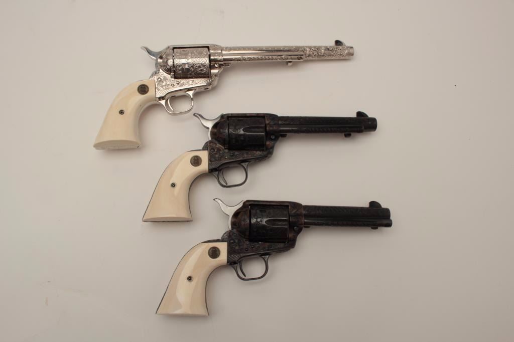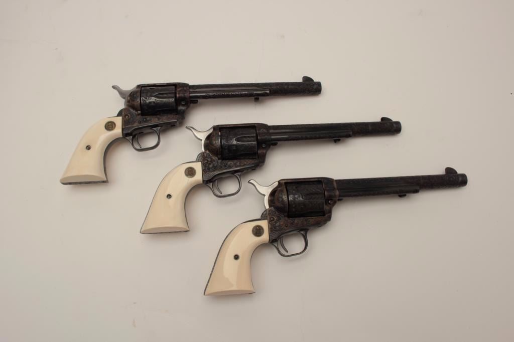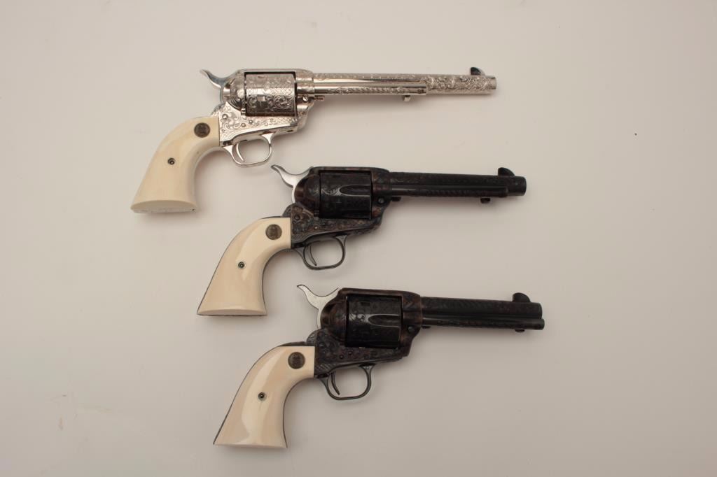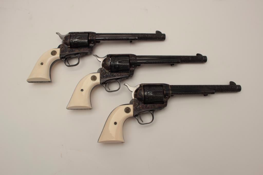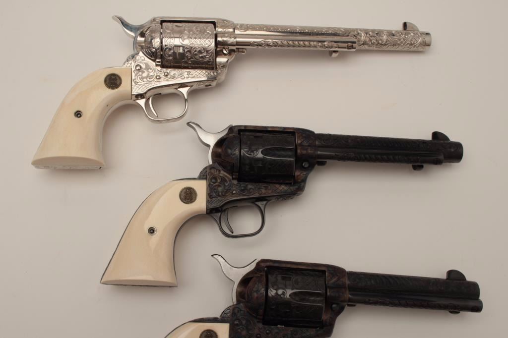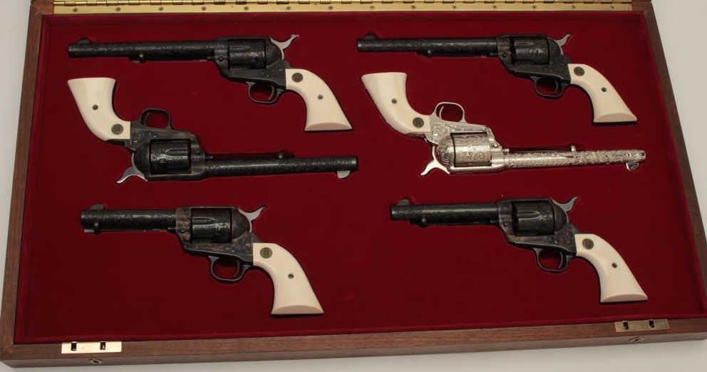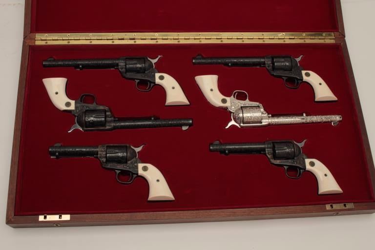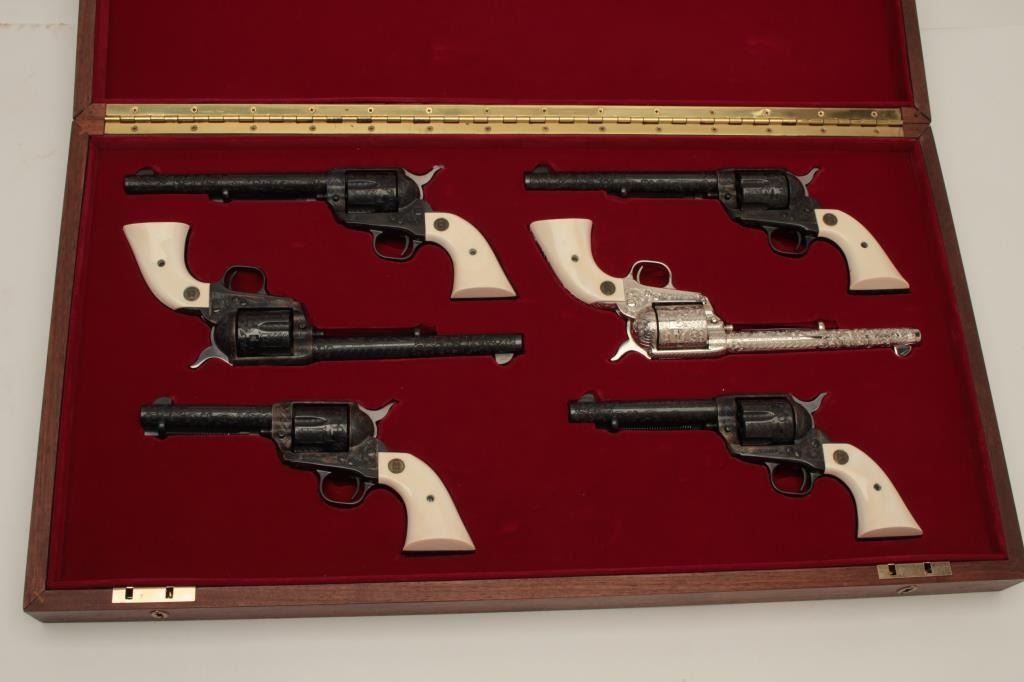 Colt Single Action Army 6-gun garniture consisting of six factory engraved D-Grade Colt Single Action Armys with medallion grips in presentation display case which is lined in red velvet in French style.