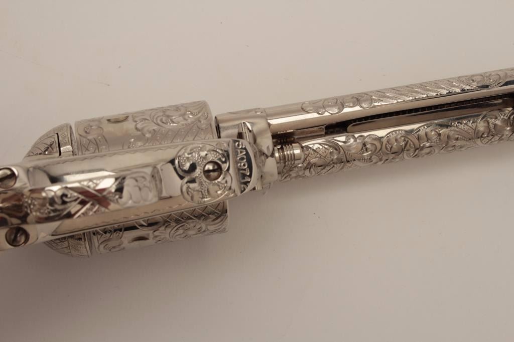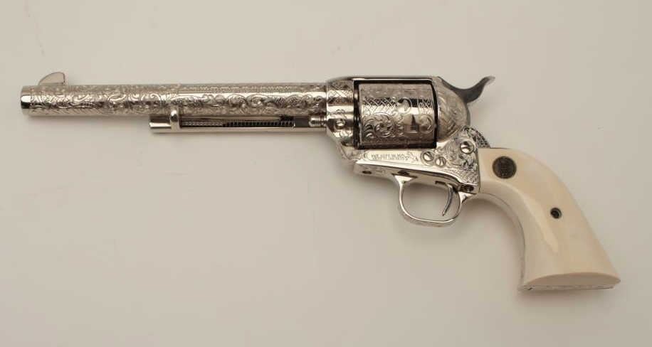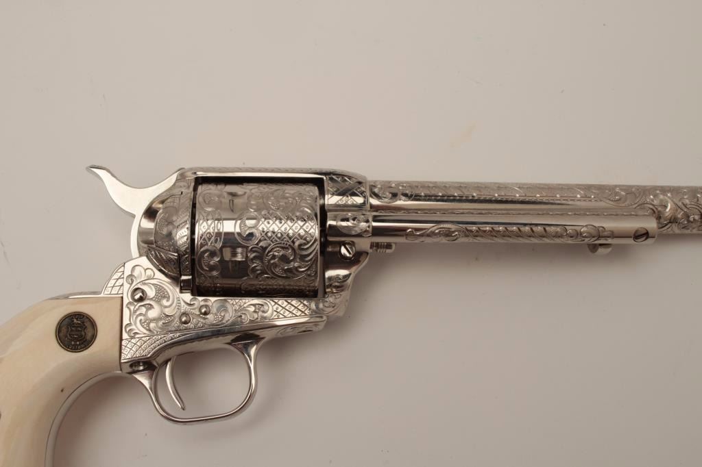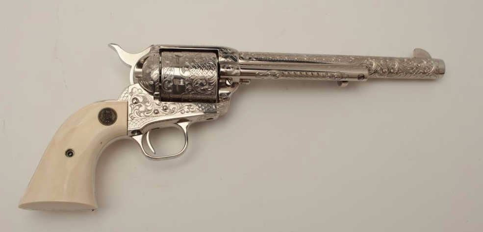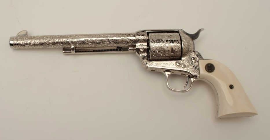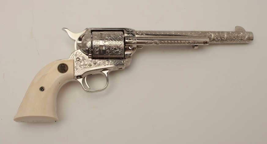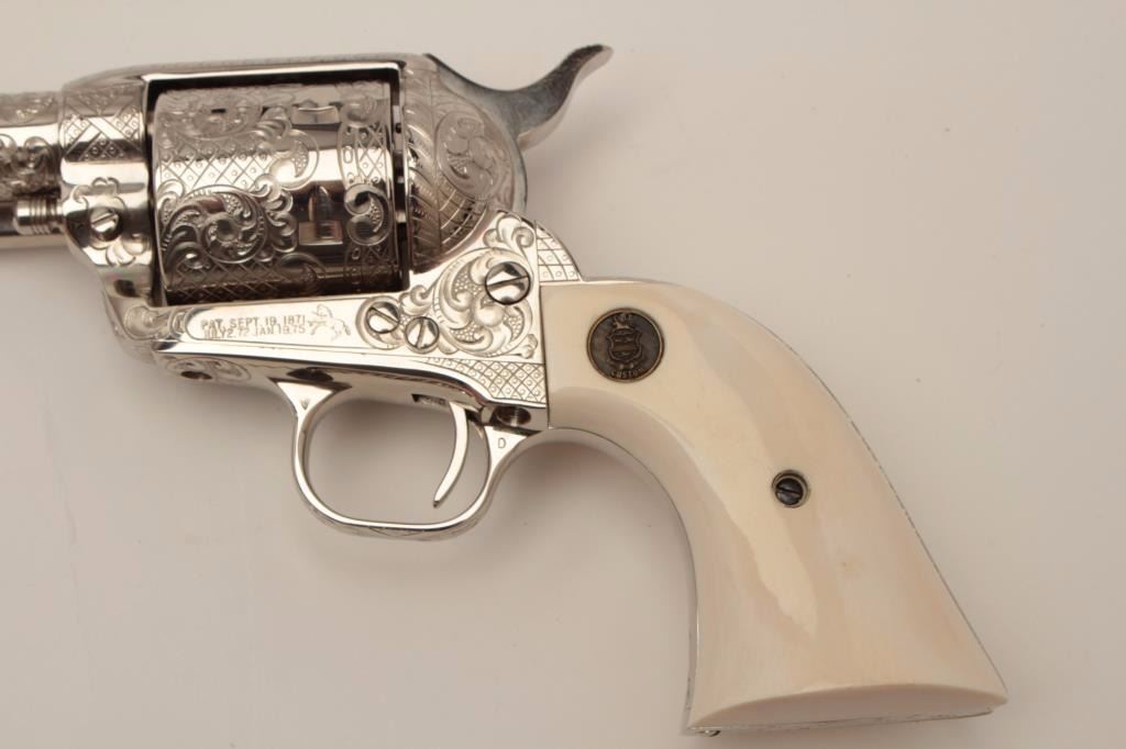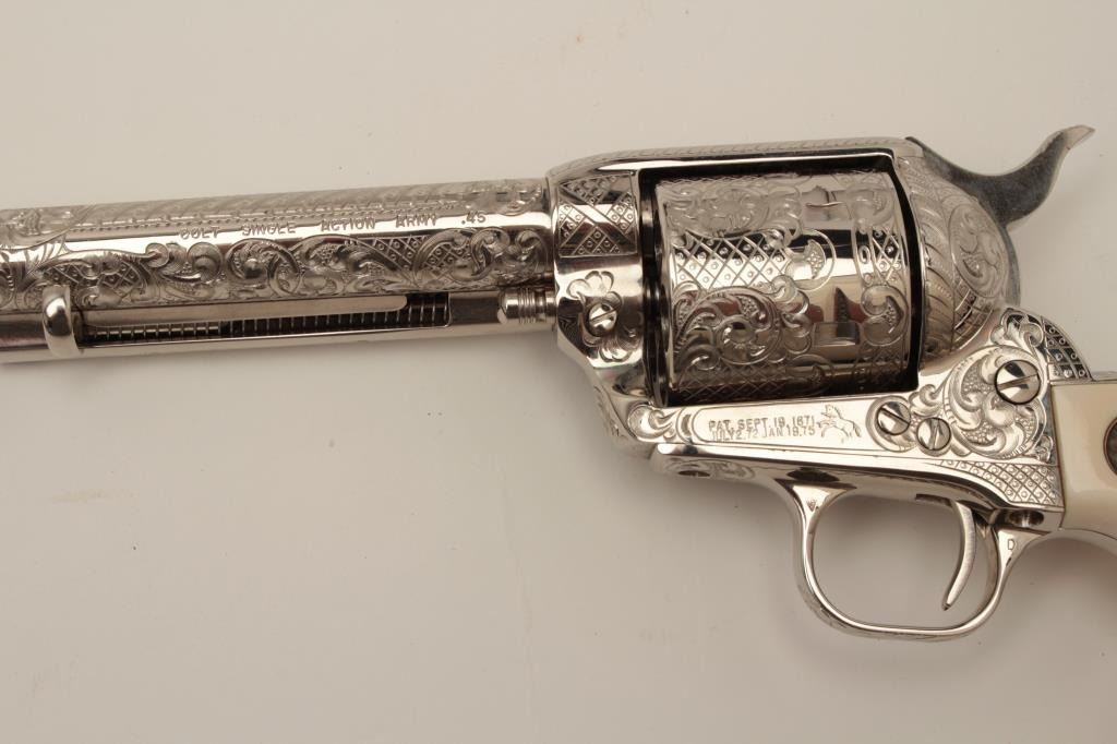 Gun #SA09712 is .45 caliber, 7-1/2” barrel, factory D engraved, ivory grips, nickel plated, numbered 6 of 6 on backstrap. Letters presentation case, shipped to Pacific International, Sacramento, CA, November 12, 1982, Custom shop order 965-E.