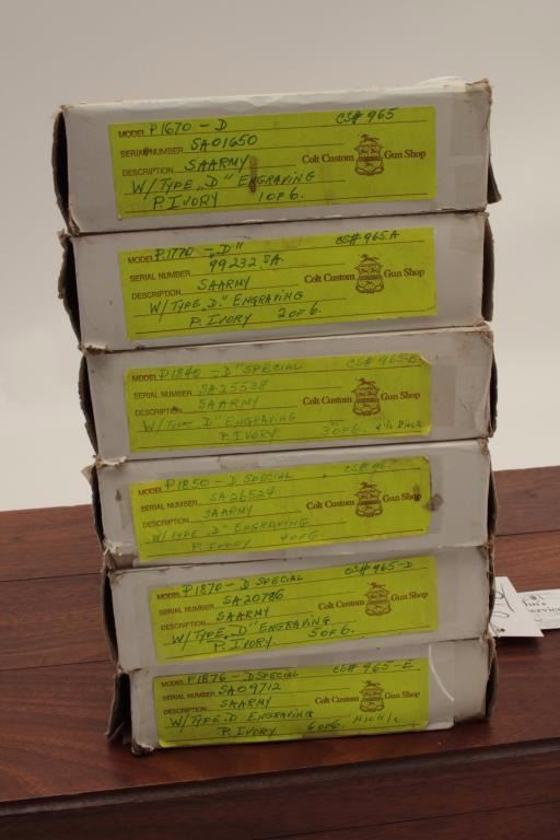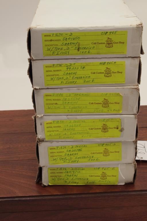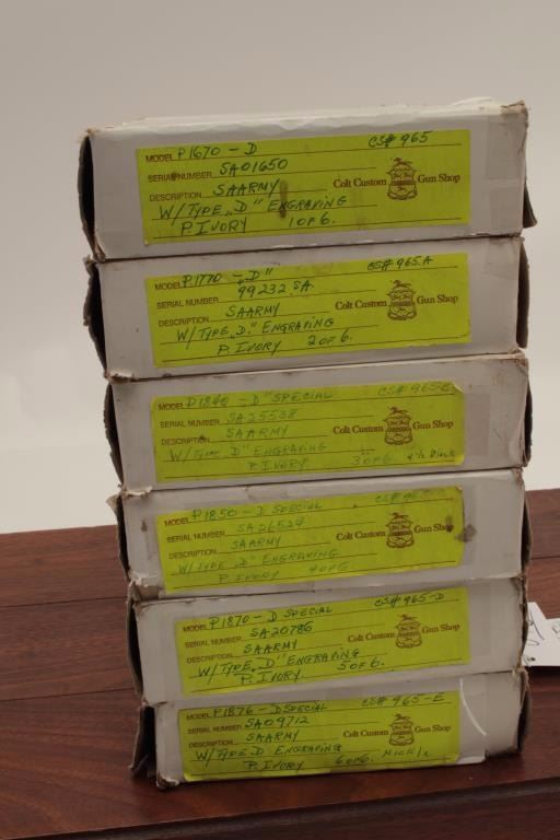 This set was an attempt by original purchaser to obtain a unique and one of a kind six-gun set. The set was finally completed after almost a 5-year wait. Estimated cost of replacement is over $30,000, a five year wait, and medallion ivory grips are no longer available. Original cardboard boxes are included. Guaranteed to letter as described but re-consigned and letters are not available at the time of cataloging and this is our 2010 description. (Modern/PPT) Est.: $17,500 - $35,000