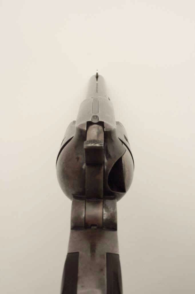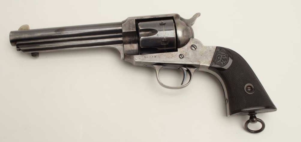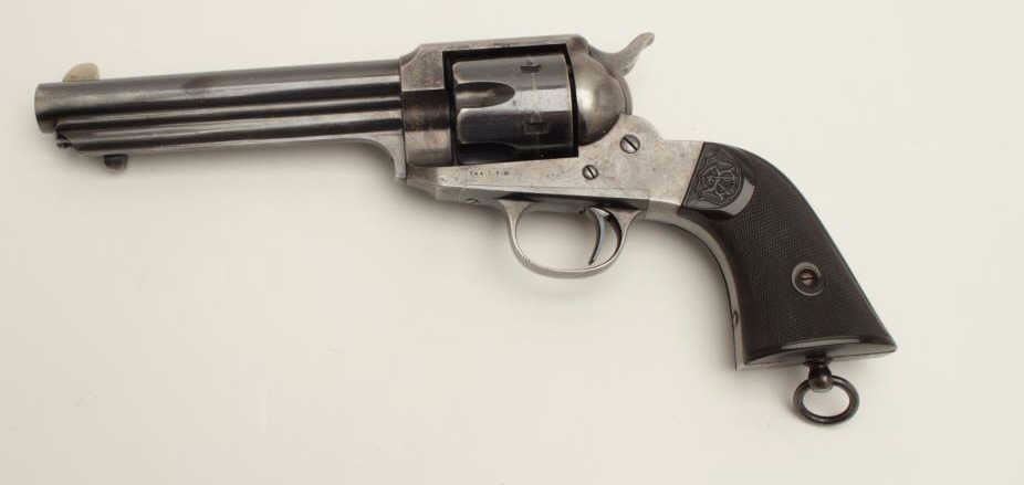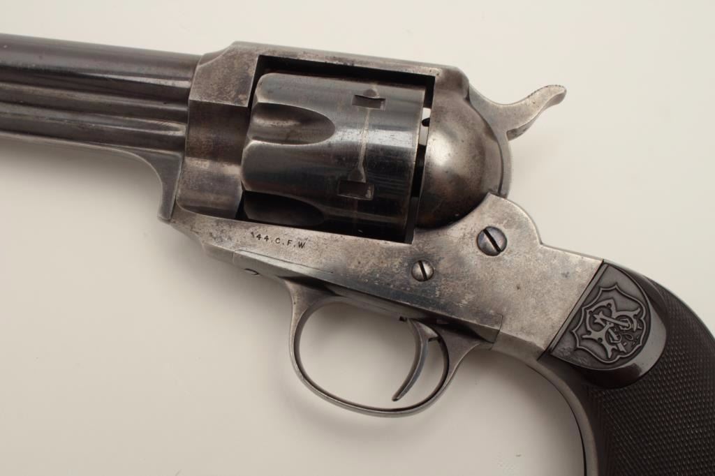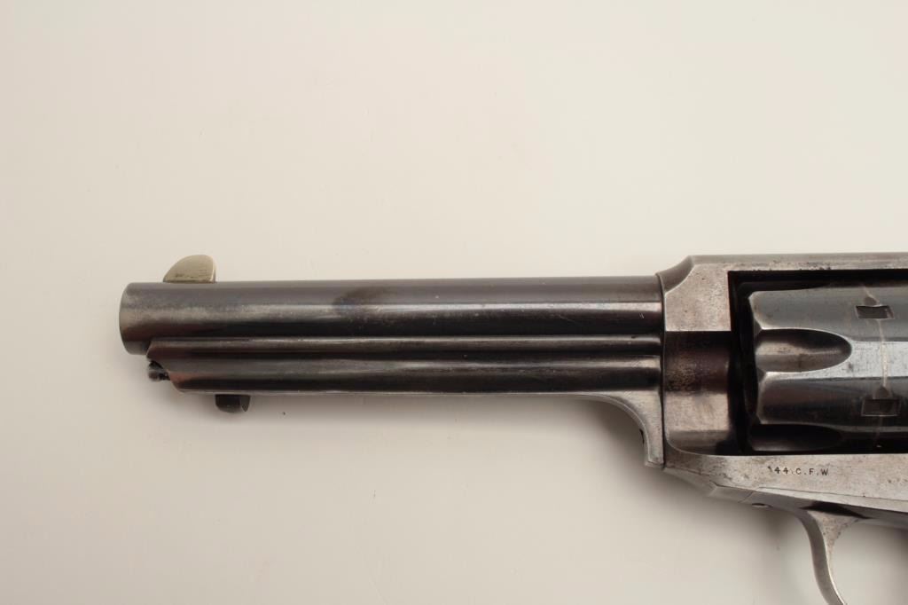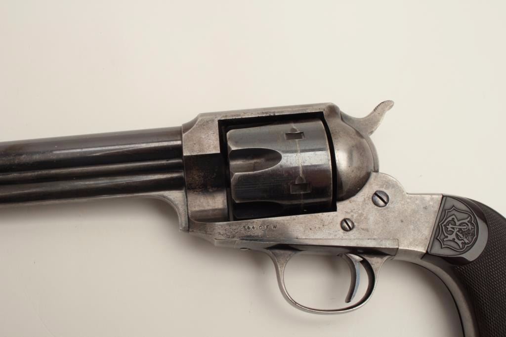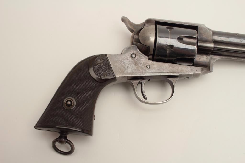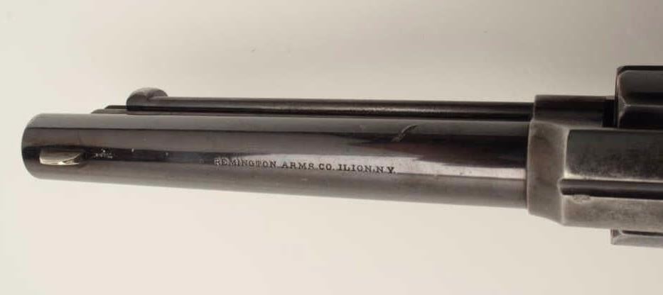 Stunning Remington Model 1890 revolver, S/N 692, 7.5” barrel, .44-40 caliber, blued finish, checkered hard rubber grips. Pictured in the “Guns of Remington book, page 211; from an award winning Remington ArmsCollectors Assoc. member; one of the Best Known; 75-85% bright original blue; very good + grips; bright case on hammer; minor scratches, index line on cylinder and normal aging with very slight imperfections.(Antique). Est.: $16,000-$32,000.