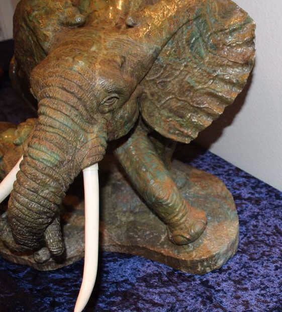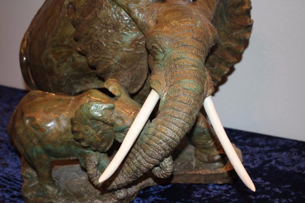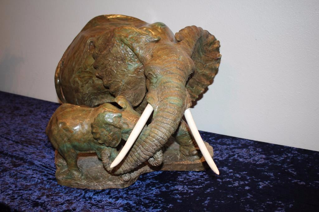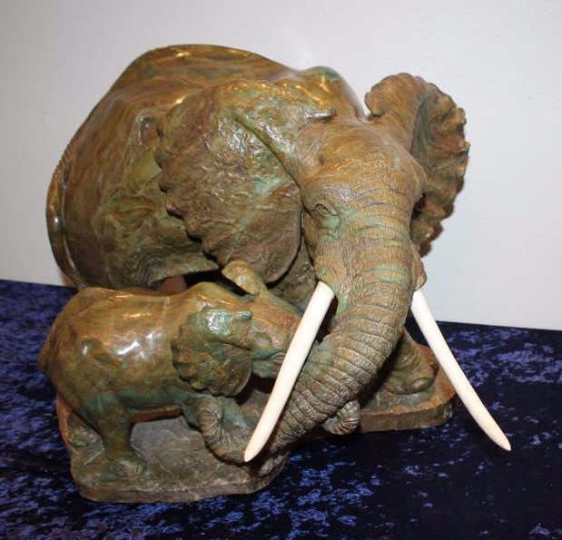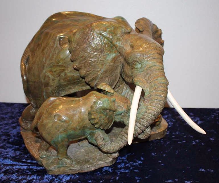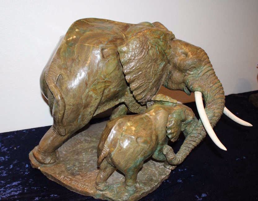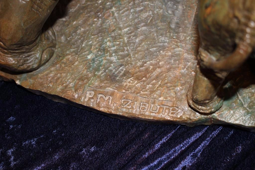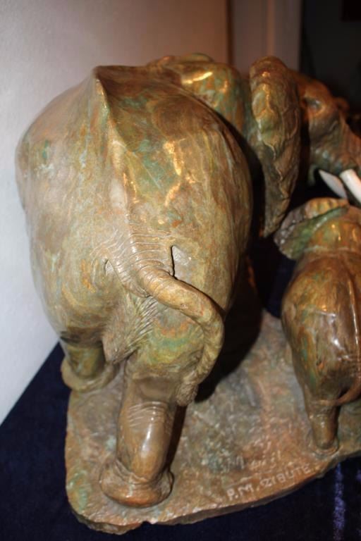 Carved hard stone (Verdite from Zimbabwe similar to jade) statue by P.M. Zubute who’s considered the top African artist in this field by many Safari Club and art collectors. This statue shows an African elephantguarding its baby. Measures approximately 16 ½” in height by 22” across the widest part of the base. Very heavy. P.M. Zubute carvings of this size and quality have realized above $25,000 at Safari Club auctions. Est.:$5,000-$10,000
