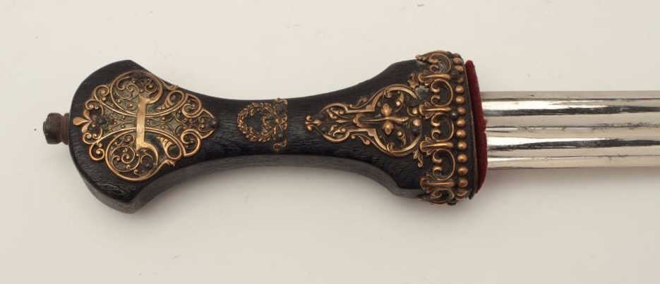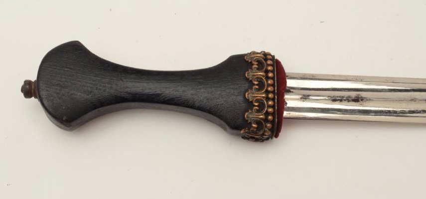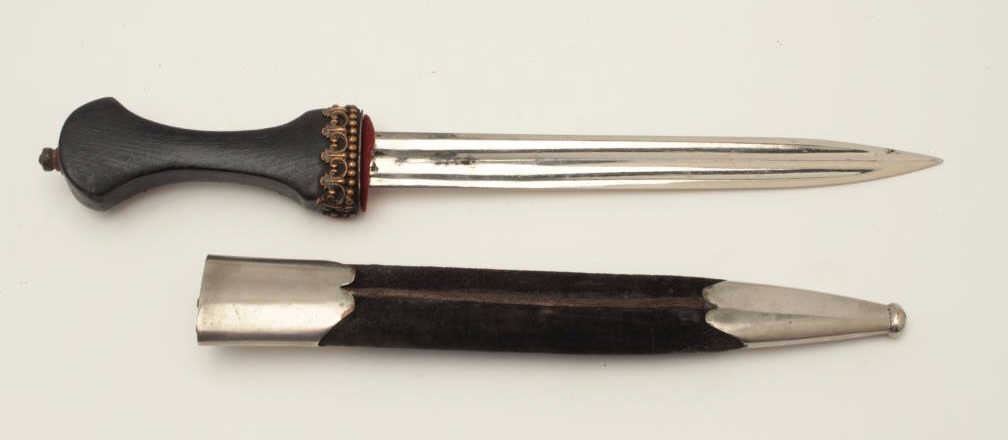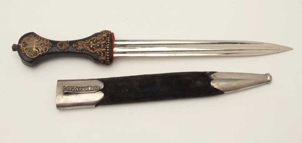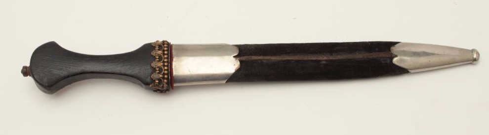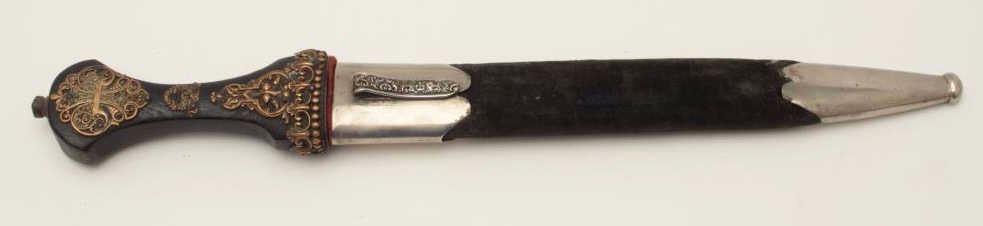 French made in eastern European Kenjal shaped dagger from Czarist era of 19th to early 20th century. Fancy bronze over dark wood hilt spearpoint blade of 9 ½” with double blood grooves that is nickel plated andmatching plated mounts with velvet covered body to scabbard. Measures 16 ¼” overall and in very good condition. Probably made to wear at an Eastern Royal Court possibly by Western diplomat or dignitary. Est.:$1500-$3000