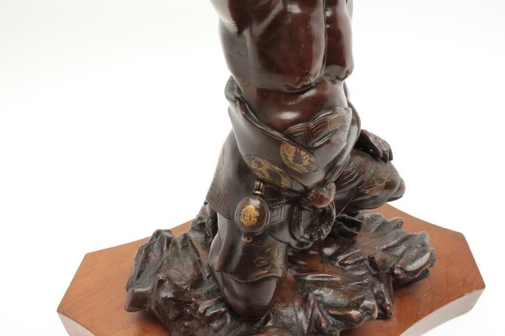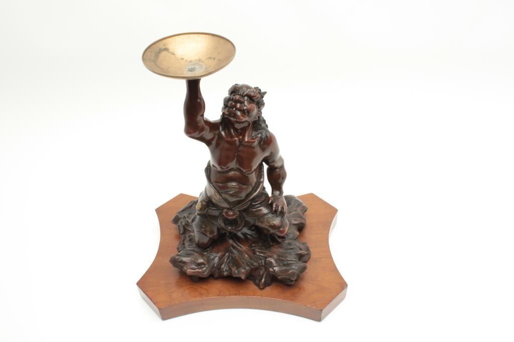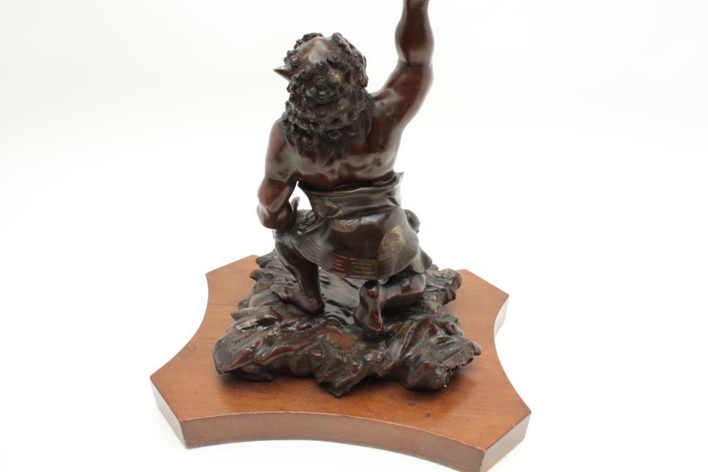 Japanese late Edo period bronze of oni (Demon Ghost) with gold shakado and fine patination by artist. Measures 17” in height by 11” across the center of the base. Est.: $900-$1800