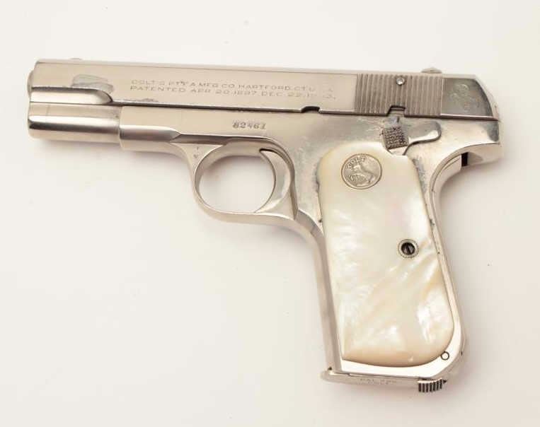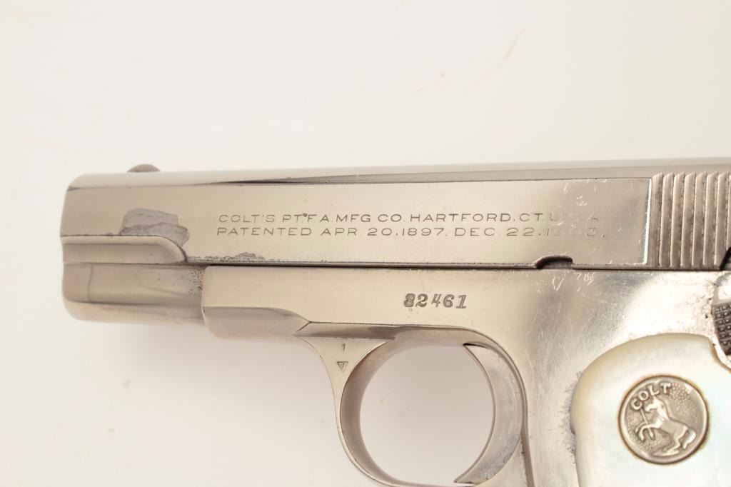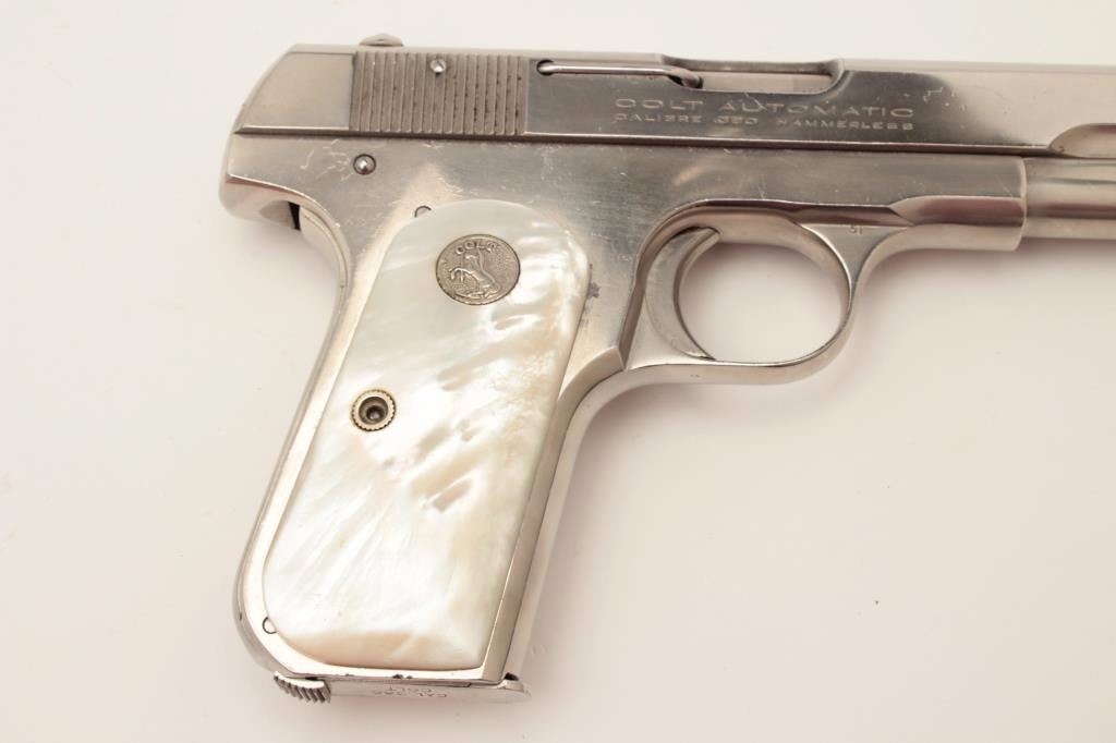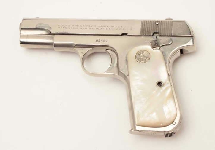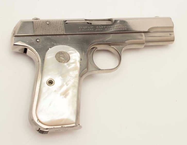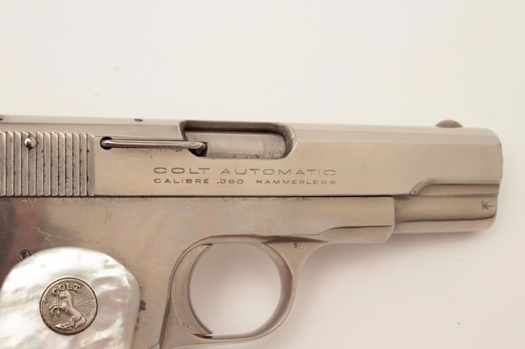 Colt Model 1908 semi-automatic pistol, .380 caliber, 4” barrel, factory nickel finish, medallion pearl grips, S/N 82461, in overall fine condition displaying the majority of its original finish with crisp action andmarkings, very good to fine bore and beautiful iridescent pearl grips. (C&R/PPT). Est.: $800-$1,600.