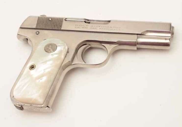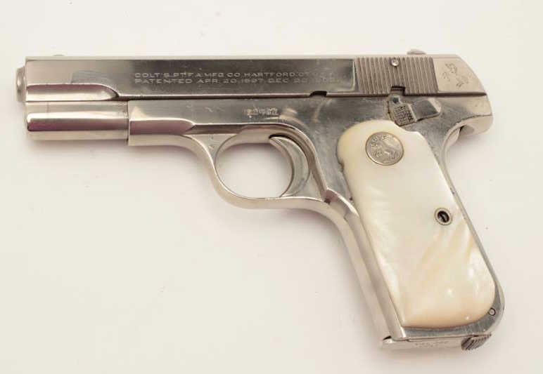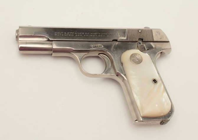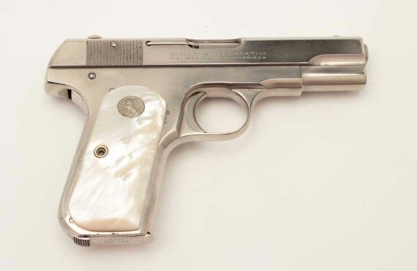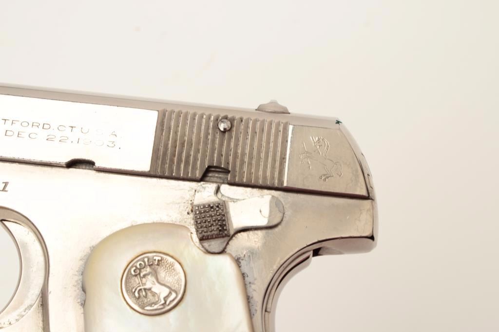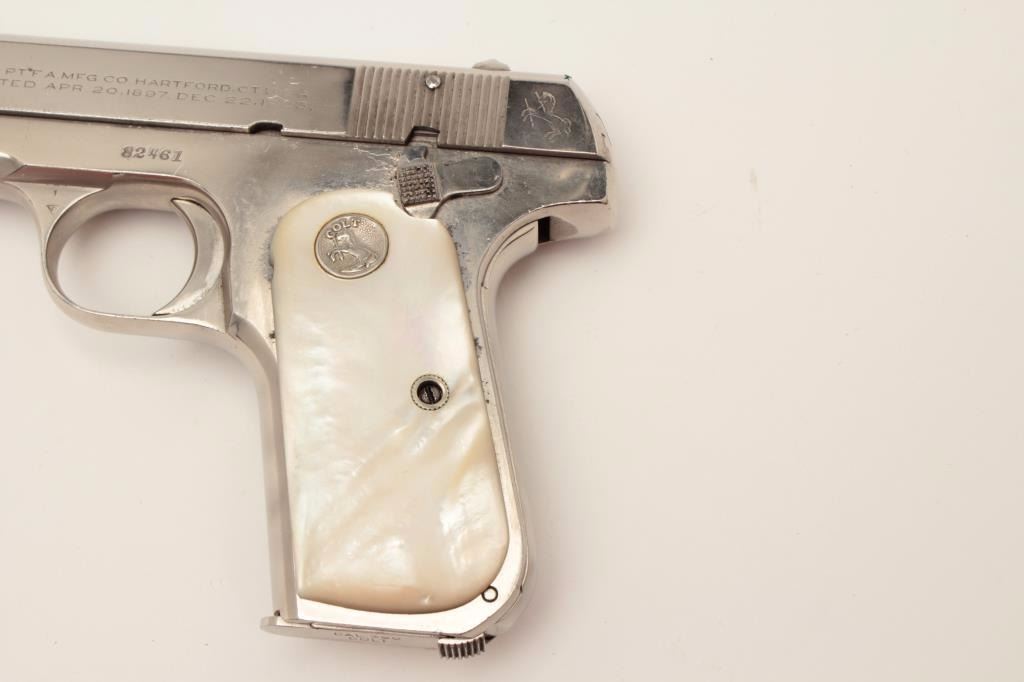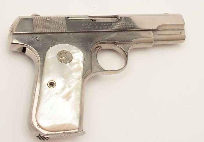 Colt Model 1908 semi-automatic pistol, .380 caliber, 4” barrel, factory nickel finish, medallion pearl grips, S/N 82461, in overall fine condition displaying the majority of its original finish with crisp action andmarkings, very good to fine bore and beautiful iridescent pearl grips. (C&R/PPT). Est.: $800-$1,600.