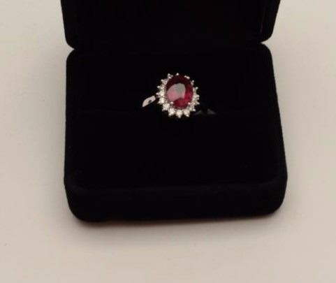Lot 865 One 18k white gold ladies ring set with a fine oval ruby weighing approx 3ct and 0.25ct of diamon