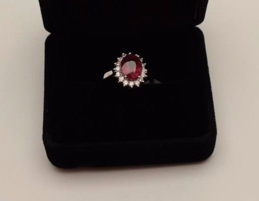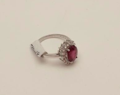 One 18k white gold ladies ring set with a fine oval ruby weighing approx 3ct and 0.25ct of diamonds Est:$1,750-2,000