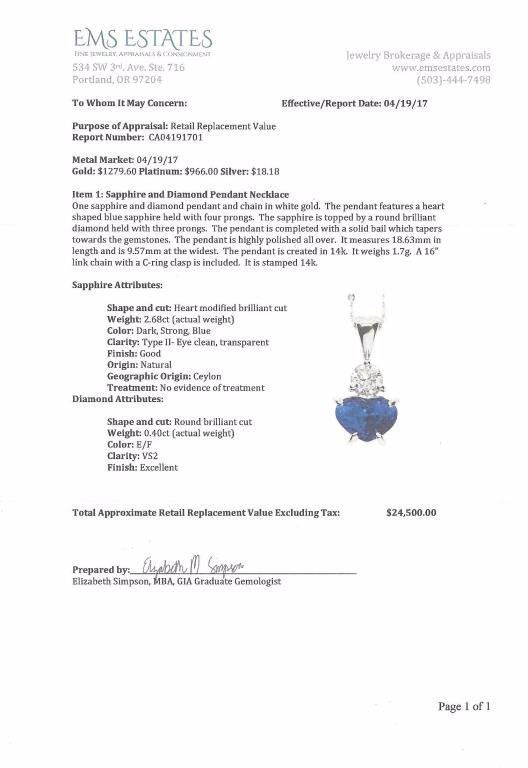 Very high quality ladies pendant featuring a natural no Heat Blue Ceylon sapphire weighing 2.68 carats accented with a round diamond weighing 0.40 carats of E/F color and VS clarity set in a 14 karat white gold setting. Please see Retail Appraisal at $25,000.00 Estimates $8,000-$12,000 Nice