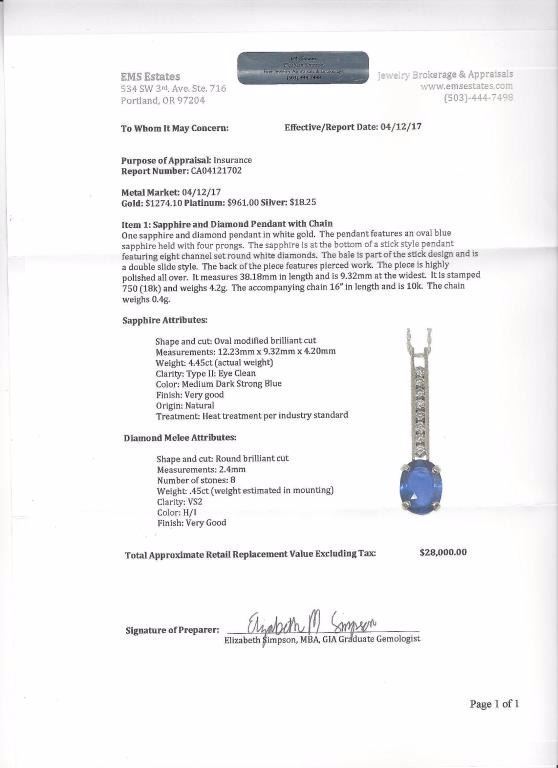 Exquisite ladies necklace featuring a Natural ‘Royal Blue’ color Sapphire weighing 4.45 carats and channel set with eight ‘IDEAL’ cut diamonds weighing approx. 0.25 carats of F-G colors and VS clarity set in an 18 karatwhite gold custom design setting. Please see Retail Appraisal at $28,000.00 Estimates $8,000-$12,000 Nice