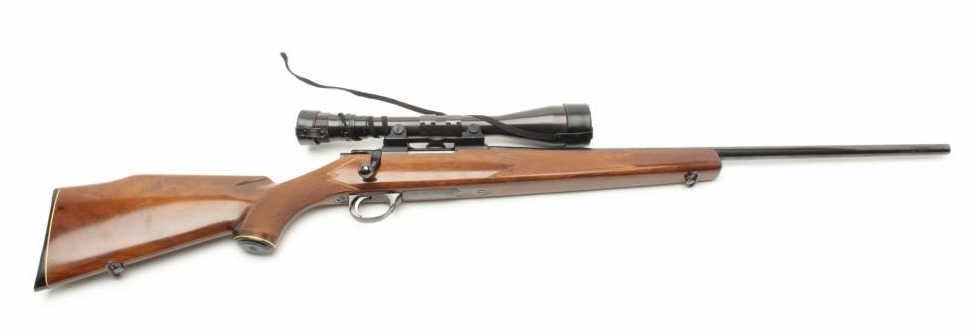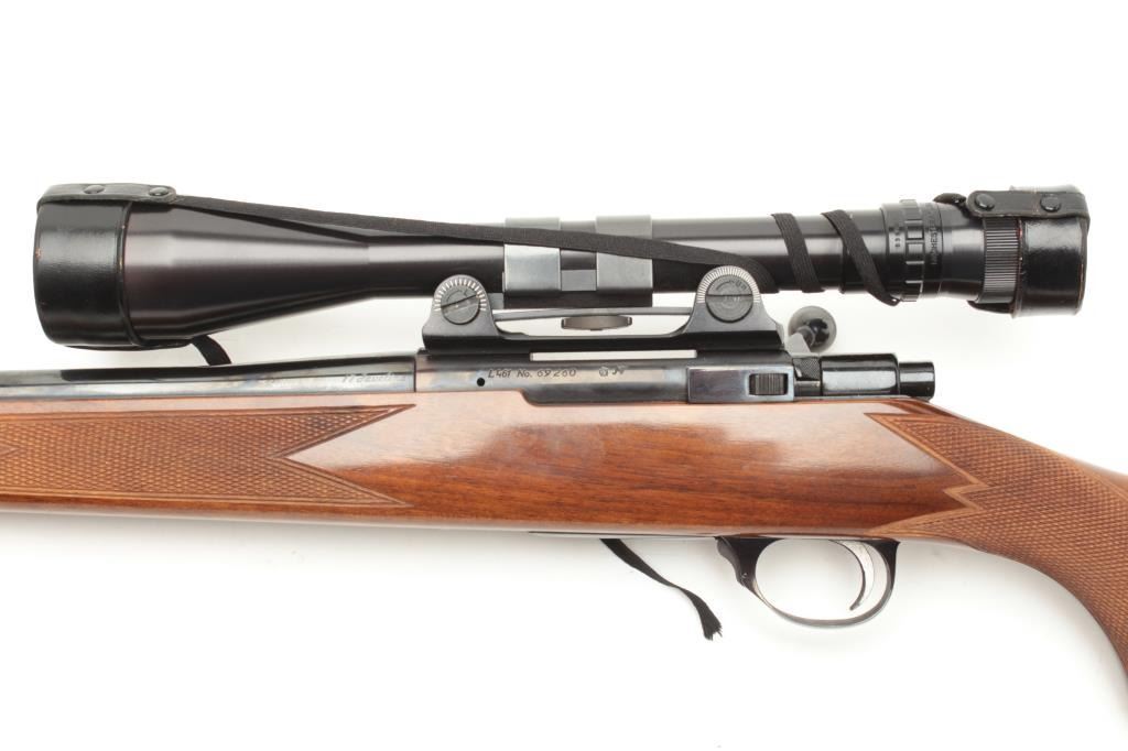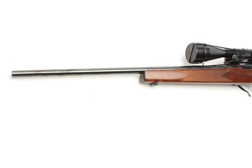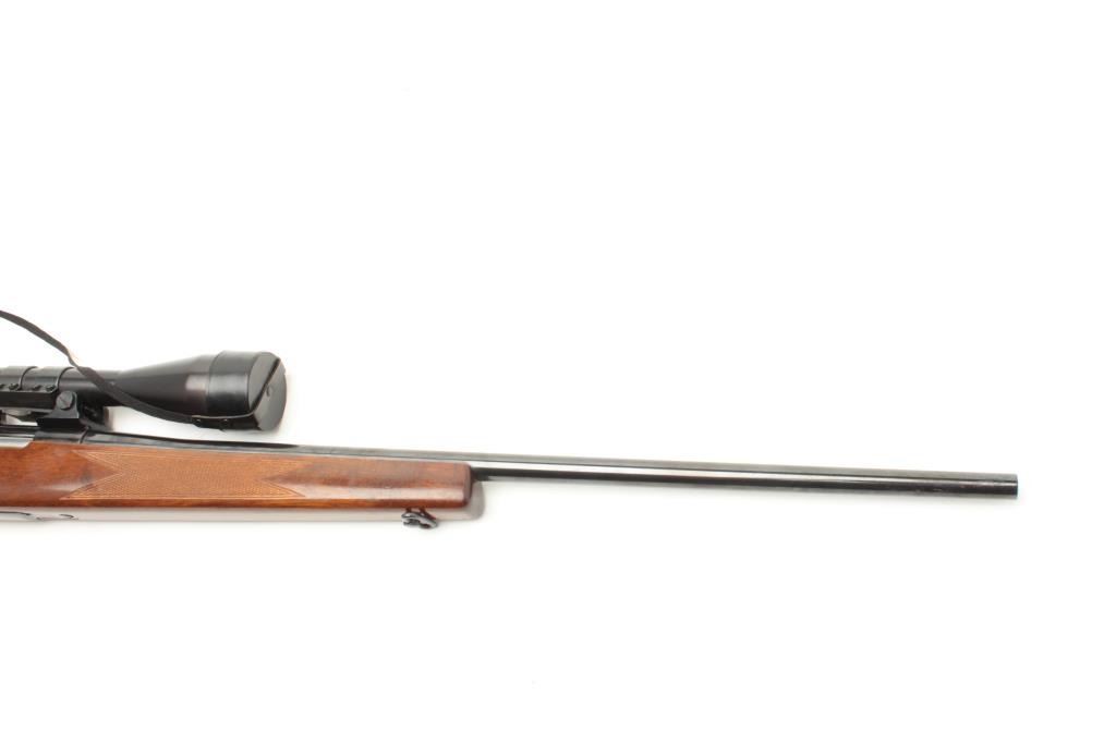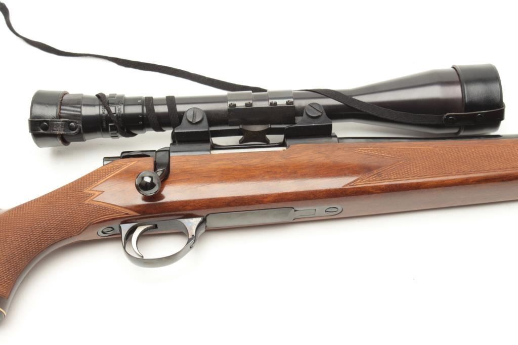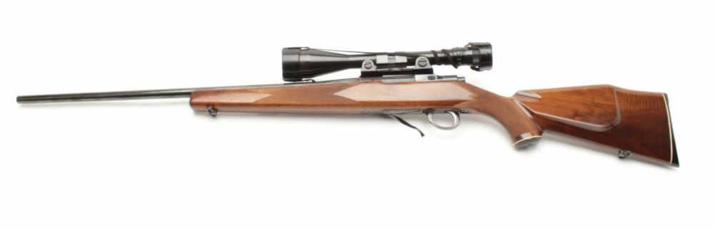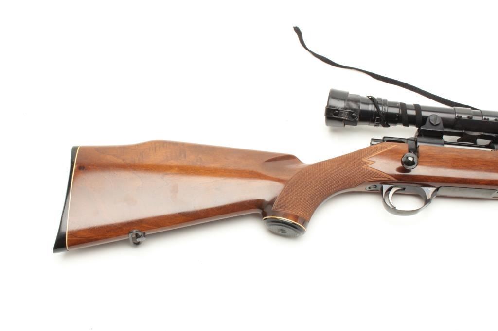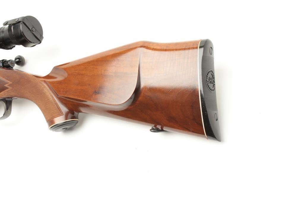 Sako custom bolt action rifle with A & M Rifle Co. .17 Javelina caliber 24” barrel, blued finish, checkered wood stock, S/N 69260, mounted with a Balvar 8A scope displaying clear optics. This rifle is inoverall very good + condition with majority of original finish to metal surfaces, good bore overall, crisp action and very good stock. (Modern/PPT). Est.: $350-$700.