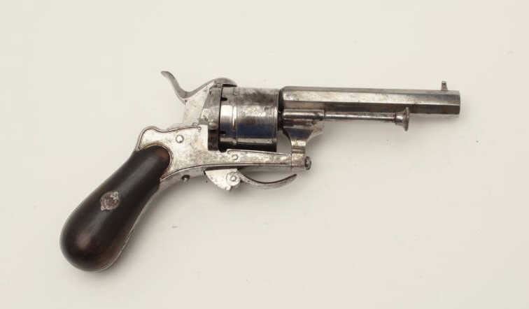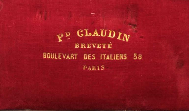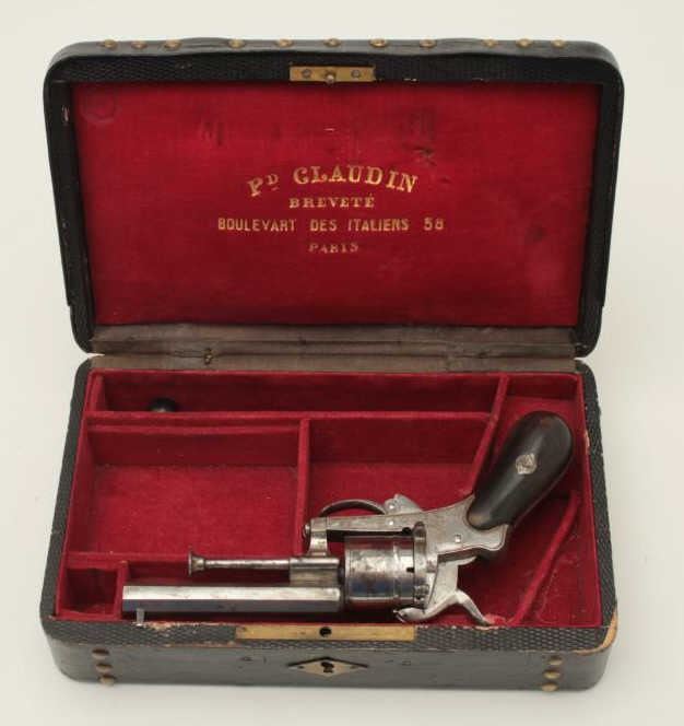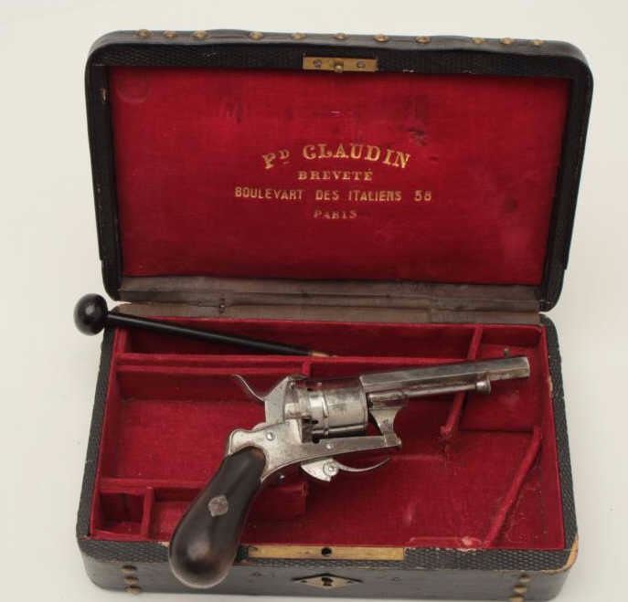 Lot 877 French pinfire revolver in original case and marked in fancy script on the barrel “Pd. Claudin, Br