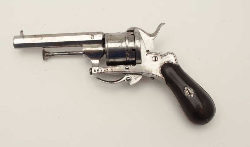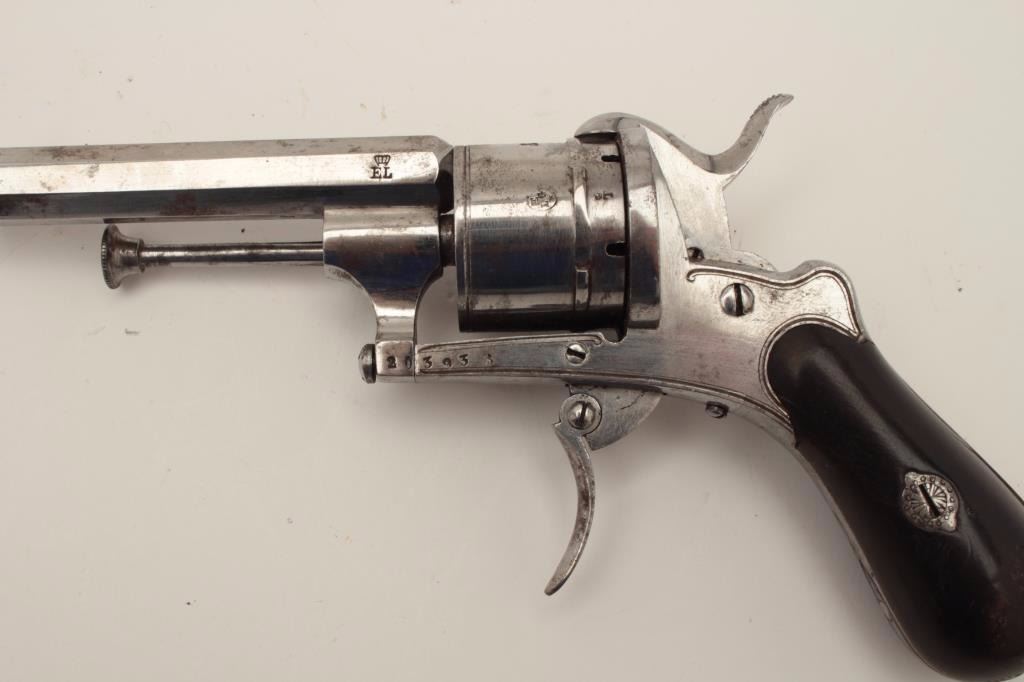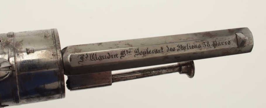 French pinfire revolver in original case and marked in fancy script on the barrel “Pd. Claudin, Brevete, Boulevart Des Italigns 38, Paris” with the same name and address embossed in gold into lid of the case. Therevolver is 7.5mm pinfire with a 6 shot cylinder and is double action in typical 1860 style showing 3 ¼” octagon barrel, folding trigger, bag shaped grip and mounted with ejector rod. Original French gray on polished metal finish marked “E.L.” with crown at breach with Belgium proofs, S/N 203938. The original red velvet lined case is in partition style and interior is very good plus with just slight aging and minorimperfections. The exterior is Moroccan leather dyed black with brass tack and also very good. The revolver works well and is crisp. A very nice set and exceptional casing. (Antique) Est.: $600-$1200