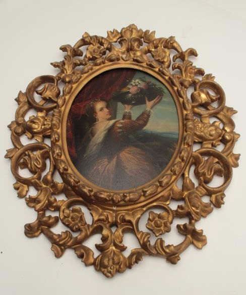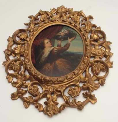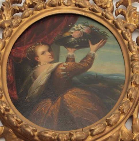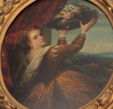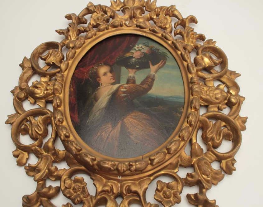 Lot 883 Early to mid-18th century oil painting on board of lady holding basket of flowers in vintage frame
