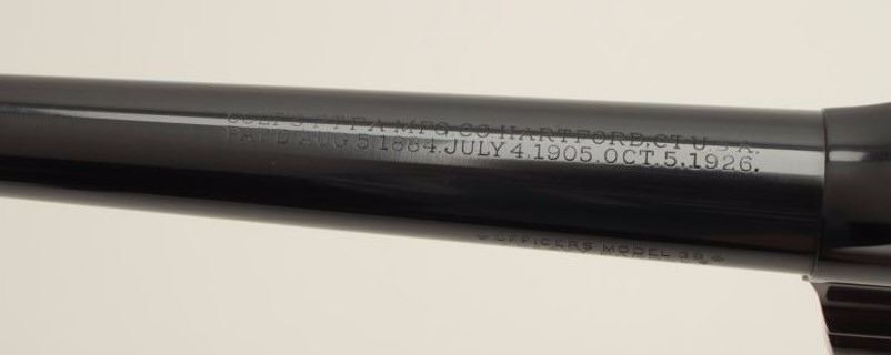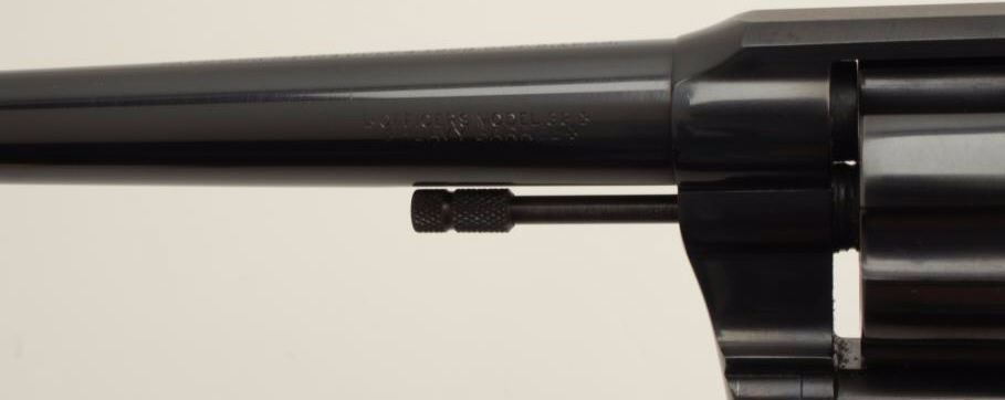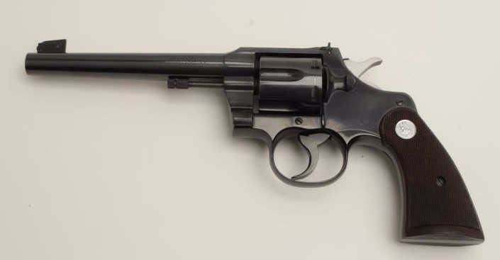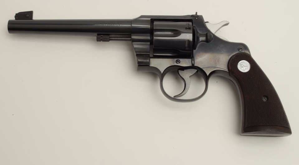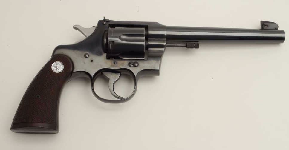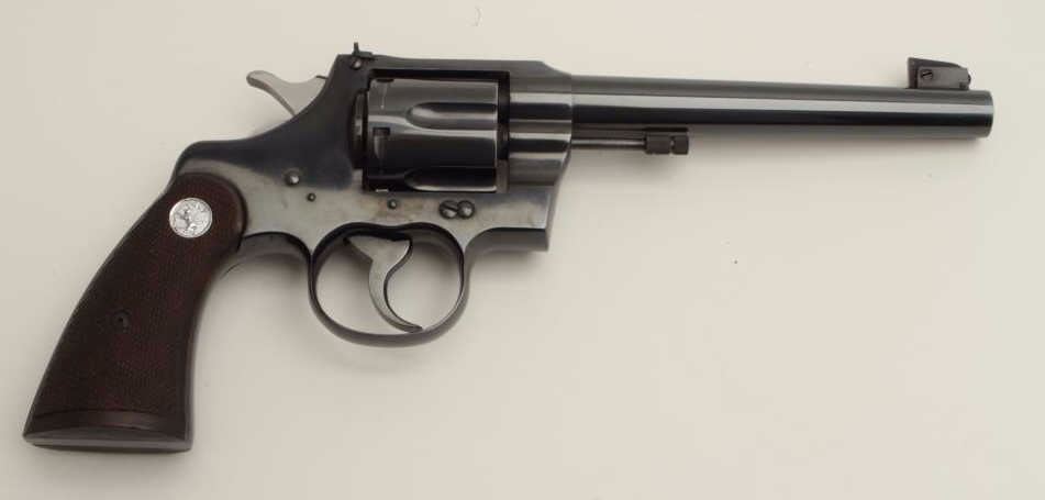Lot 886 Colt Officer’s Model flat top DA revolver, .38 caliber, 6” heavy barrel, blued finish, checkered w