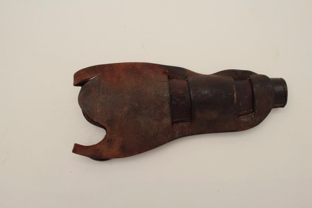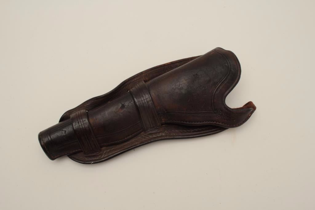 Early western double loop holster for a Colt Single Action marked _____Kelly, Salt Lake, Utah. The marking is partially worn and illegible. Plugged bottom and back cut down for easy of fast draw originally left hand or cross draw. Some wear, folding, use and small imperfections but good for its age (1880’s to 90’s) and absolutely genuine marking. Few Salt Lake marked holsters are known pre-dating 1900 in the western andpioneer era. Est.: $750-$1500