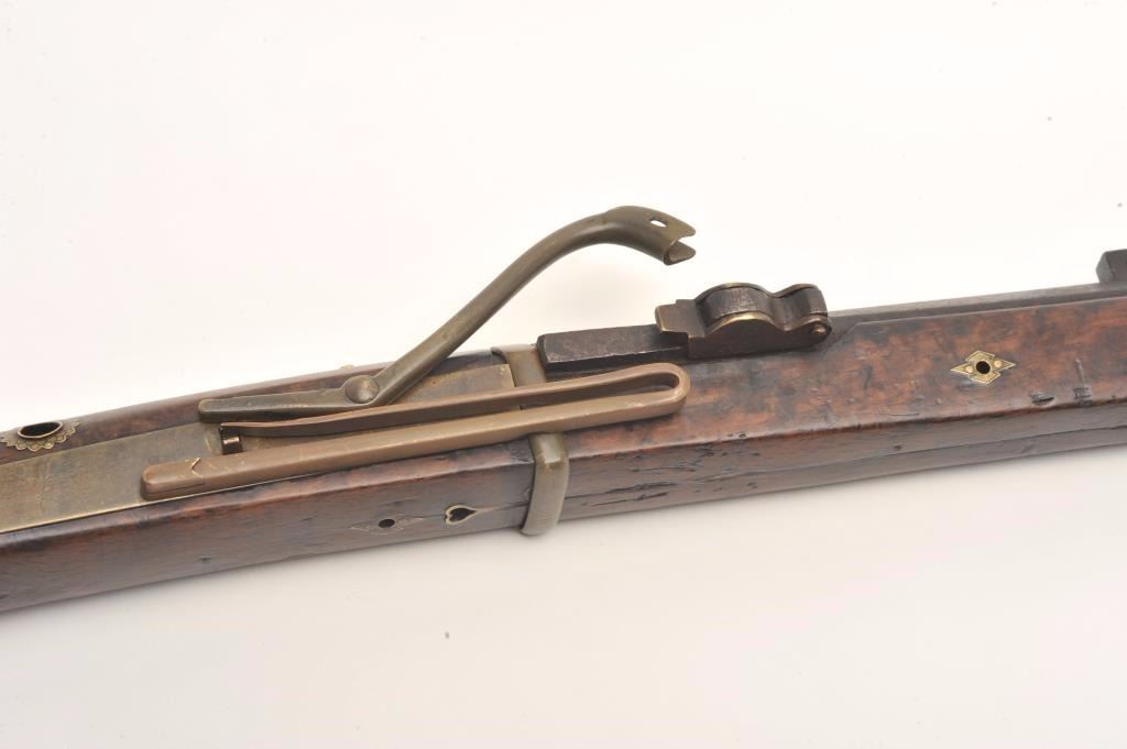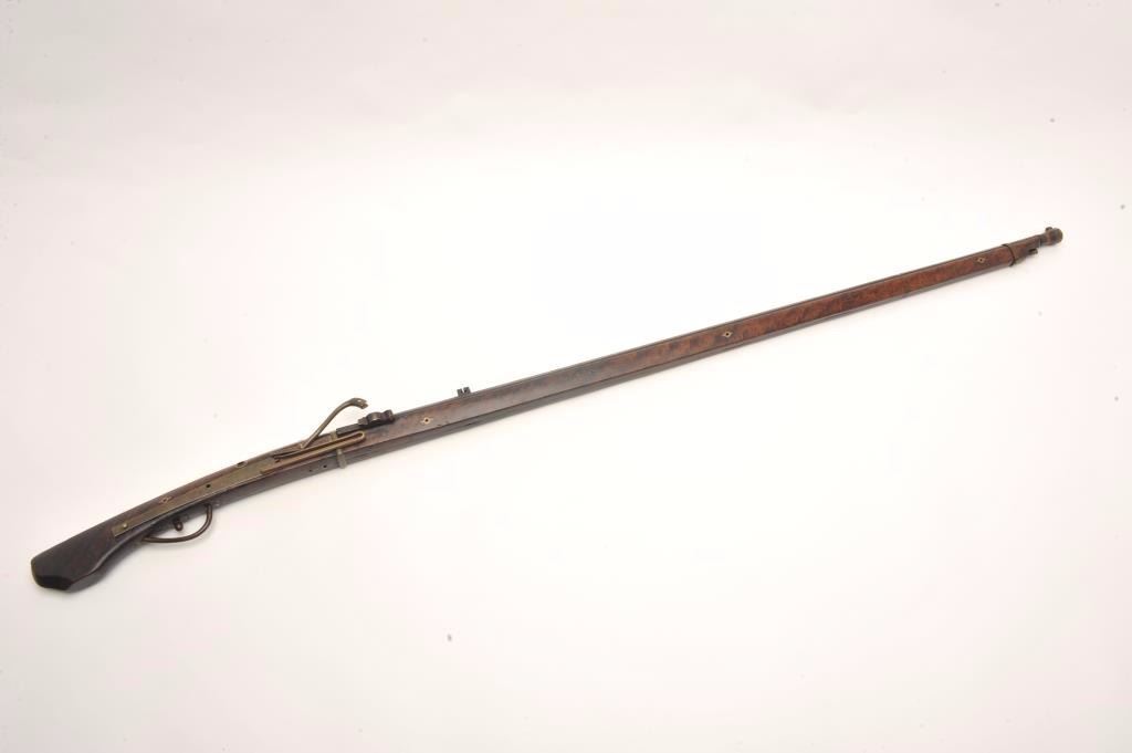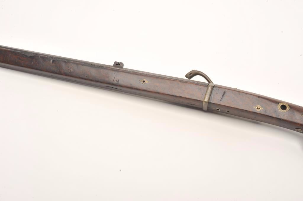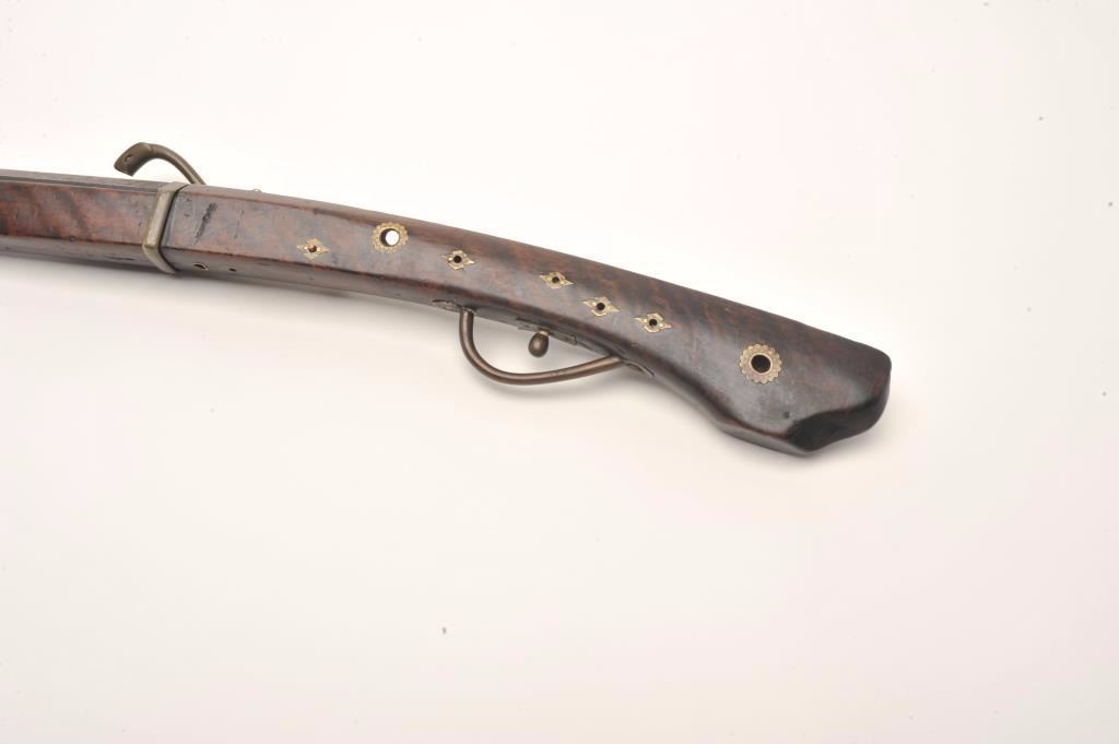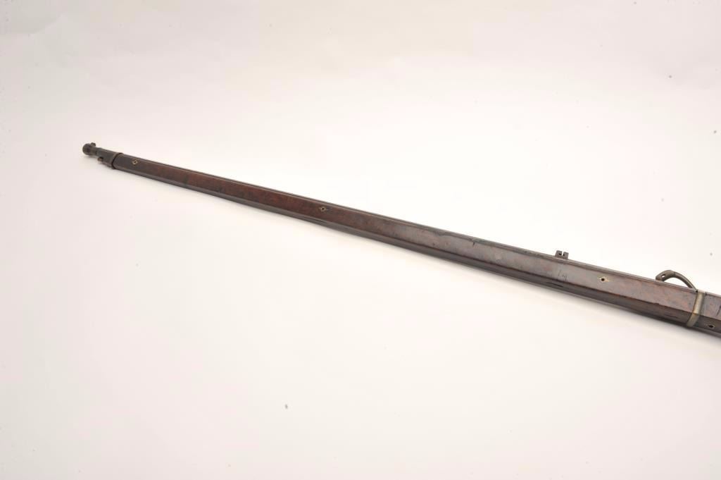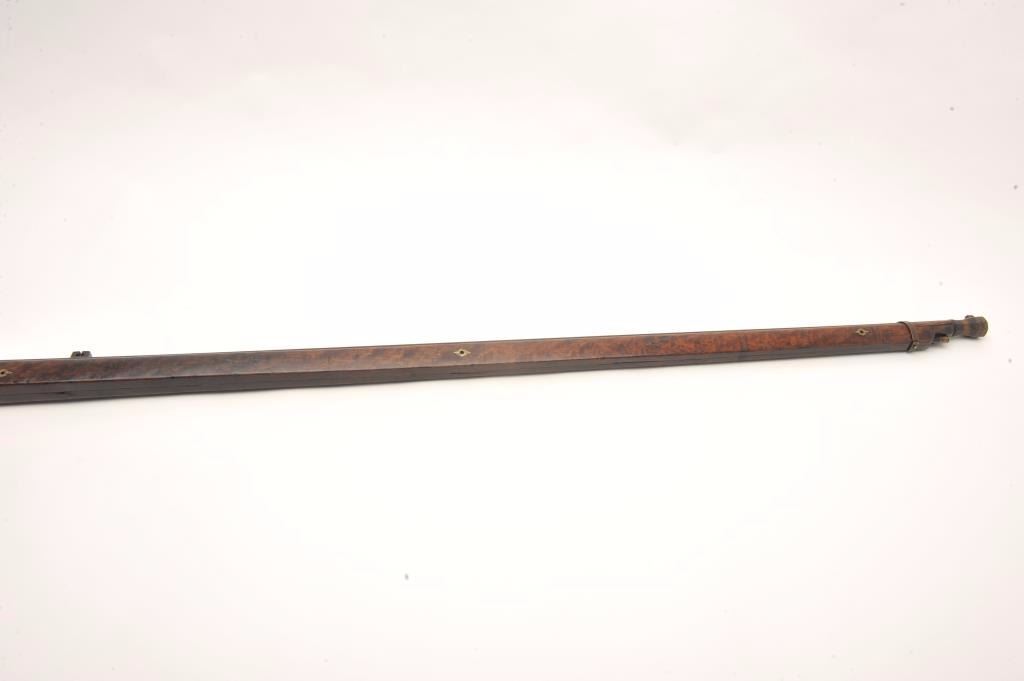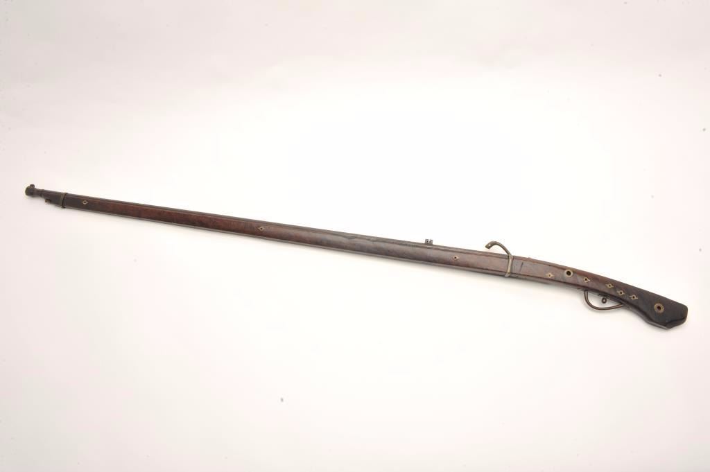 Lot 890 Japanese matchlock musket with thin and elegant barrel showing nicely flared muzzle. Measures 56”