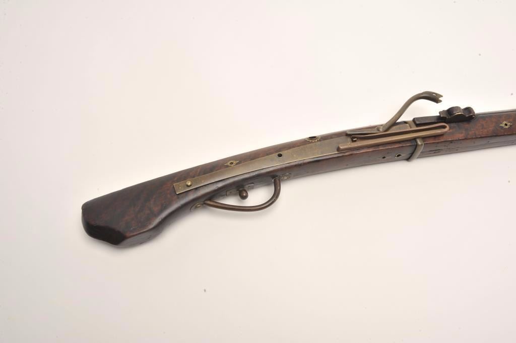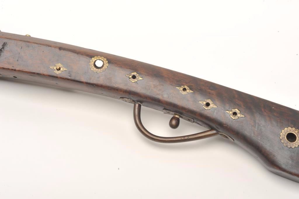Japanese matchlock musket with thin and elegant barrel showing nicely flared muzzle. Measures 56” overall with a 40 ½” barrel of .45 caliber smoothbore. Quality burl wood with some minor losses at the top edge andgood overall. Silver leaf and branch inlay in sections on the barrel. Minor pitting within brown patina. The spring is weak and not quite cocking. (Antique) Est.: $600-$1200