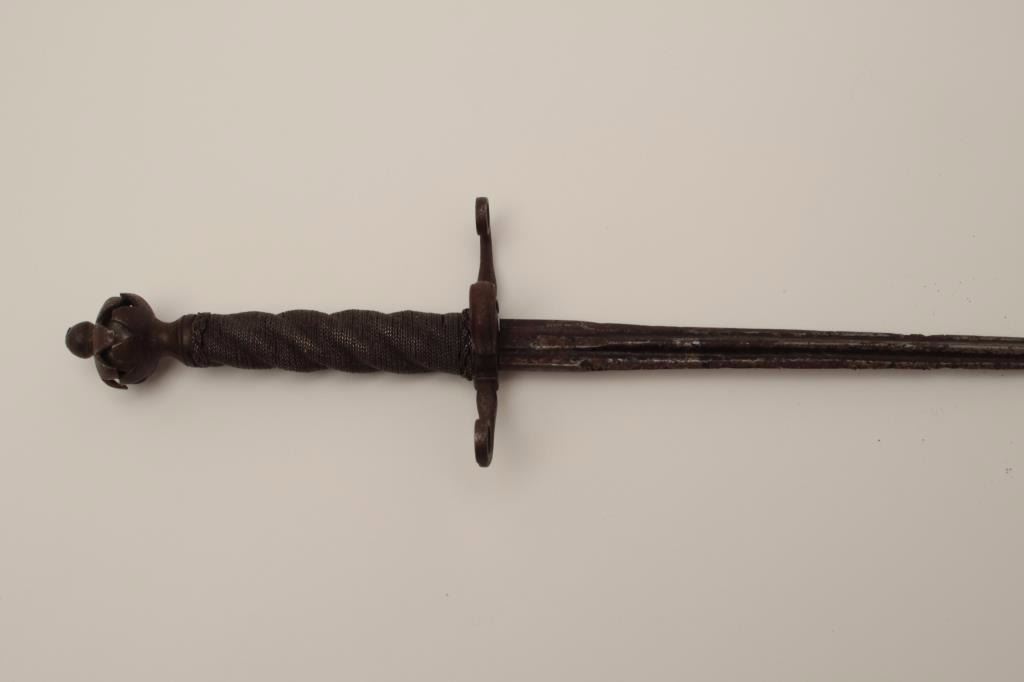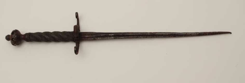 16th to 17th century all authentic left handed dagger in uncleaned and as found original condition. Measures 15 5/8” overall with a 10 ½” blade. The guard is nicely forged and pierced with large pierced pommel. Original turned wire wrapped grip with 4 sided blade and reinforced ricasso. Some heavy pitting on the blade and moderate pitting on mounts. A miracle to find this dagger in “untouched” out of the atticcondition. Recently discovered in France and has a French style. Est.: $500-$1000+