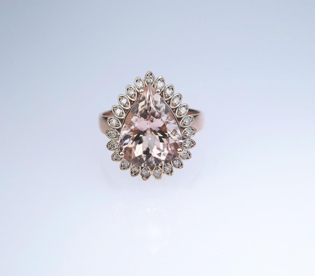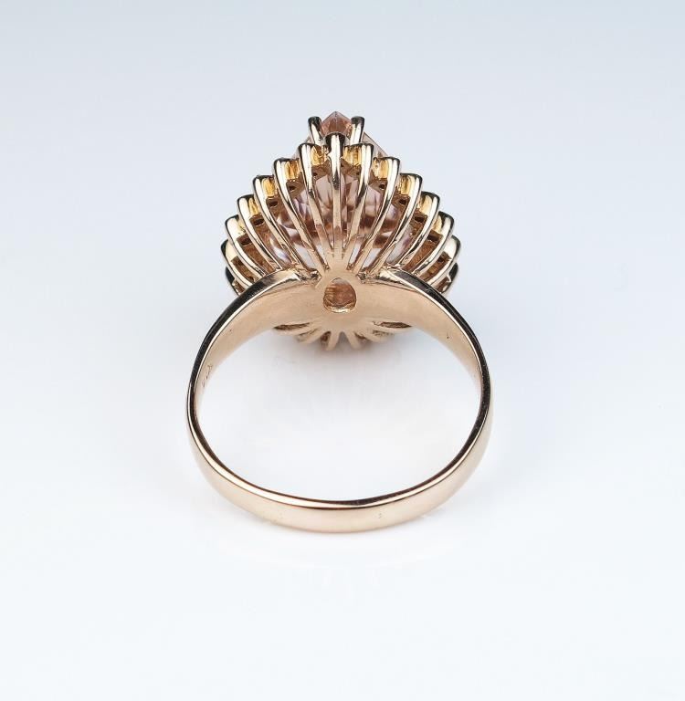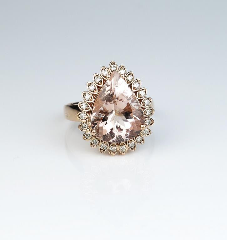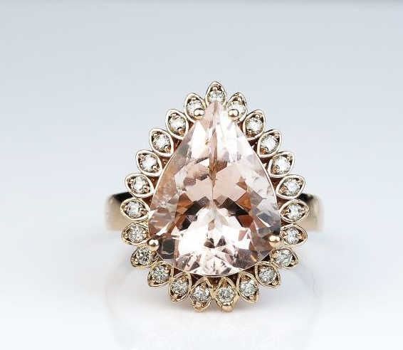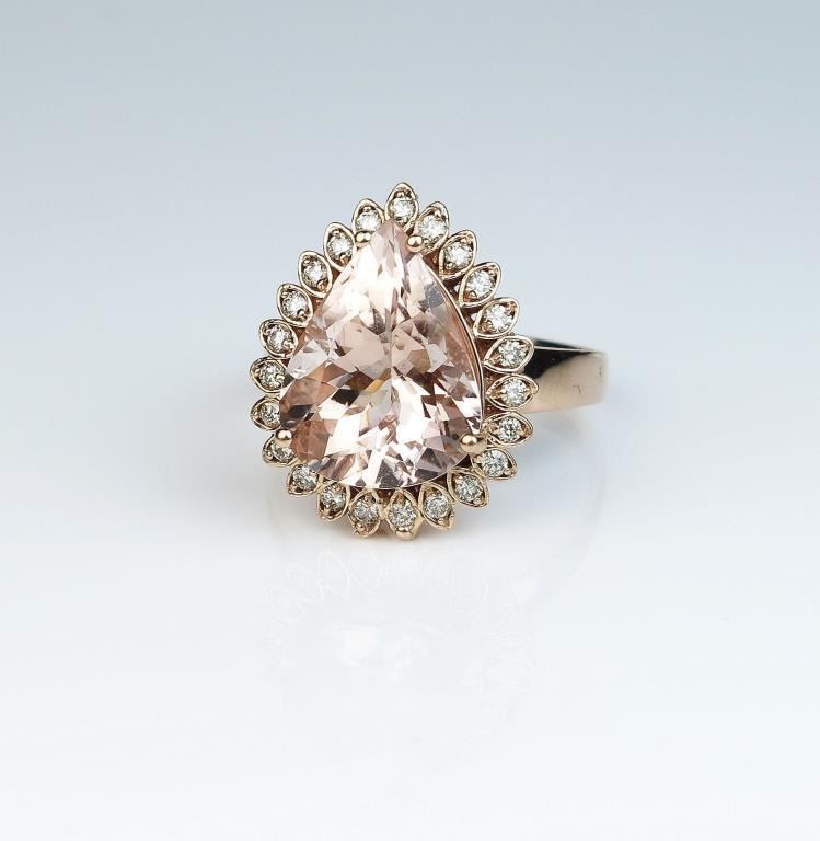 Incredible Morganite ring featuring a fine Morganite weighing approx. 8.00-10.00 carats and surrounded by 24 fine cut diamonds weighing approx. 0.50 carats of H-I colors and VS clarity set in a gorgeous 14 karatrose gold setting. Retail $6,000-$7,000 Estimates $3,000-$4,000