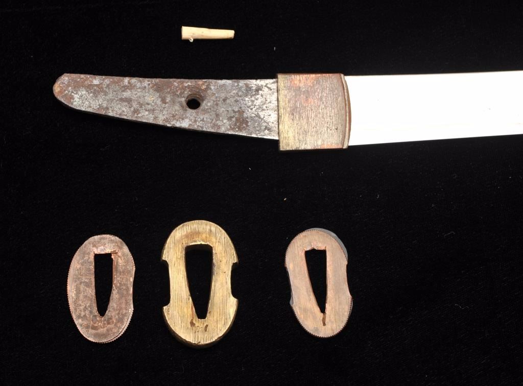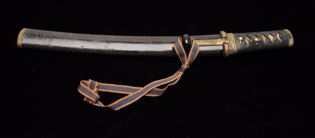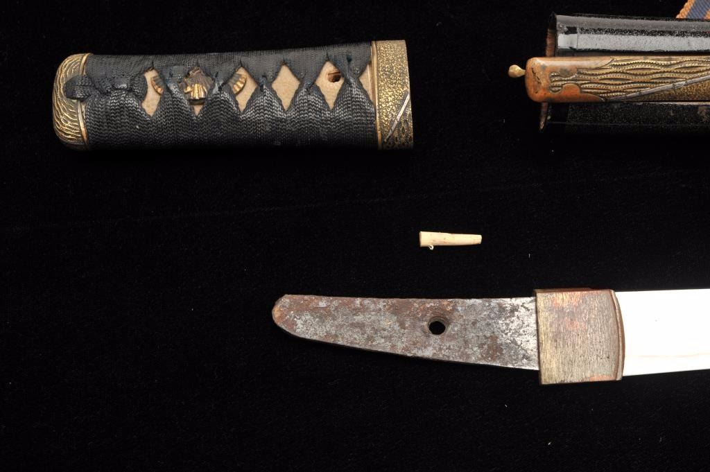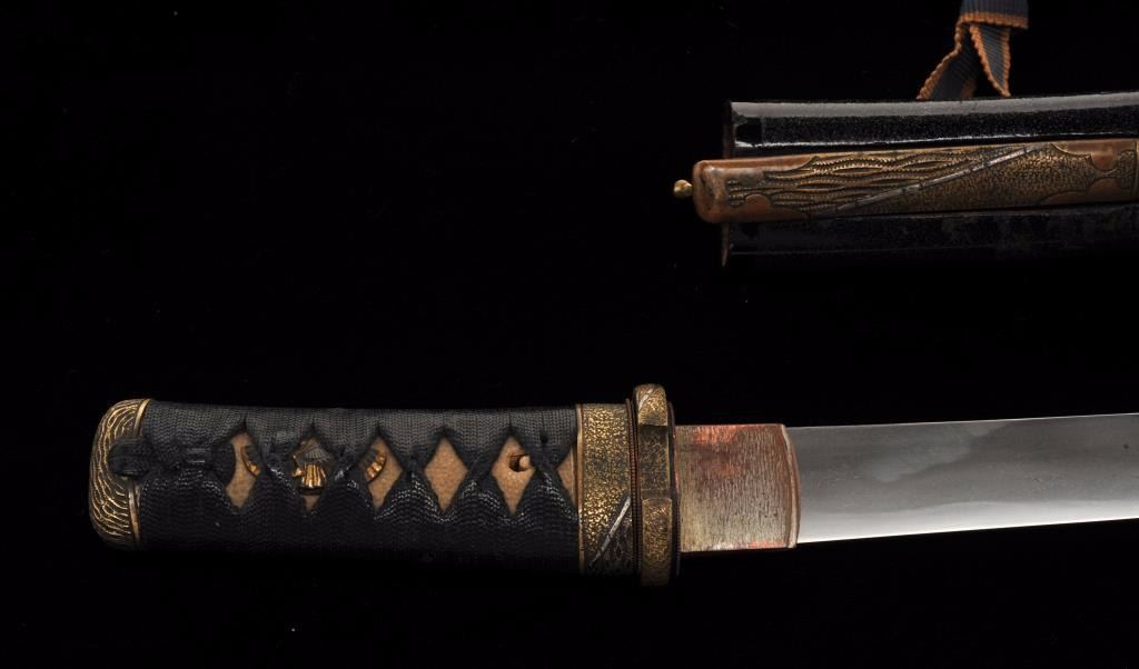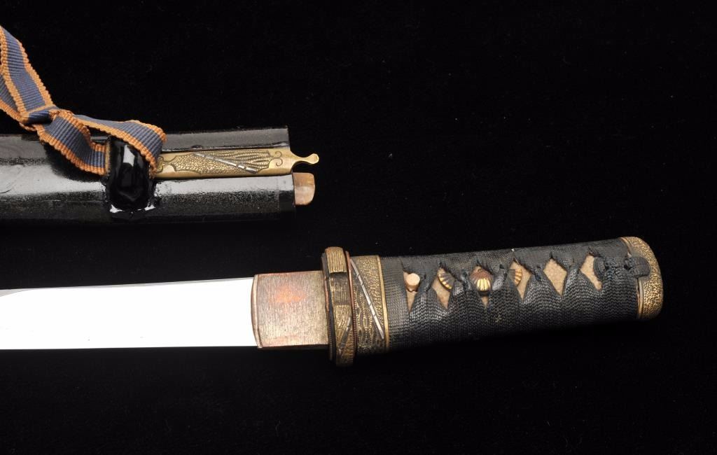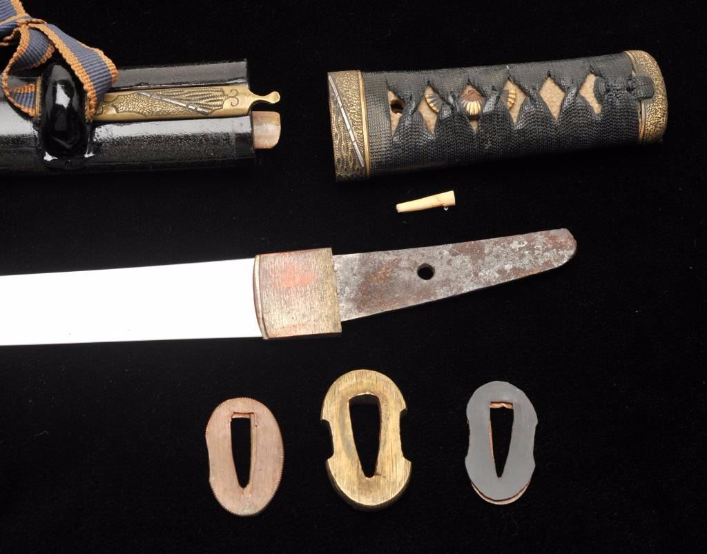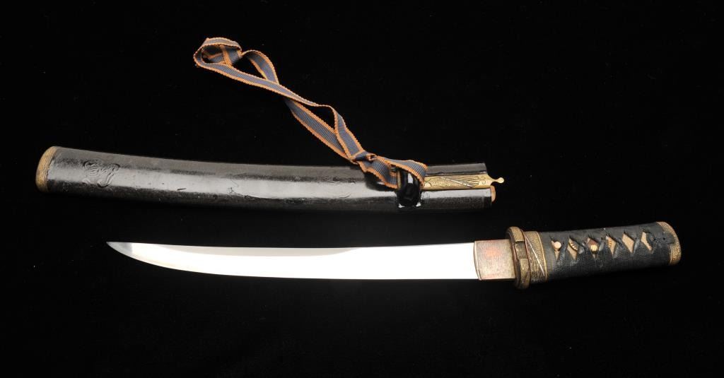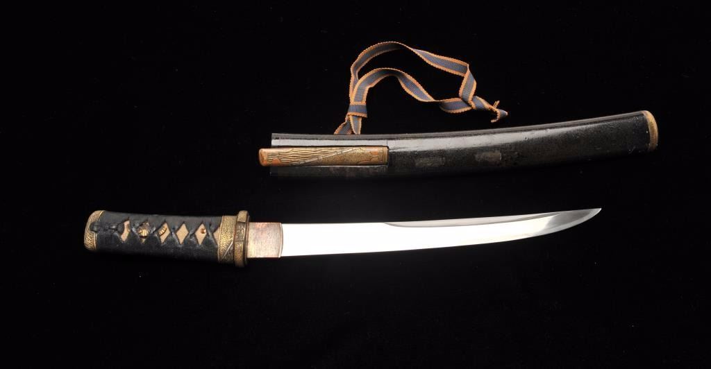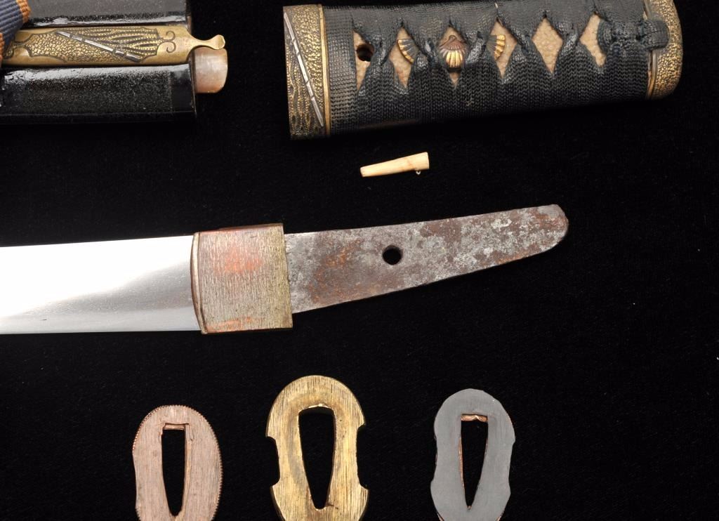 Lot 909 Koto period tanto in traditional full mounting retaining kozuka knife and kogai. 10” blade (Unsign