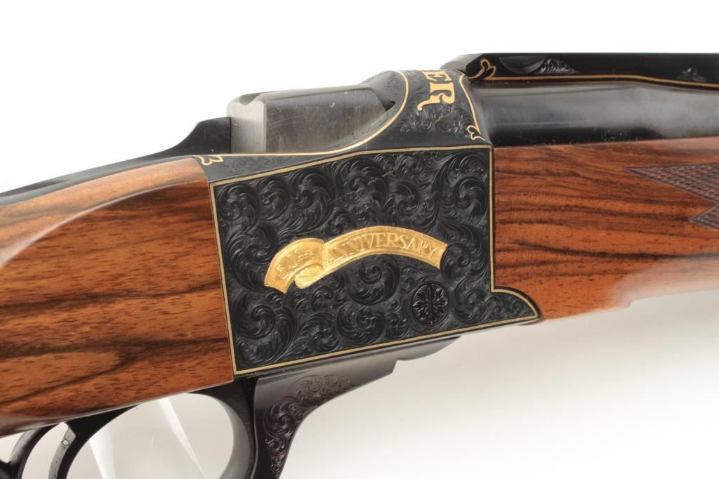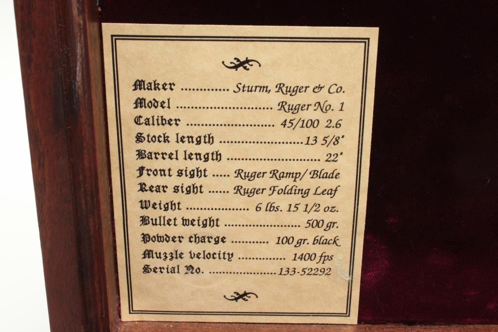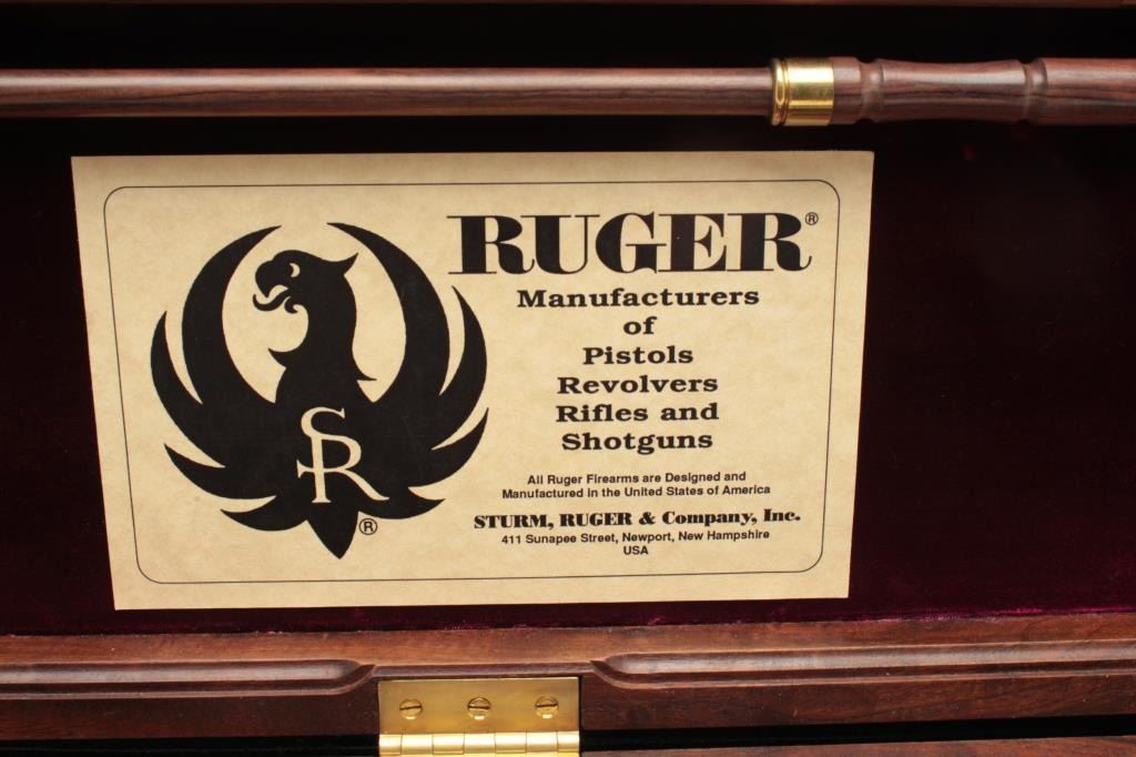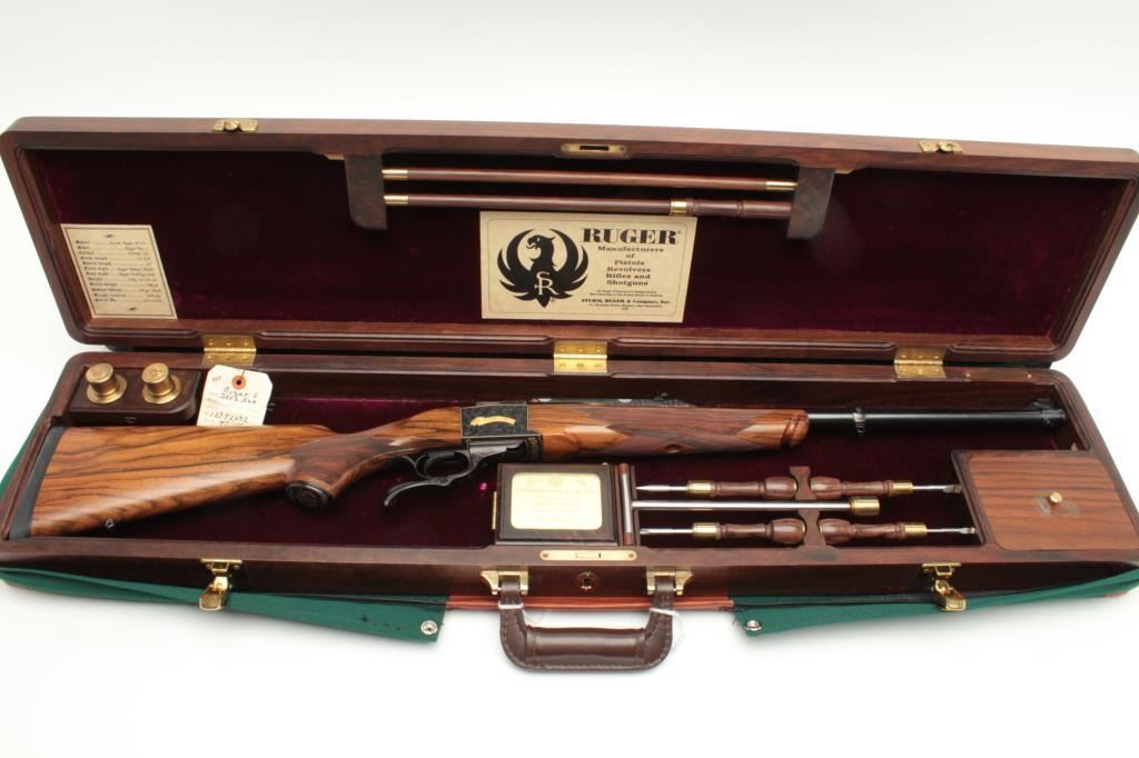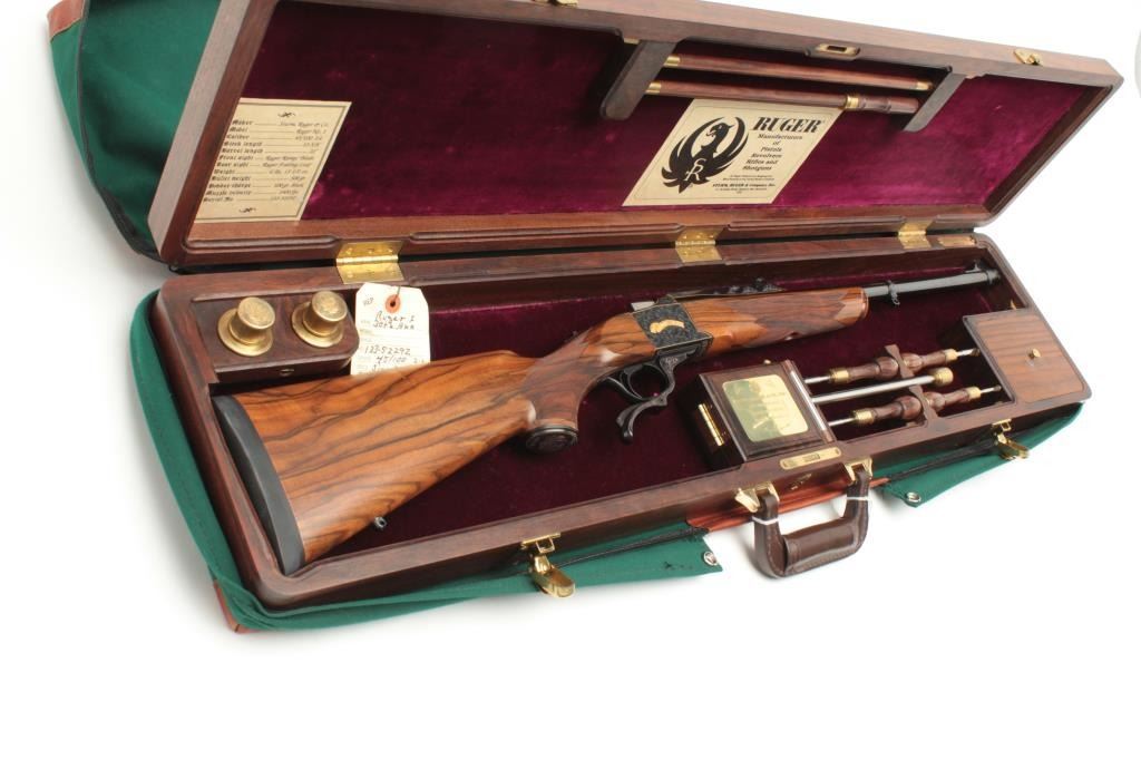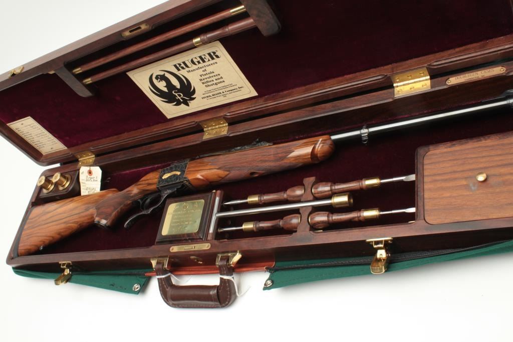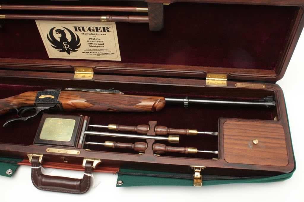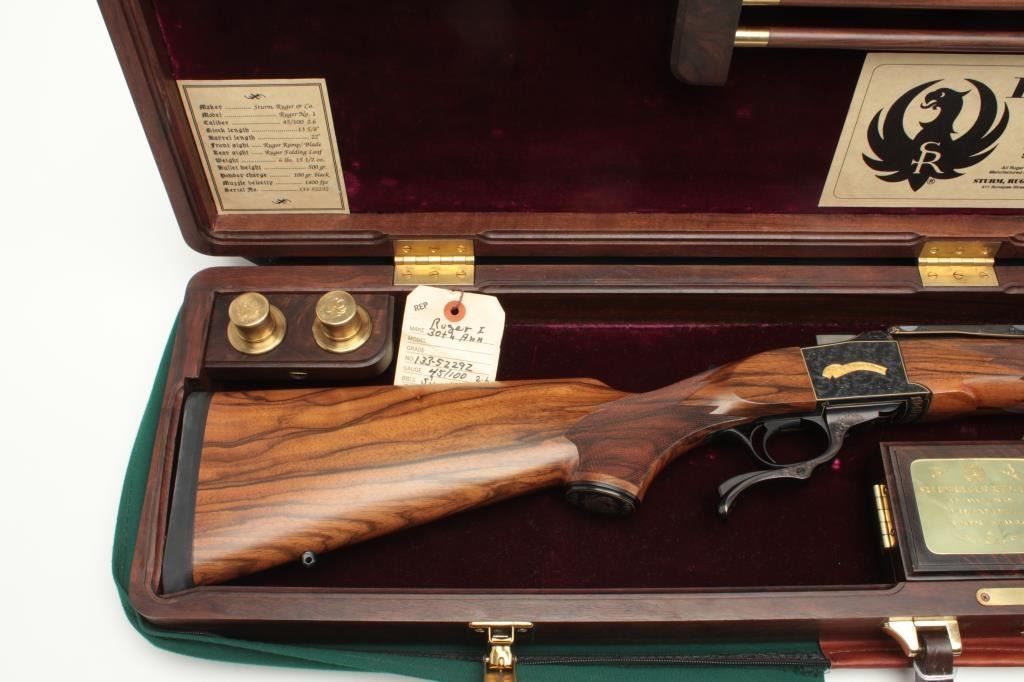 Ruger No. 1 rifle, special exhibition grade, .45-100 caliber, 2.6” case, 22” barrel, serial #133-52292. Fully and finely engraved and gold inlaid in presentation quality case by Double Gun Cases, Farmington NH. The information in lid reads 13-5/8” stock, 22” barrel, rampant blade front sight, Ruger folding leaf rear sight, 6lbs 15-1/2” oz, 500grain bullet, 100 grains of blackpowder, muzzle velocity 1400 foot pounds. The rifle shows finely engraved scrolls on left side of receiver with William B. Ruger engraved in gold banner on left center of frame. Ruger name in gold on breech. 50th anniversary on center of right side of frame. The bottom of frame shows date “1949-1999”. The grip cap is engraved and gold inlaid with Ruger trademark. The remainder of the frame is flush gold inlaid borders, the sight rib is engraved in gold inlay, the bands in barrel and muzzle are engraved and the muzzle shows a gold inlaid band. The rifle is stocked in select grain walnut, beautifully engraved and hand checkered with beautifully made recoil pad. The rifle shows no evidence of firing and is virtually new in box. The case is beautifully constructed showing highest quality attention to detail and hardwood exterior, fancy gold plated brass hardware, full accessory package, many of which are engraved and gold inlaid with rods and accessories. The lid of the case shows a gold owners plaque engraved with the letter “R”. By oral tradition, this No. 1 was made for the man, Bill Ruger himself. Mr. Robert Petersen knew Bill Ruger personally and it’s possible that he obtained the rifle from Bill Ruger, although we have no documentation to that effect. In any case, a beautiful and elegant rifle. Last sold in the Robert Petersen estate. Est.: $7,500-$15,000