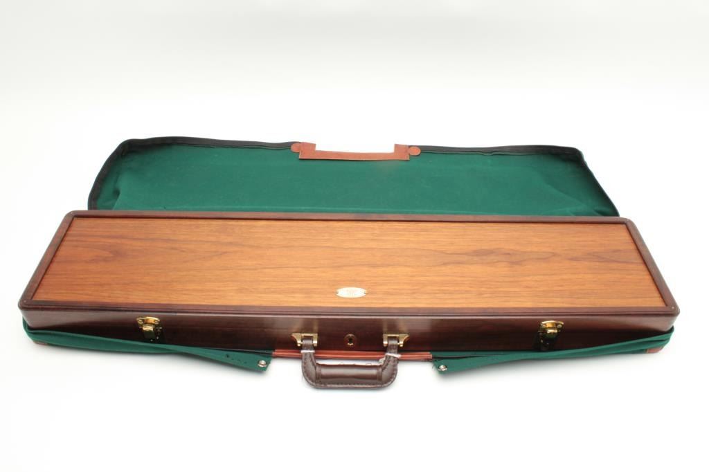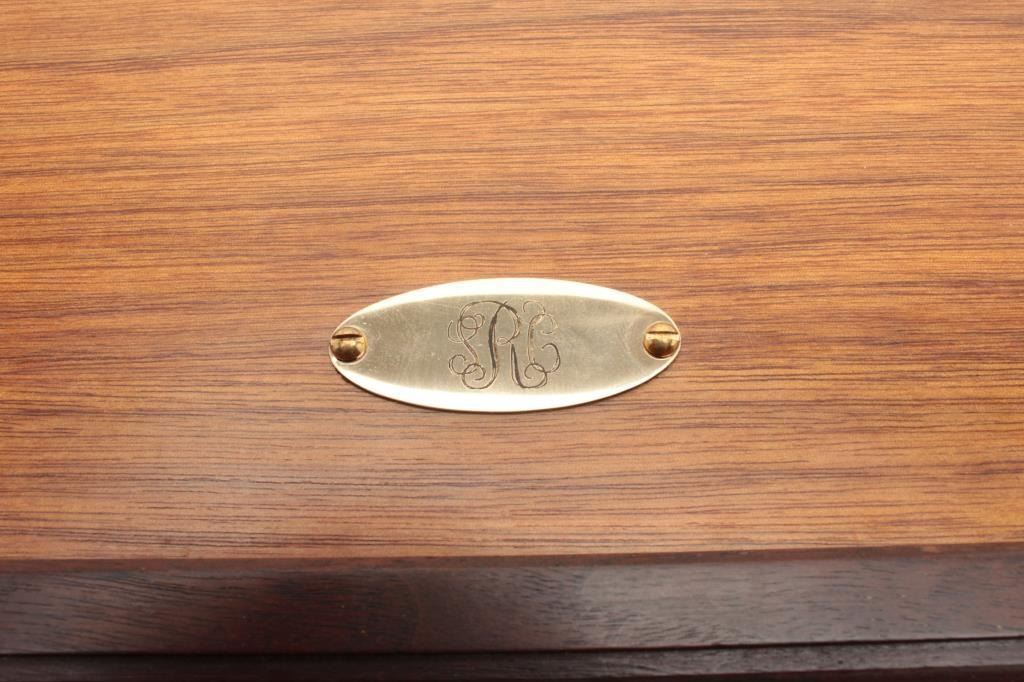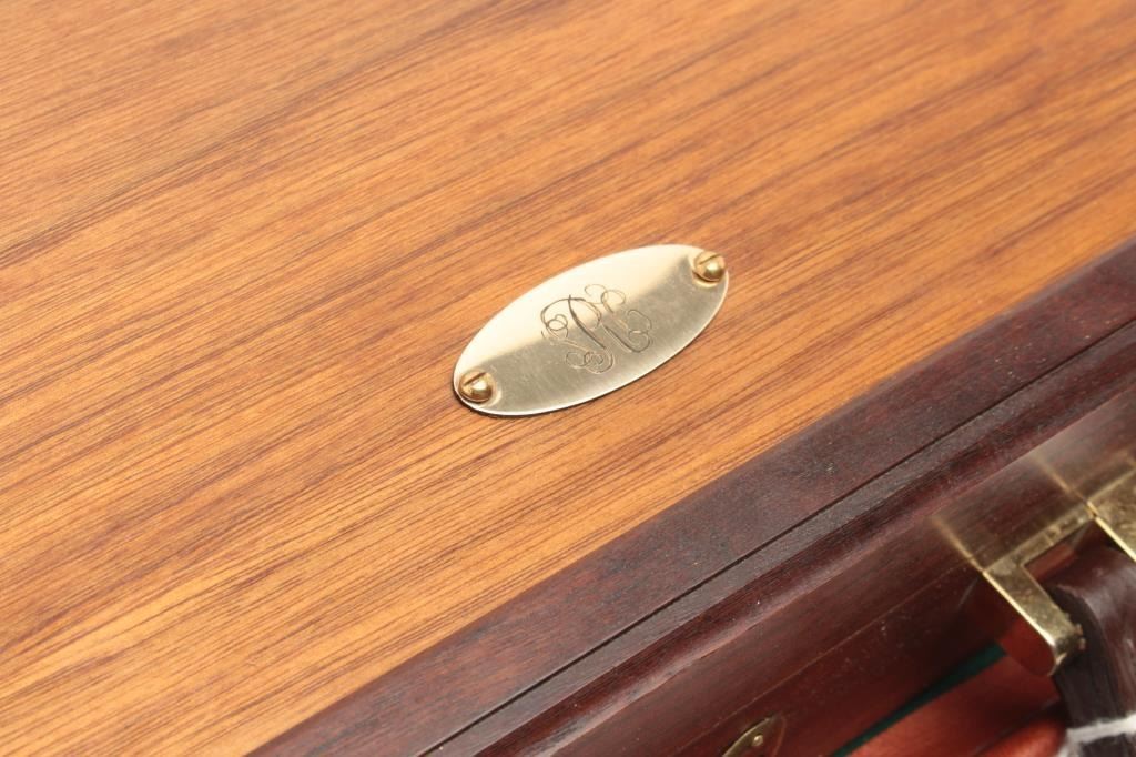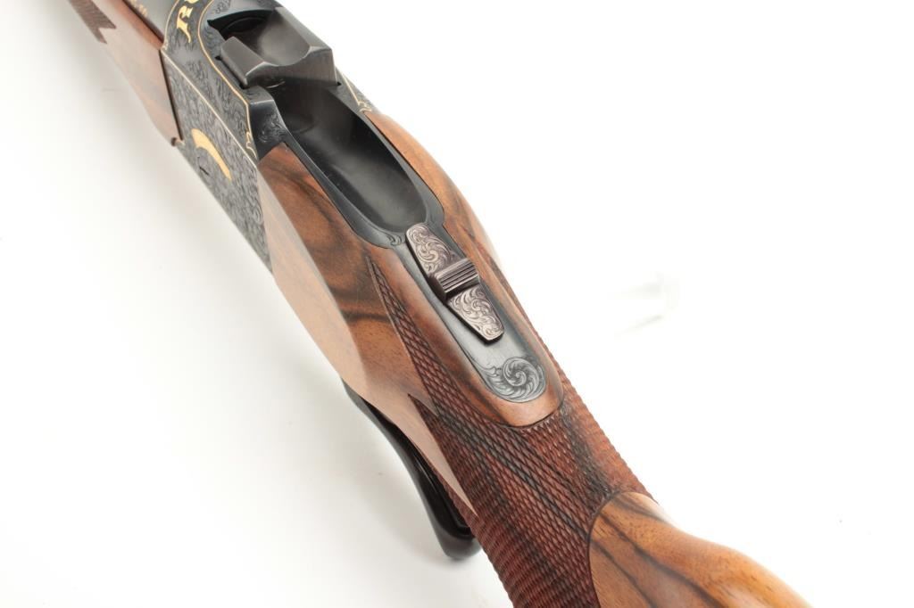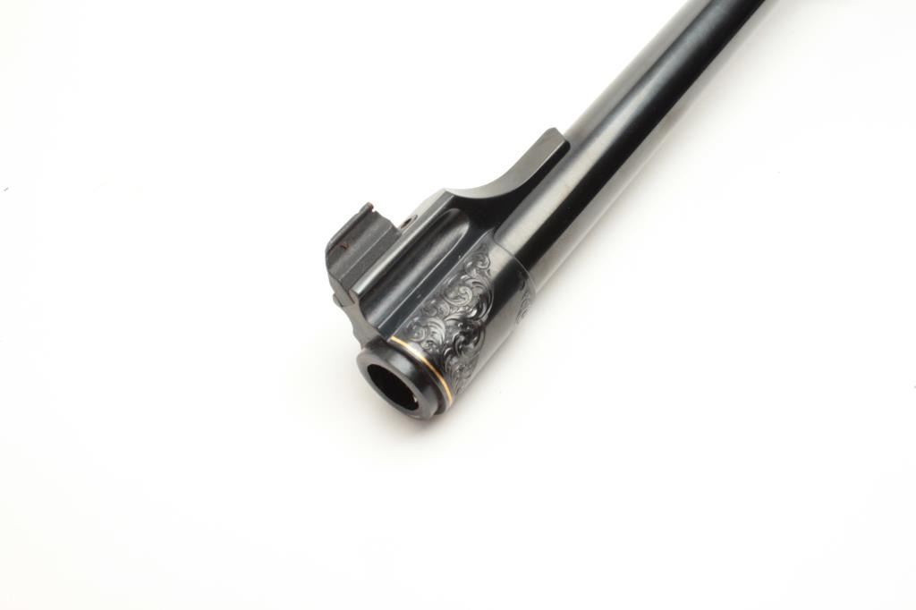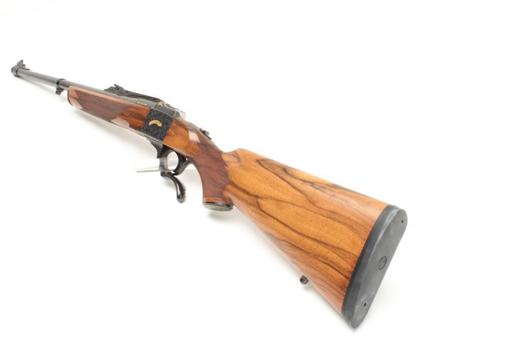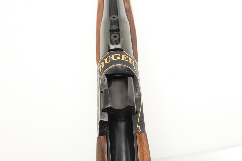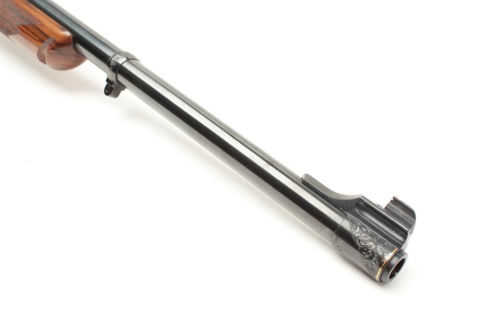 Ruger No. 1 rifle, special exhibition grade, .45-100 caliber, 2.6” case, 22” barrel, serial #133-52292. Fully and finely engraved and gold inlaid in presentation quality case by Double Gun Cases, Farmington NH. The information in lid reads 13-5/8” stock, 22” barrel, rampant blade front sight, Ruger folding leaf rear sight, 6lbs 15-1/2” oz, 500grain bullet, 100 grains of blackpowder, muzzle velocity 1400 foot pounds. The rifle shows finely engraved scrolls on left side of receiver with William B. Ruger engraved in gold banner on left center of frame. Ruger name in gold on breech. 50th anniversary on center of right side of frame. The bottom of frame shows date “1949-1999”. The grip cap is engraved and gold inlaid with Ruger trademark. The remainder of the frame is flush gold inlaid borders, the sight rib is engraved in gold inlay, the bands in barrel and muzzle are engraved and the muzzle shows a gold inlaid band. The rifle is stocked in select grain walnut, beautifully engraved and hand checkered with beautifully made recoil pad. The rifle shows no evidence of firing and is virtually new in box. The case is beautifully constructed showing highest quality attention to detail and hardwood exterior, fancy gold plated brass hardware, full accessory package, many of which are engraved and gold inlaid with rods and accessories. The lid of the case shows a gold owners plaque engraved with the letter “R”. By oral tradition, this No. 1 was made for the man, Bill Ruger himself. Mr. Robert Petersen knew Bill Ruger personally and it’s possible that he obtained the rifle from Bill Ruger, although we have no documentation to that effect. In any case, a beautiful and elegant rifle. Last sold in the Robert Petersen estate. Est.: $7,500-$15,000