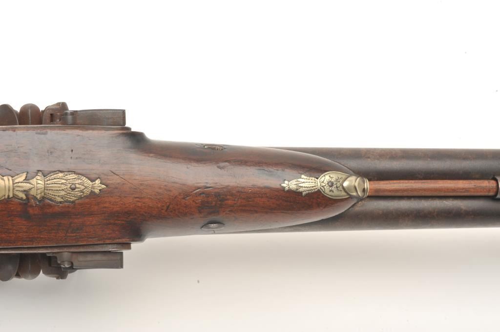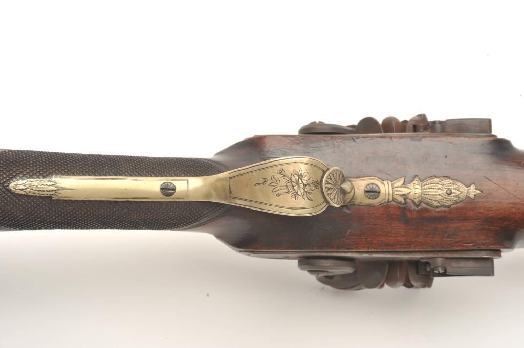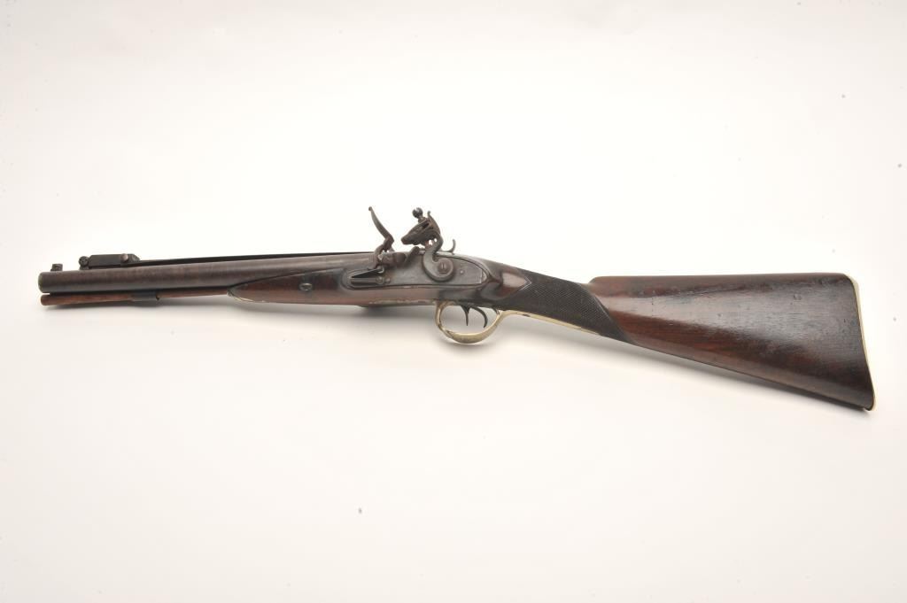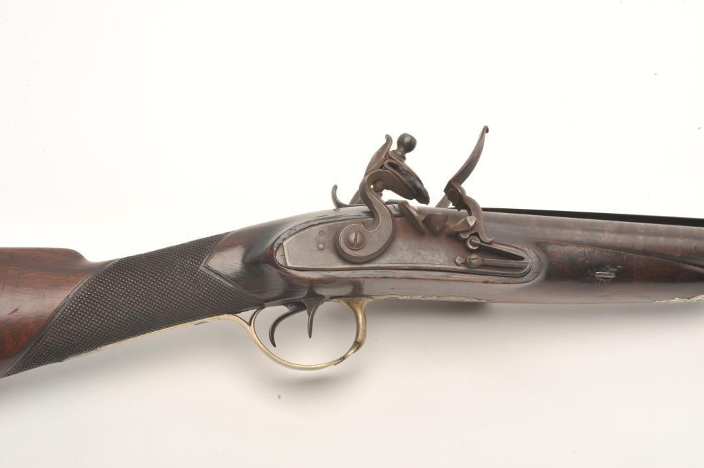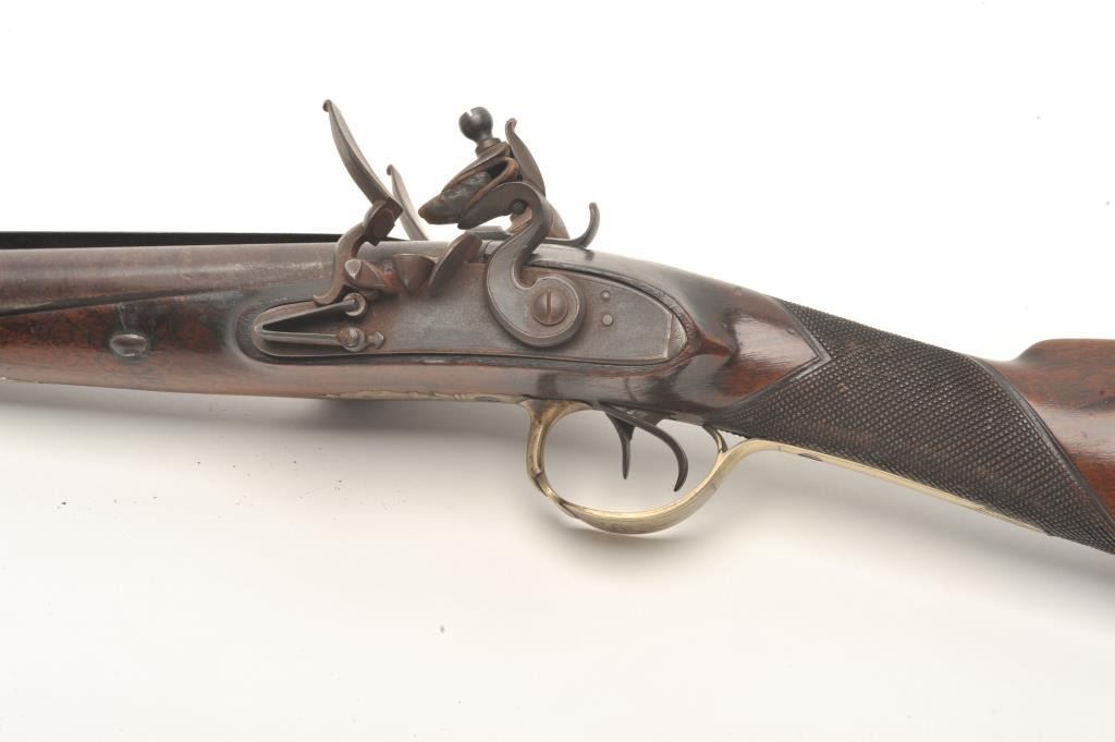 Double barrel flintlock coach gun with snap bayonet signed in gold on the barrels “Keel & Co., Patent”. The barrel measures 30” of .70 caliber smoothbore with half stock and center mounted bayonet released by thumblever. Engraved brass mounts with checkered wrist. Considerable original brown and case colors with light coating of rust and minor erosion along with minor scratches and wear to stock but at least very good overall. Ahigh quality and unusual flintlock arms circa 1810-1830s. (Antique) Est.: $5,000-$10,000