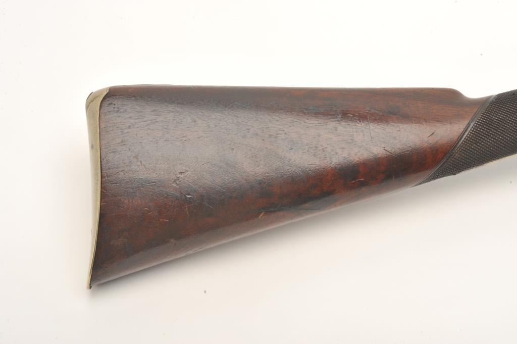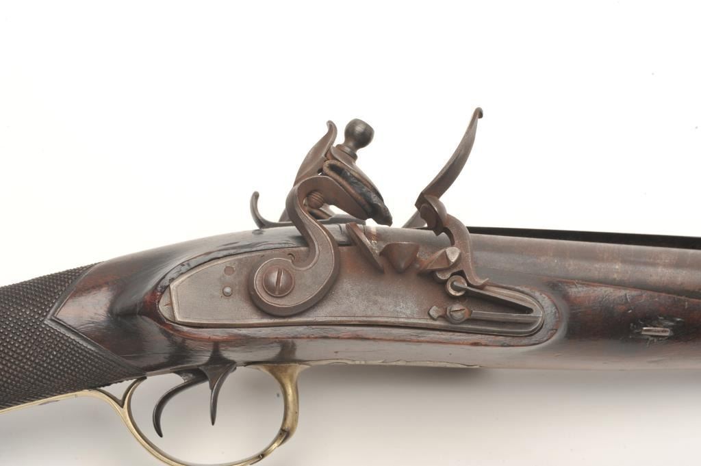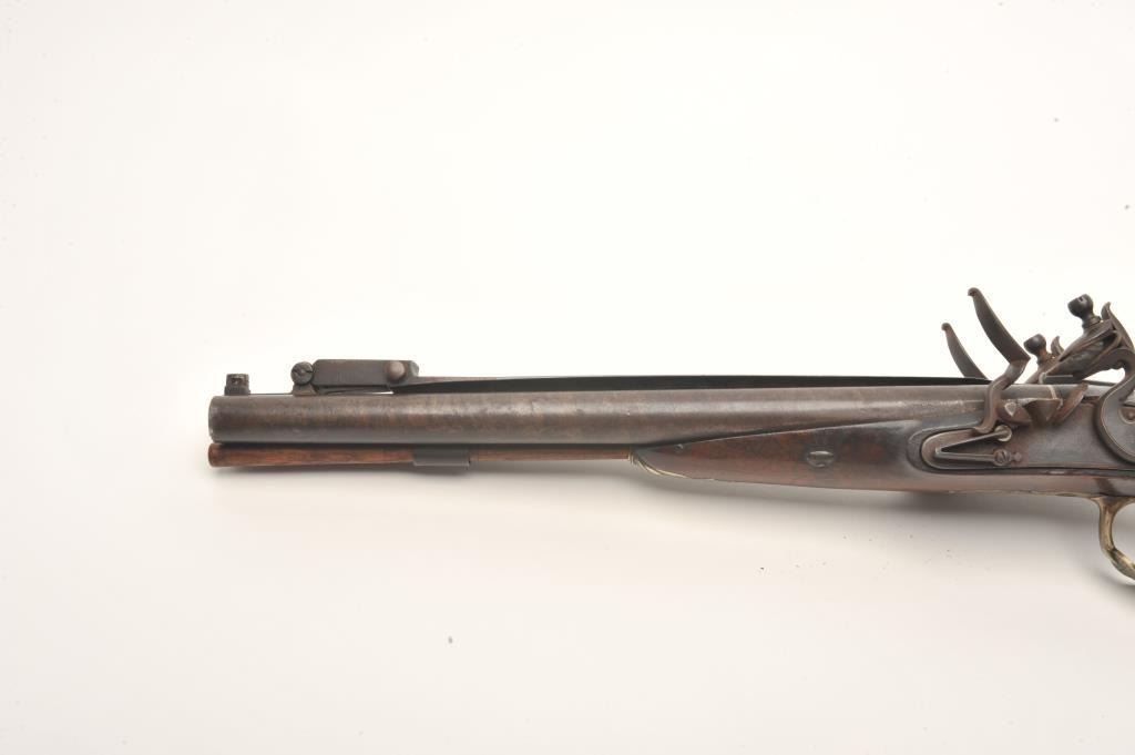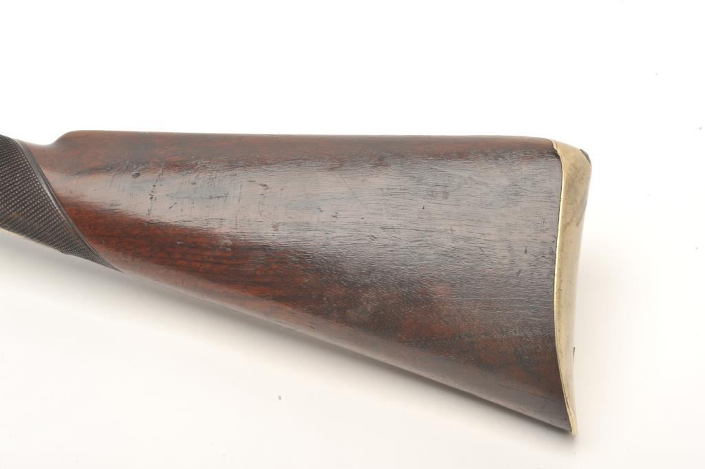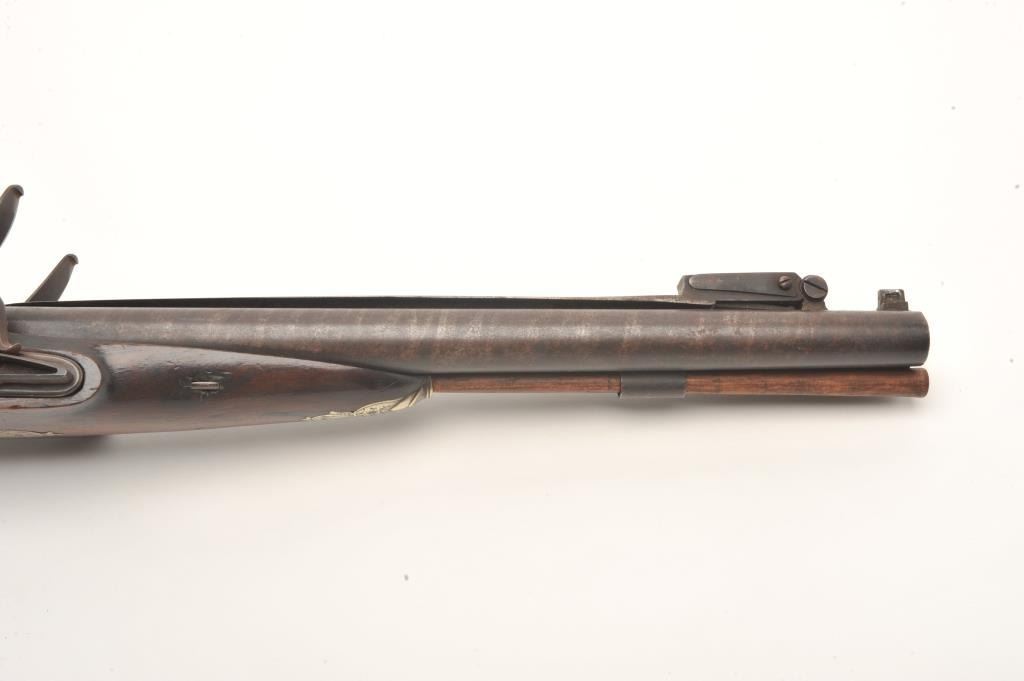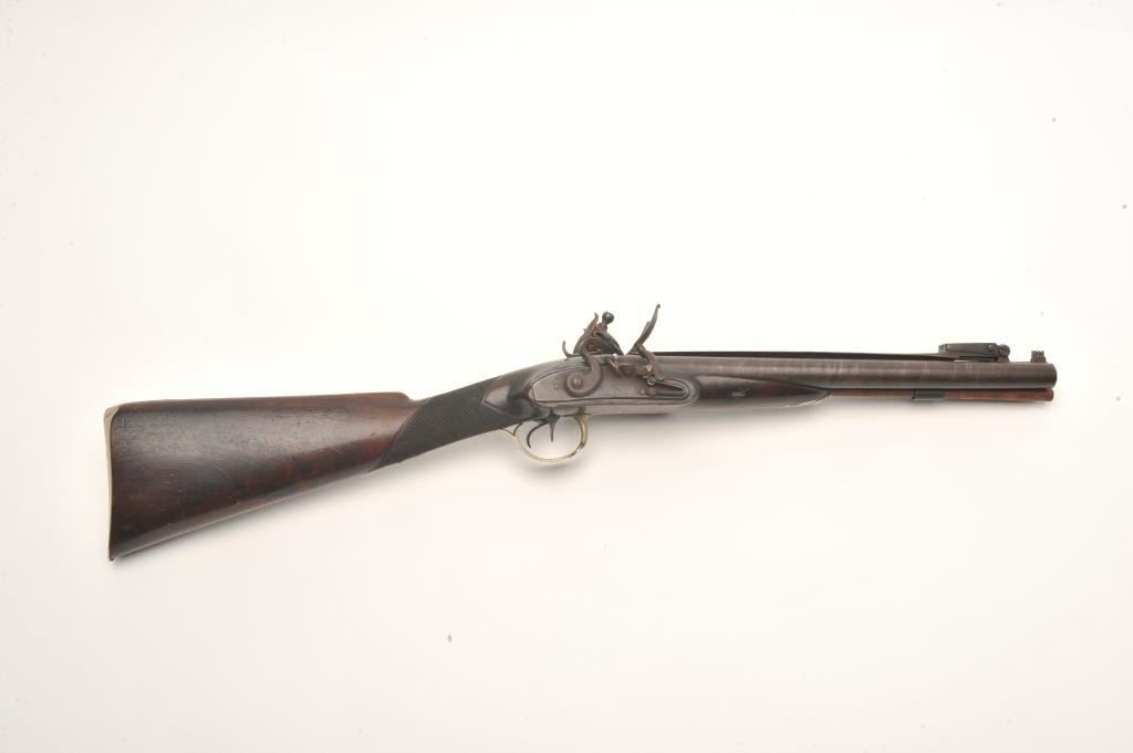 Double barrel flintlock coach gun with snap bayonet signed in gold on the barrels “Keel & Co., Patent”. The barrel measures 30” of .70 caliber smoothbore with half stock and center mounted bayonet released by thumblever. Engraved brass mounts with checkered wrist. Considerable original brown and case colors with light coating of rust and minor erosion along with minor scratches and wear to stock but at least very good overall. Ahigh quality and unusual flintlock arms circa 1810-1830s. (Antique) Est.: $5,000-$10,000