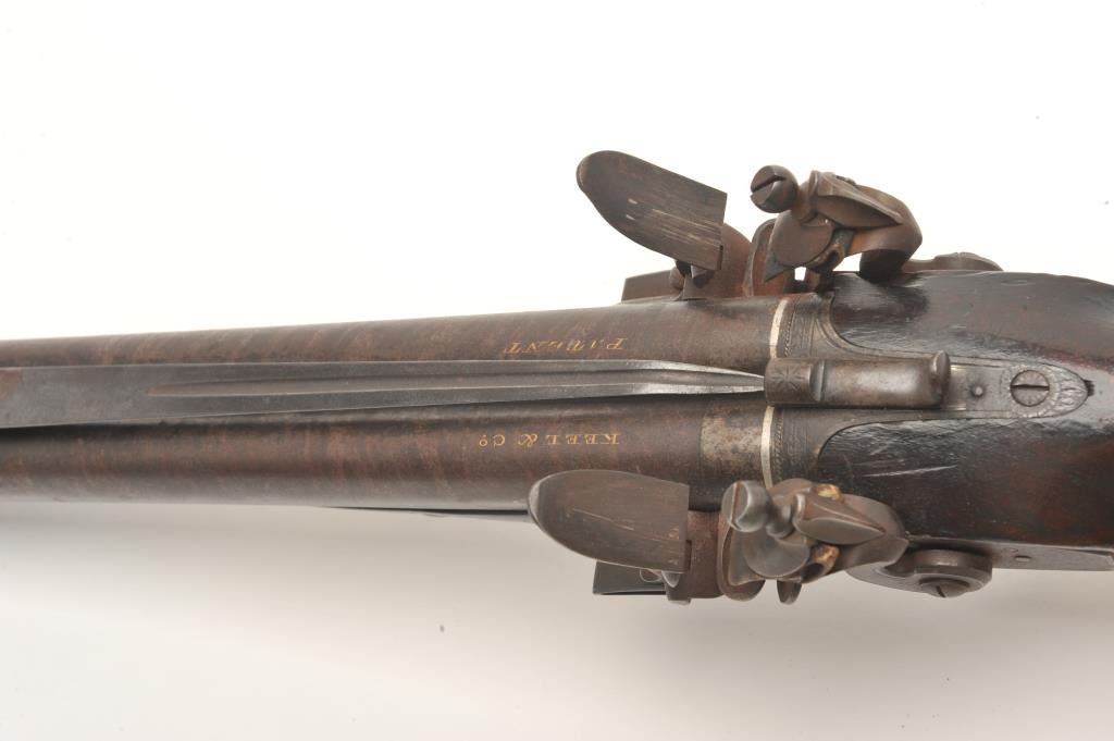 Lot 924 Double barrel flintlock coach gun with snap bayonet signed in gold on the barrels “Keel & Co., Pat