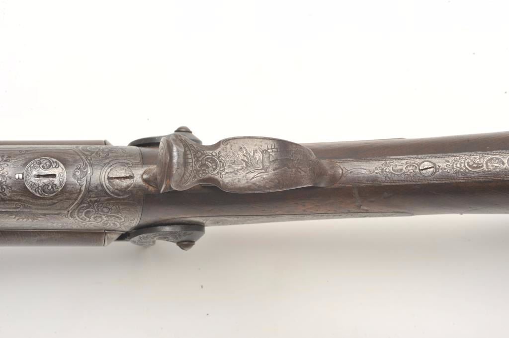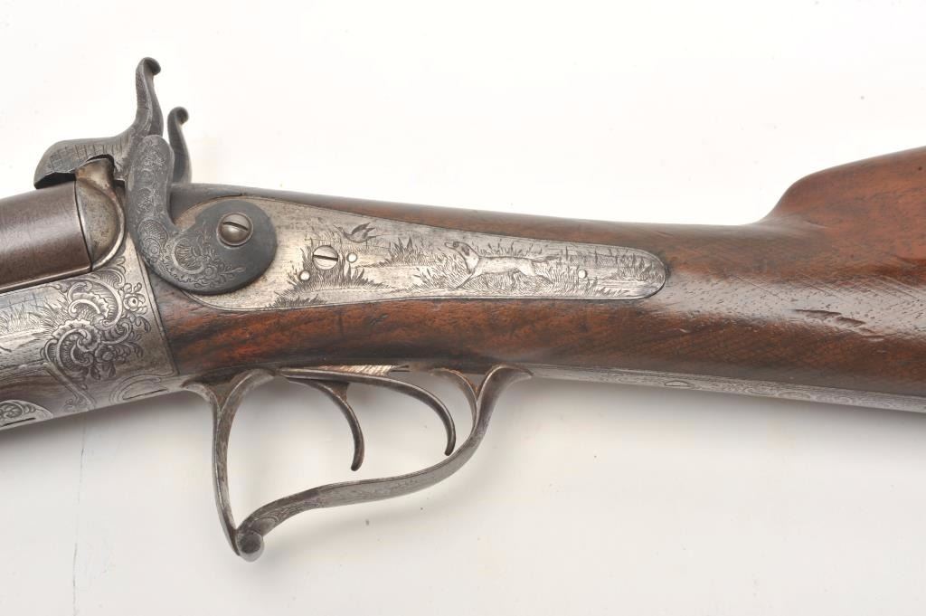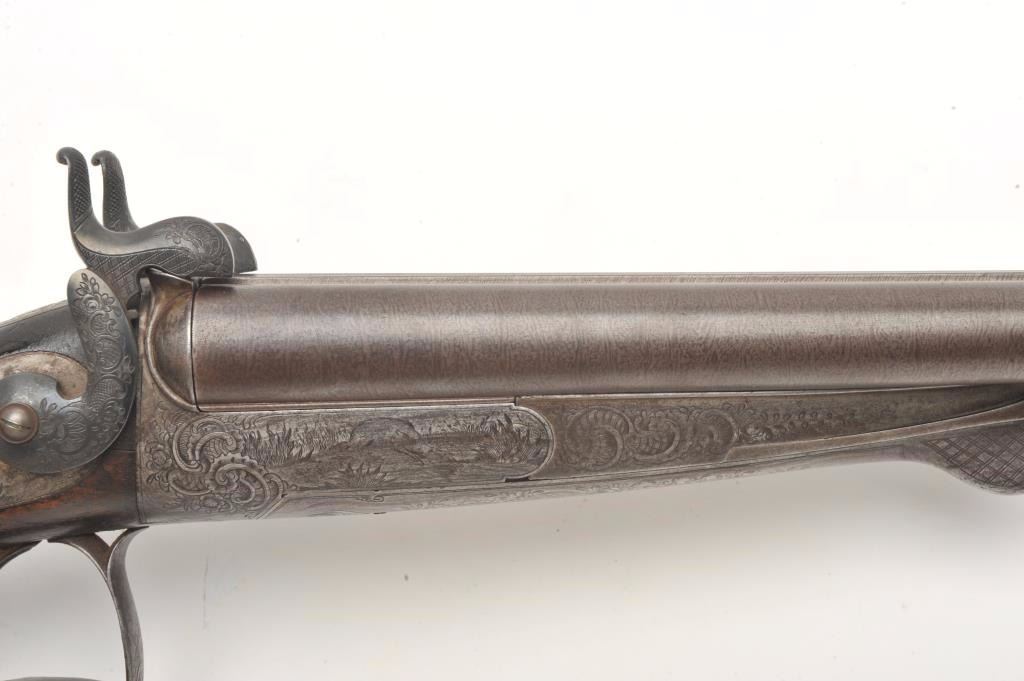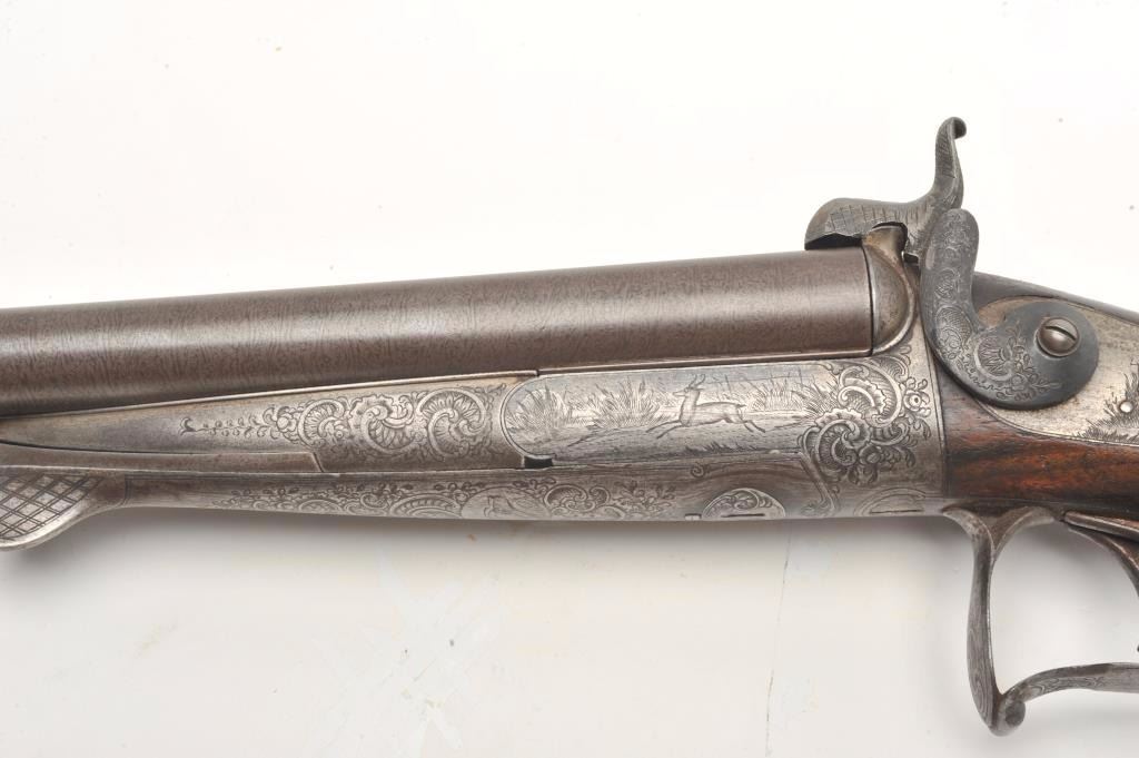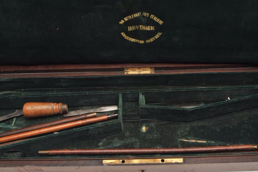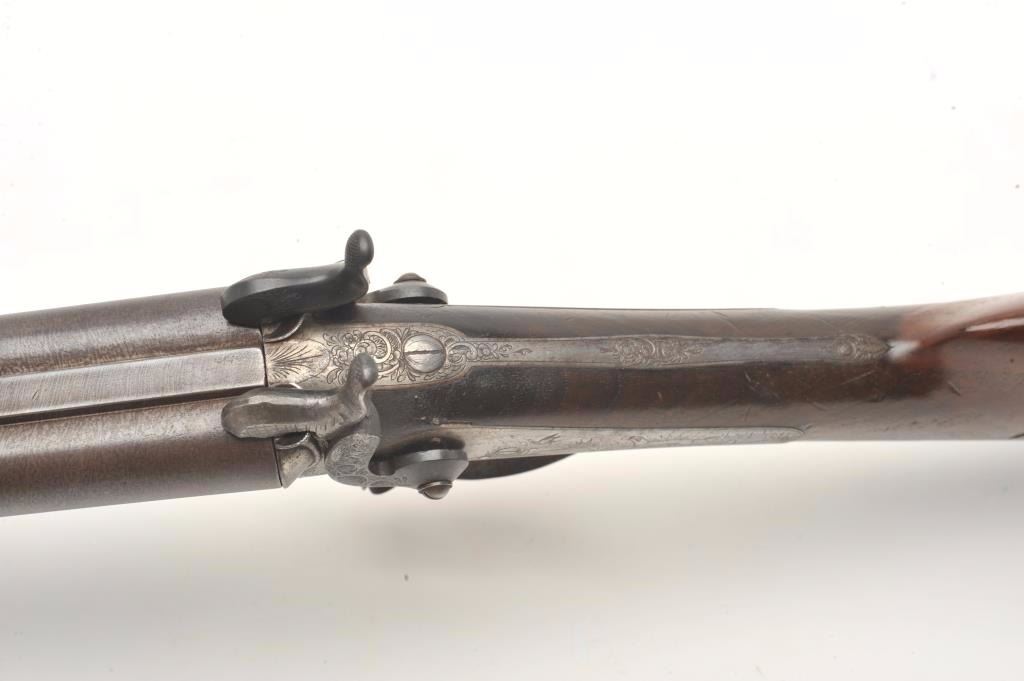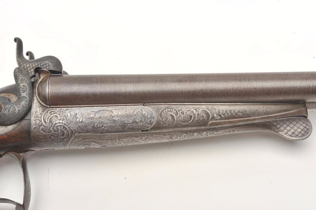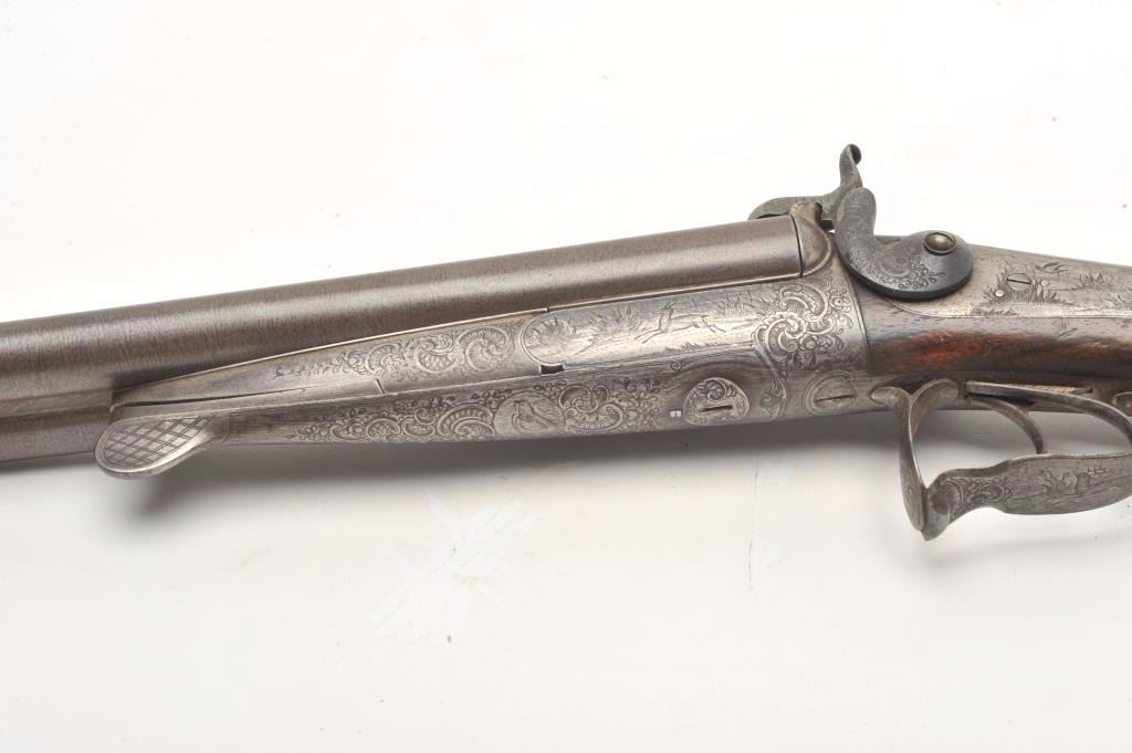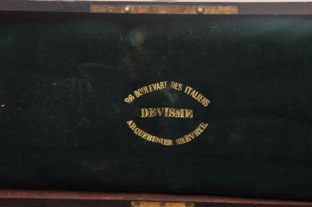 Lot 932 Devisme cased pinfire under lever SxS shotgun, 16 gauge, 24” Damascus barrels, engraved receiver,