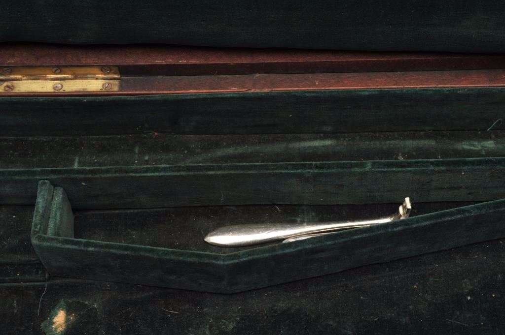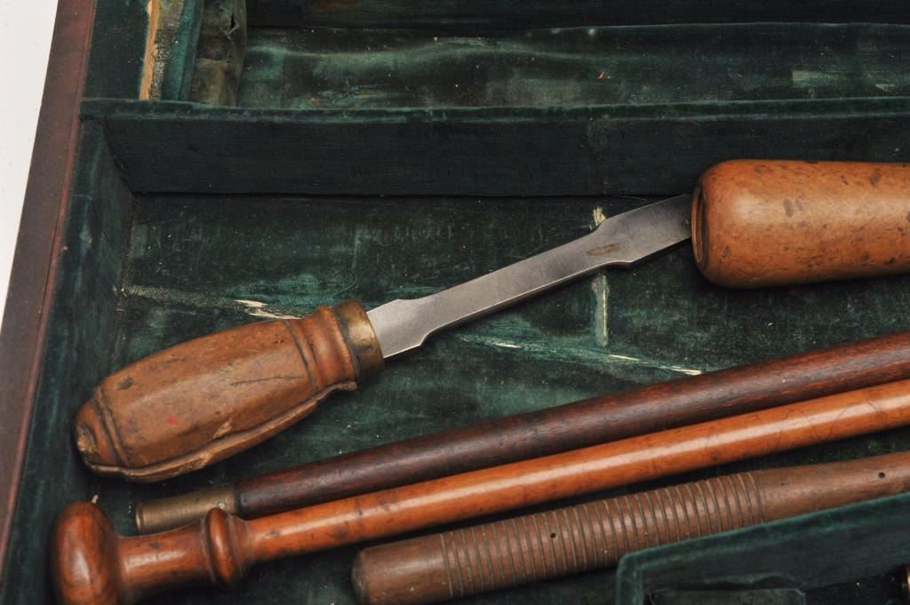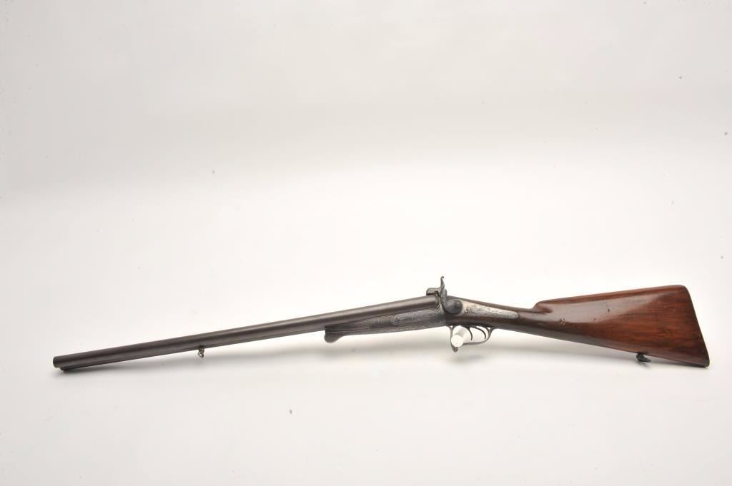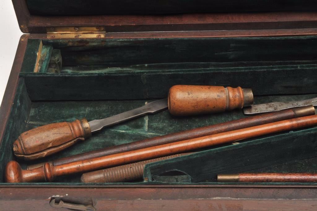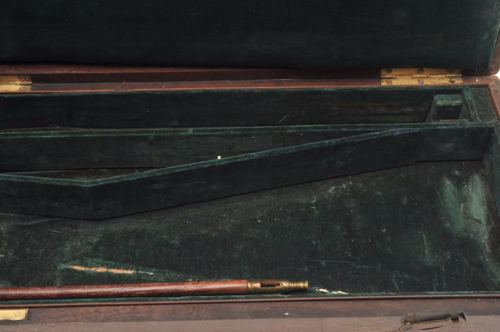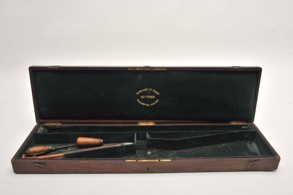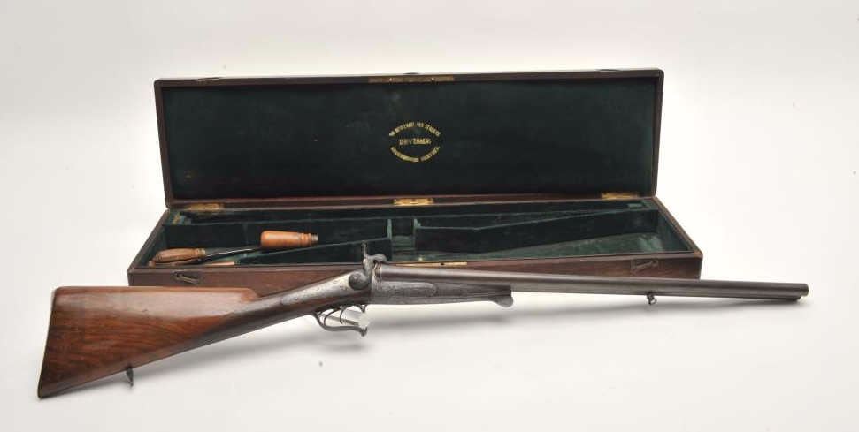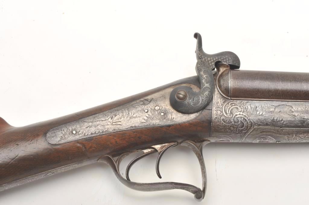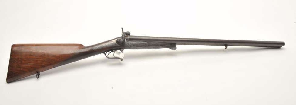 Lot 932 Devisme cased pinfire under lever SxS shotgun, 16 gauge, 24” Damascus barrels, engraved receiver,