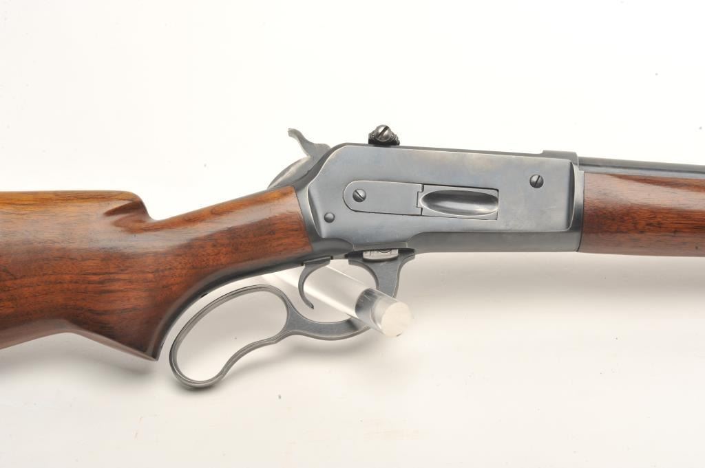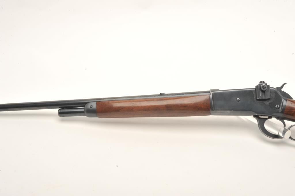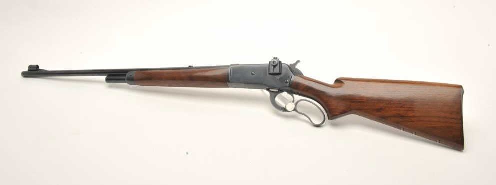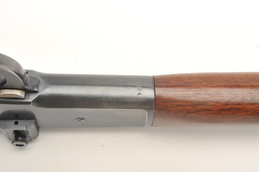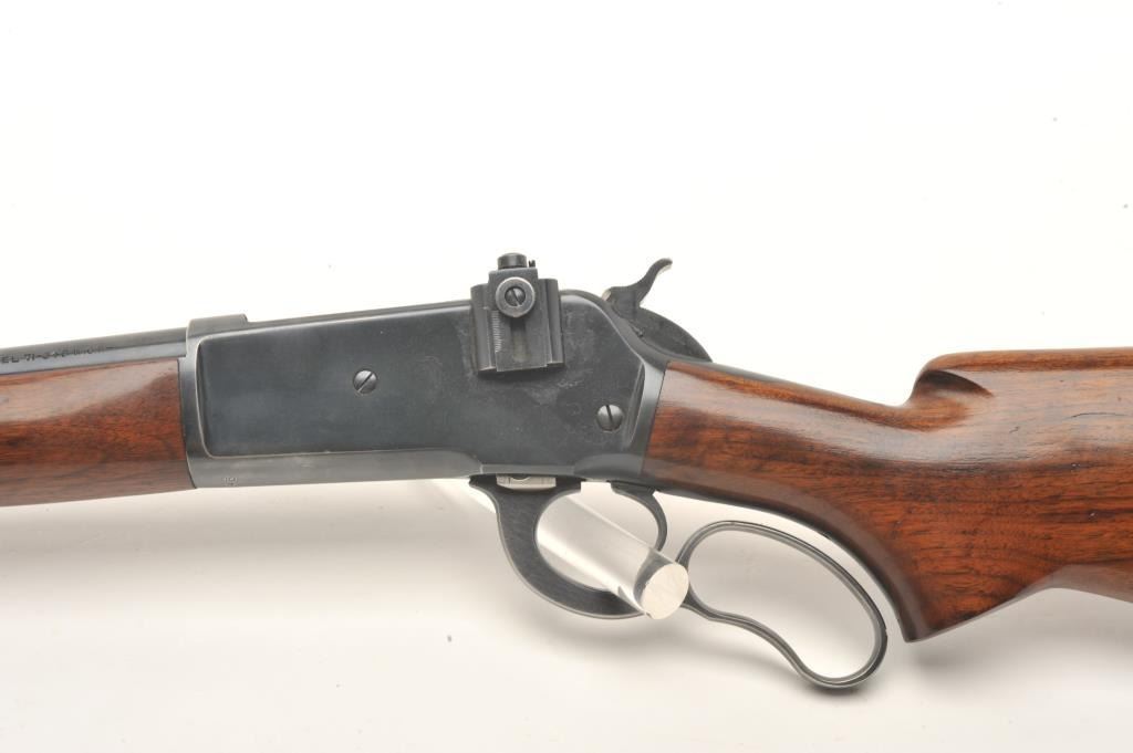 Winchester Model 71 lever action rifle, .348 caliber, 24” round barrel, Lyman receiver mounted rear sight and hooded front sight, blued finish, wood stocks, S/N 28343, in overall fine condition with a fine bore,crisp action, sharp markings and fine stocks. (C&R). Est.: $1,500-$3,000.