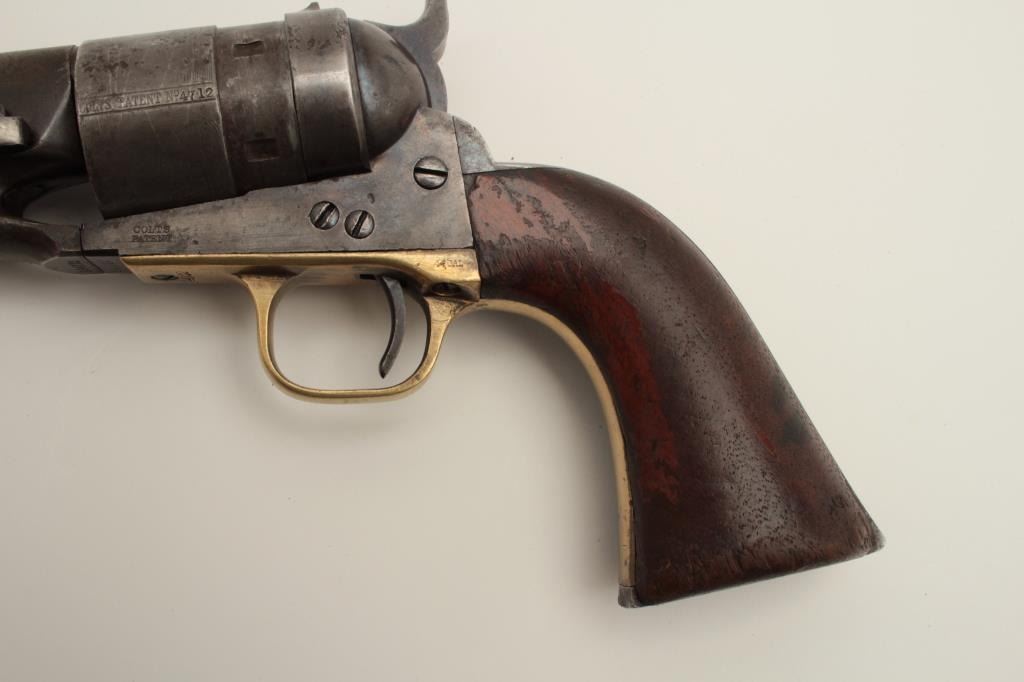Colt Richards Conversion of an 1860 Army revolver, .44 caliber, 8” barrel, ejector rod, blued and case hardened finish, wood grips, S/N 194712, in overall good to very good condition displaying a grey patina tobarrel assembly, hints of original case colors on frame, majority of cylinder scene visible, matching visible numbers, grips are fair to good with wear, knackering at the bottom of grips and small old chips at 3corners; tight action, good markings. (Antique). Est.: $1,250-$2,500.