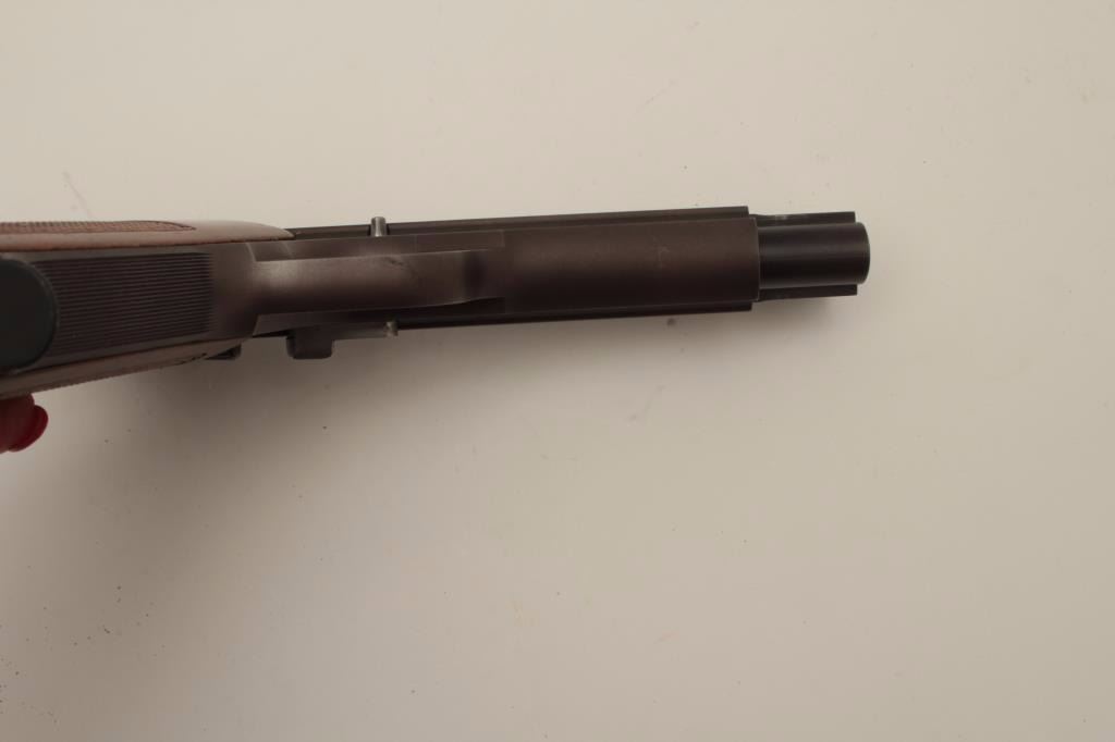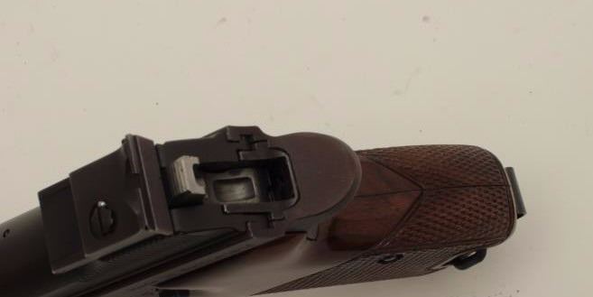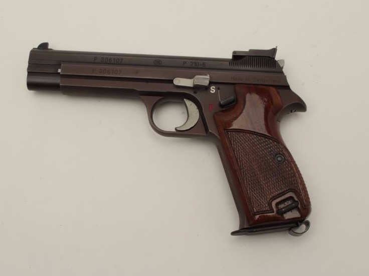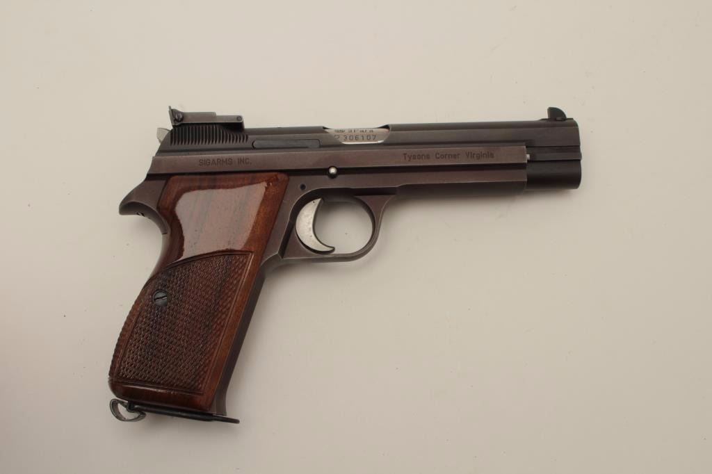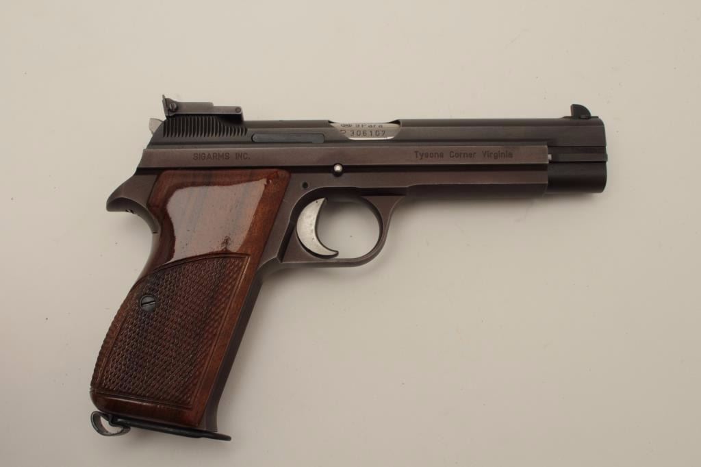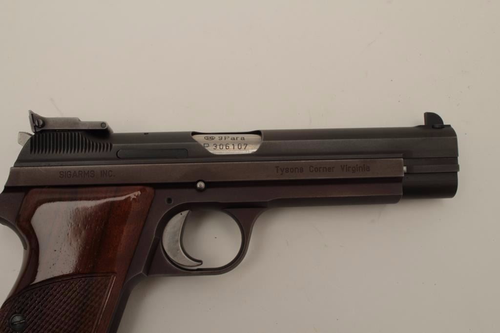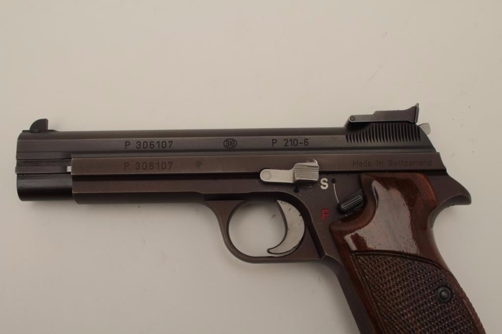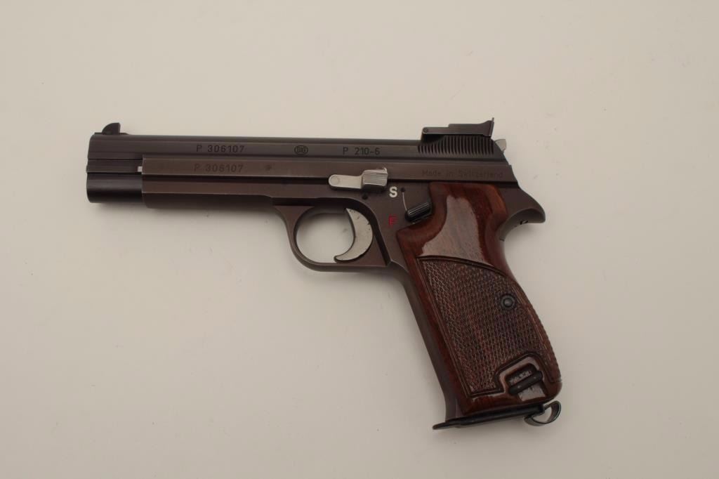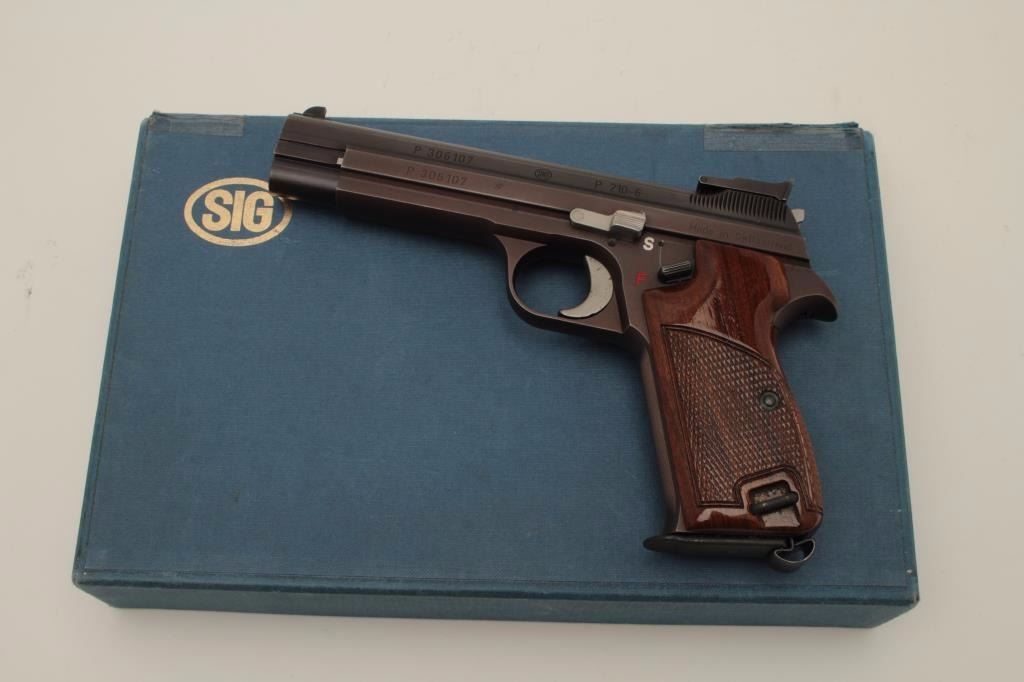 Sig (Swiss made) Model P210-6, 9MM Semi-Auto Pistol, S/N P306107. In original box with 1983 dated test target. Shows adjustable rear sight and wood grips along with extra neoprene grips. The frame has drifted to a“Plum” color and the pistol is very good plus used condition. Hard to find and desirable as they are considered among the finest of semi-auto pistols. (Modern/PPT) Est.: $1500-$3000