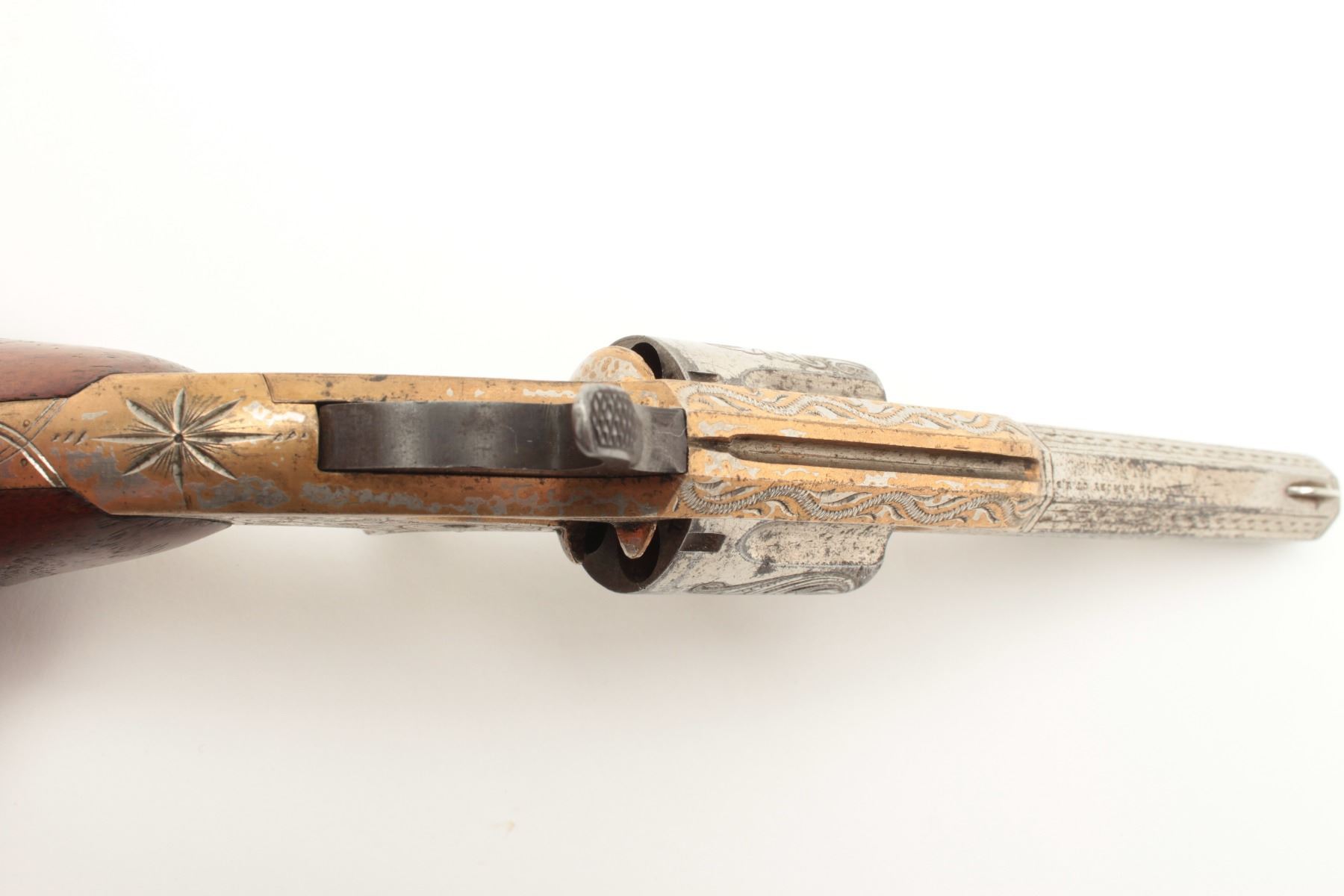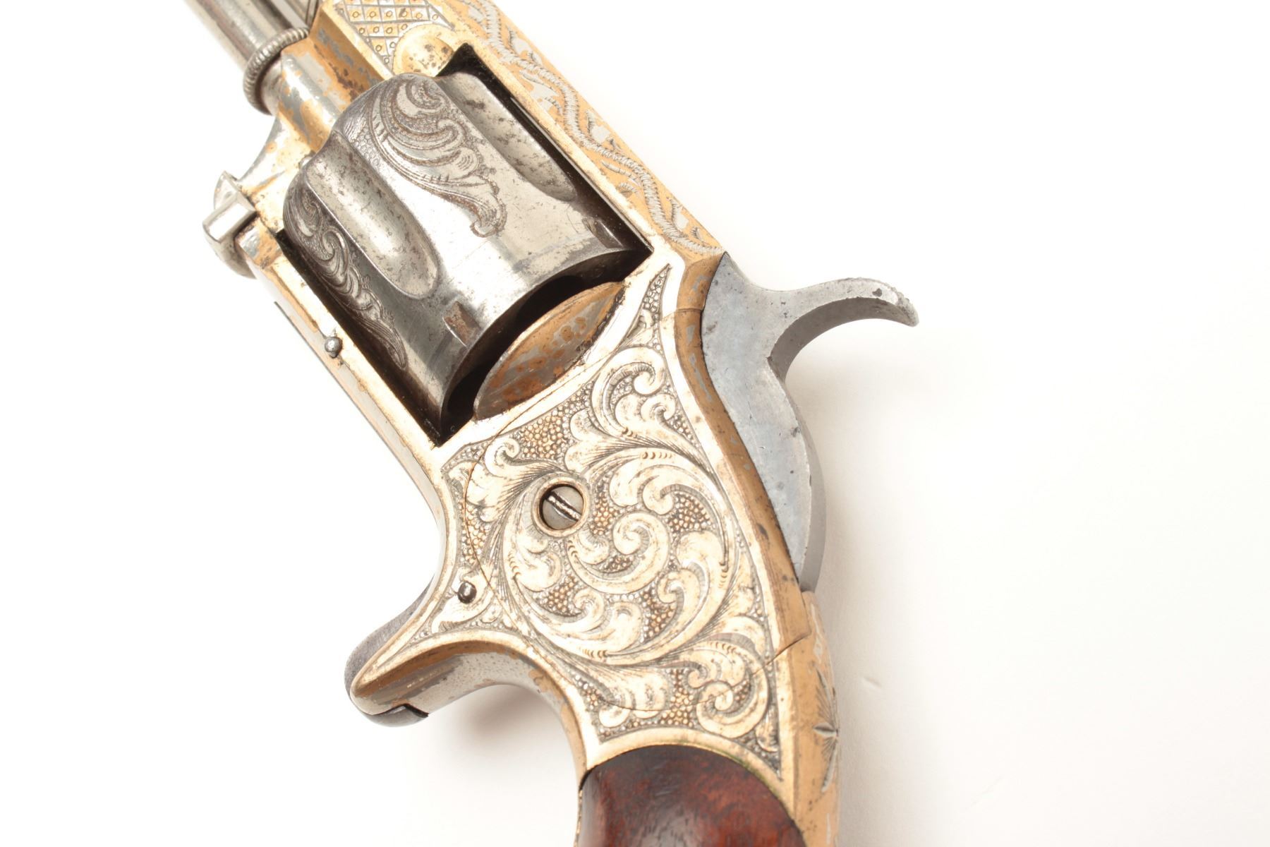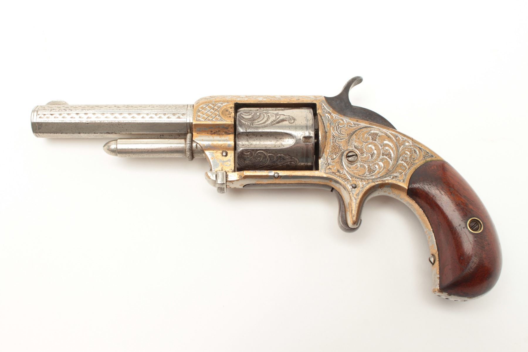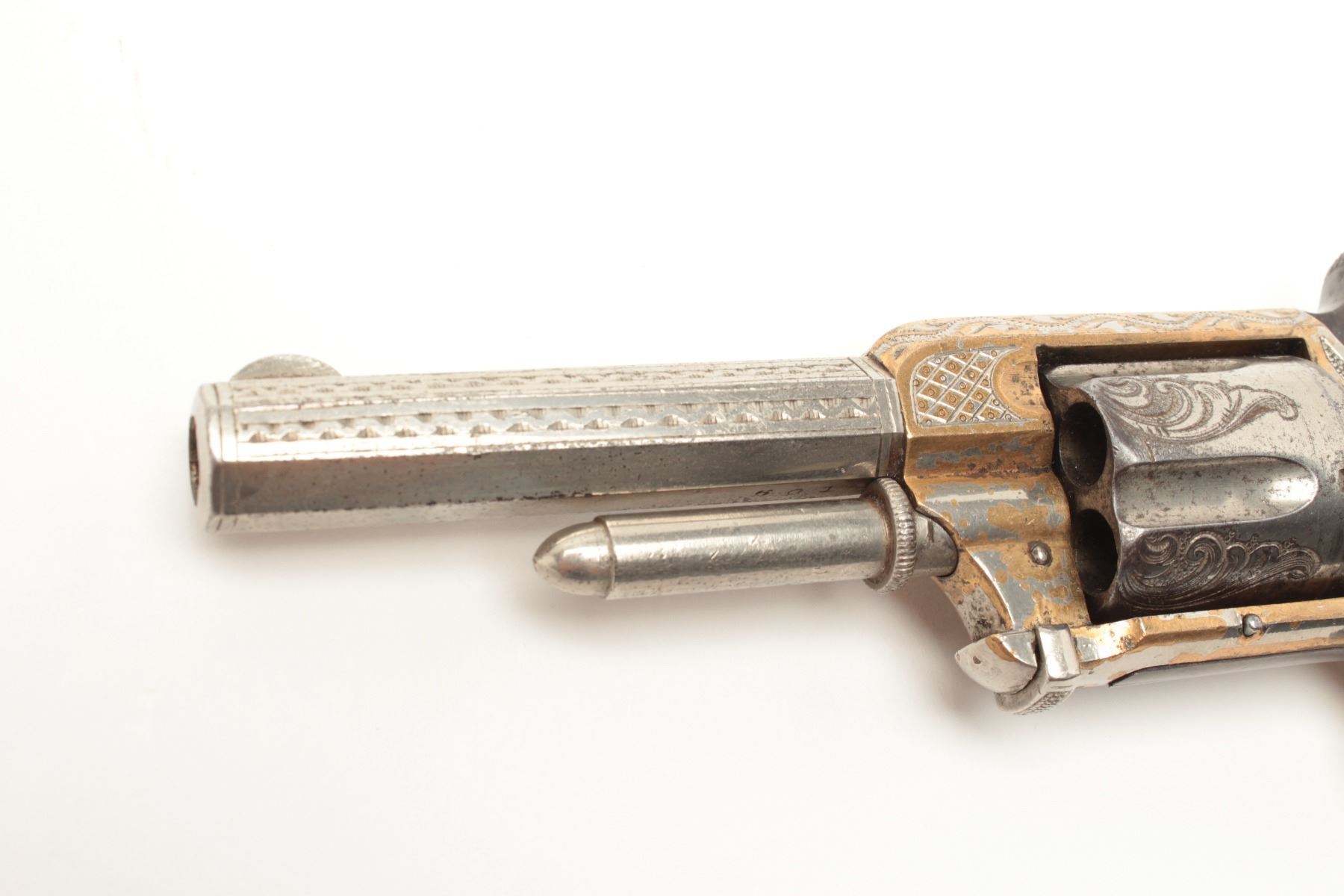 Lot 955 Whitneyville .32RF caliber spur trigger revolver, 3.25” octagon barrel, fully engraved, nickel fin